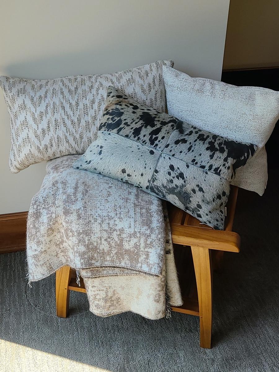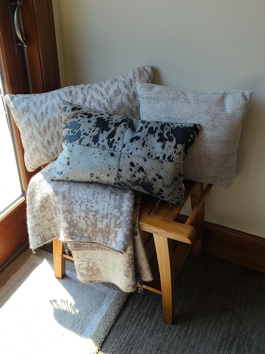 Three pillows and accent throw. Bench not included. Please see all pictures as they are the best representation of the items in the lot, the condition of the lot, and will show measurements if taken. If purchasing furniture you must be able to move yourself with your own help, and truck.