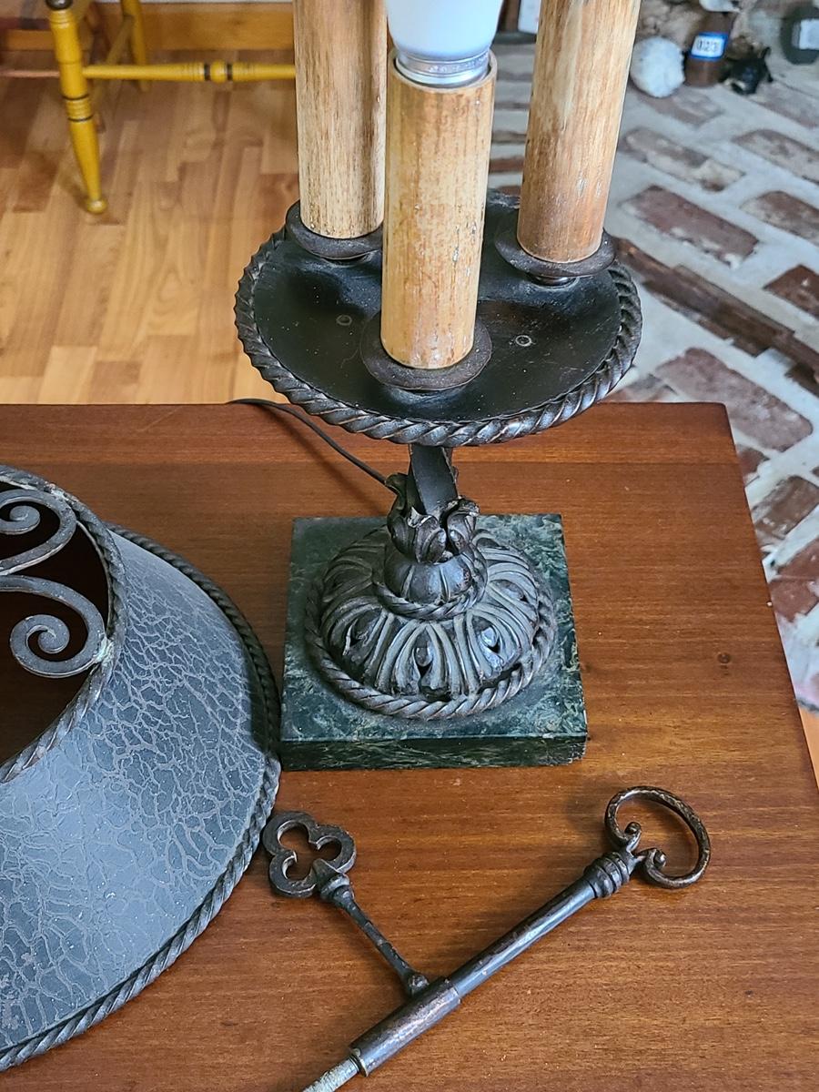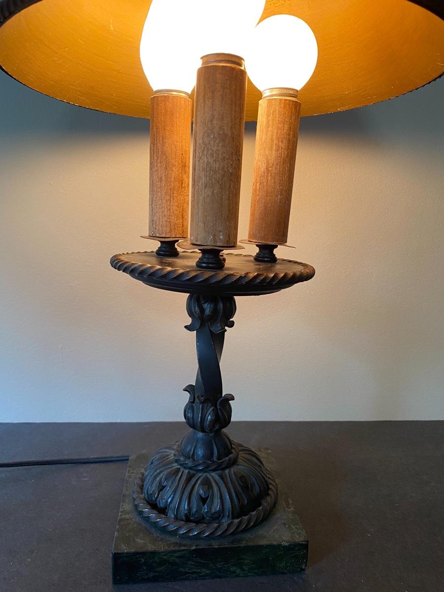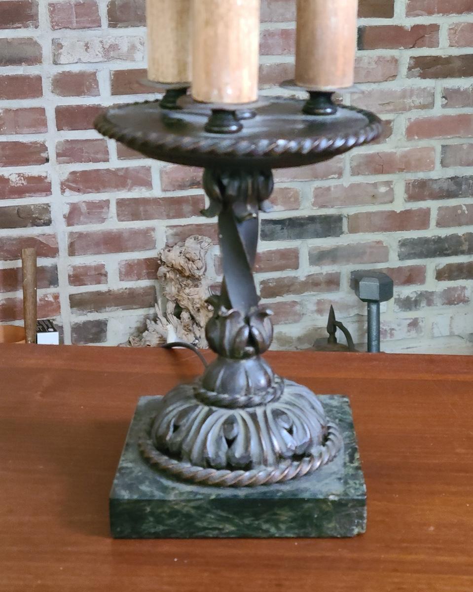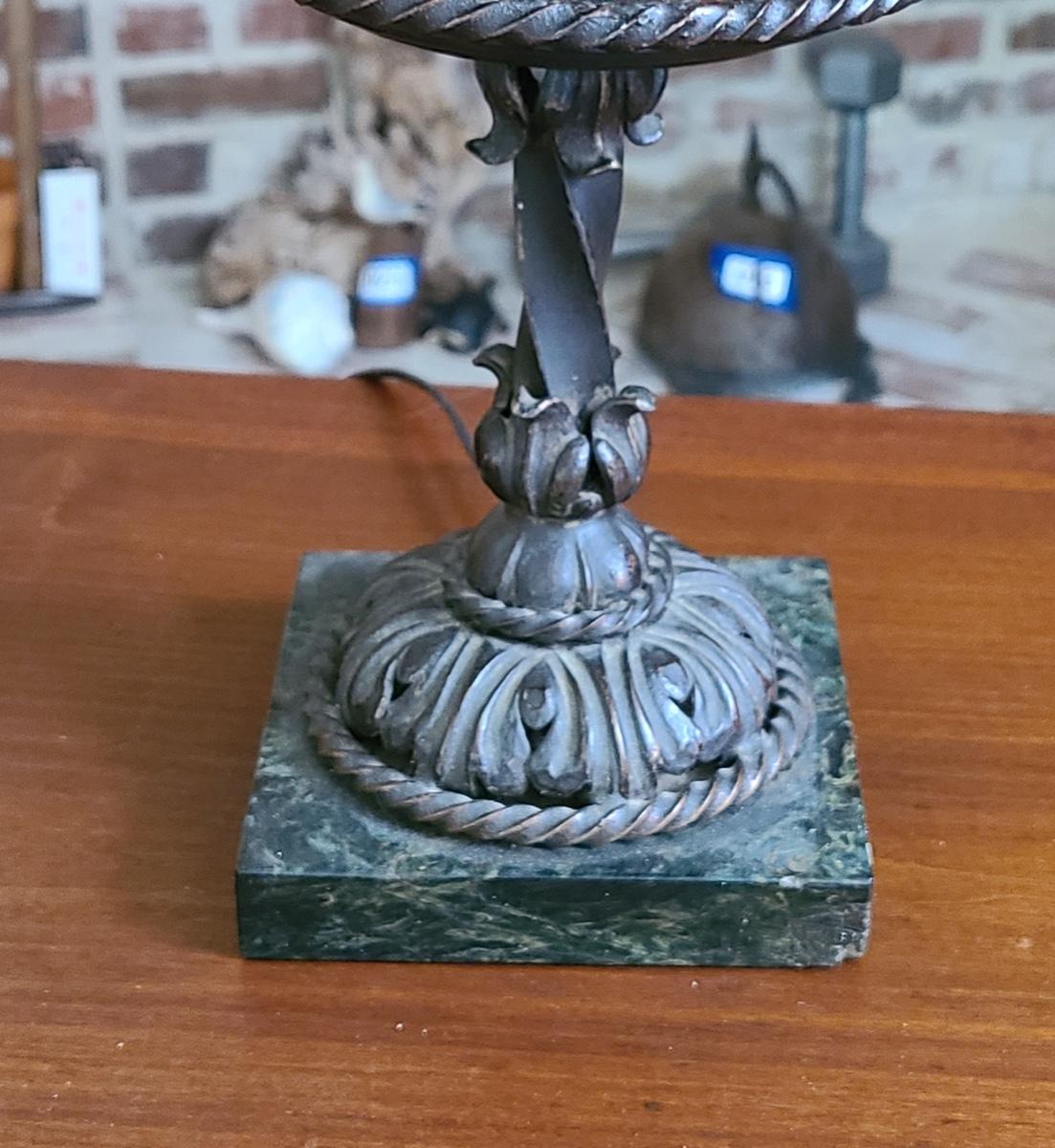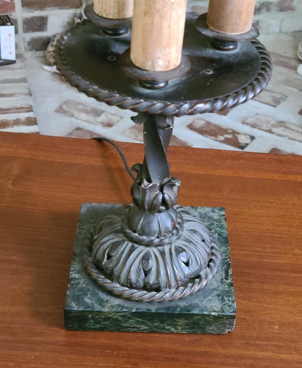 Lot 55: Antique Candlestick Lamp with Cast Metal Scrollwork Shade & Green Marble Base