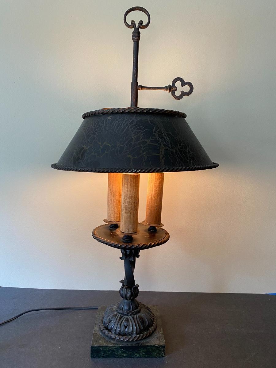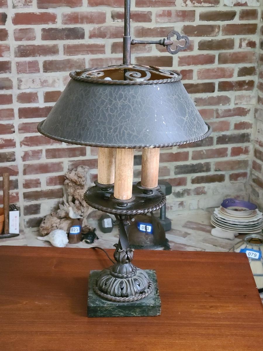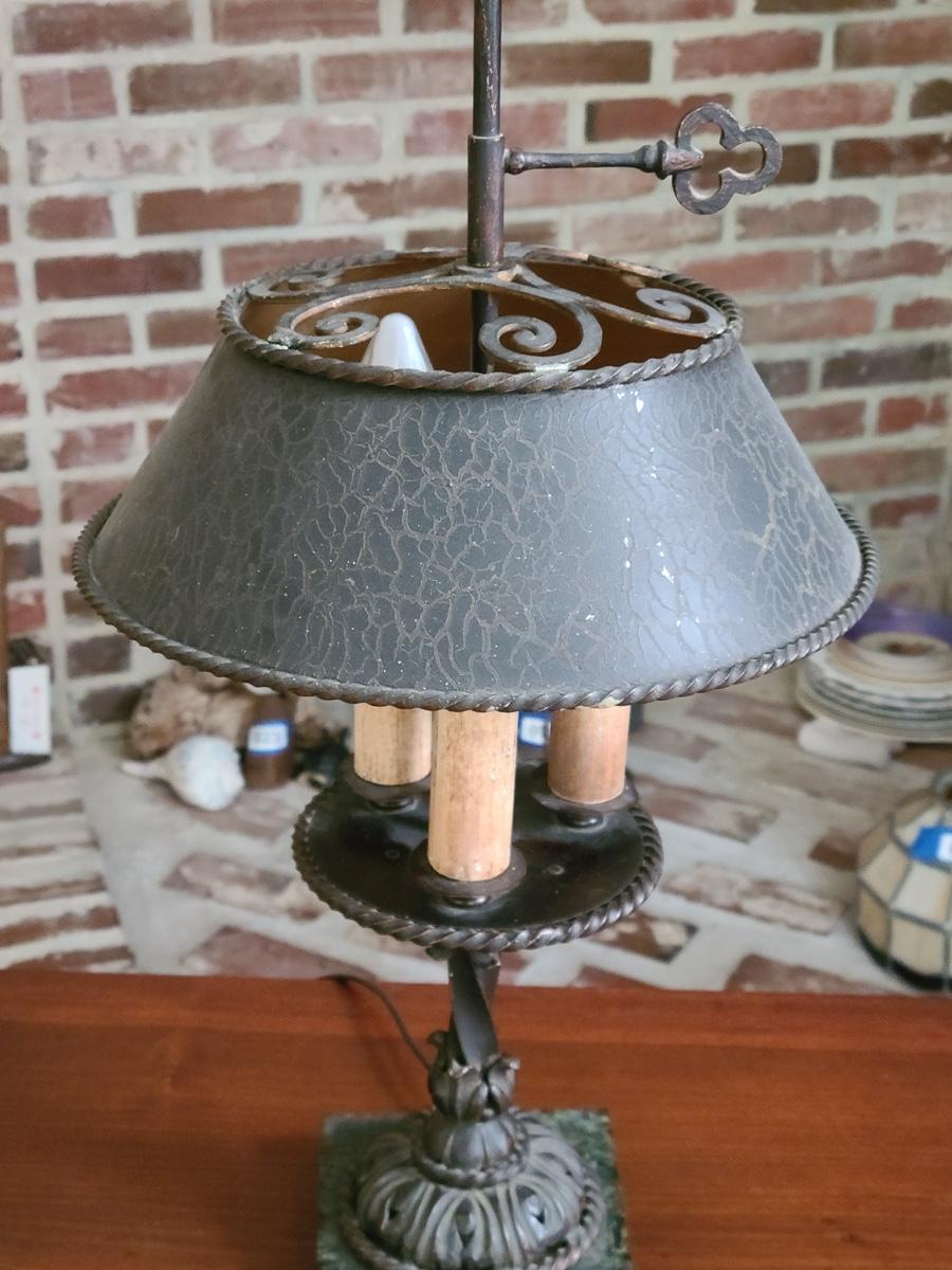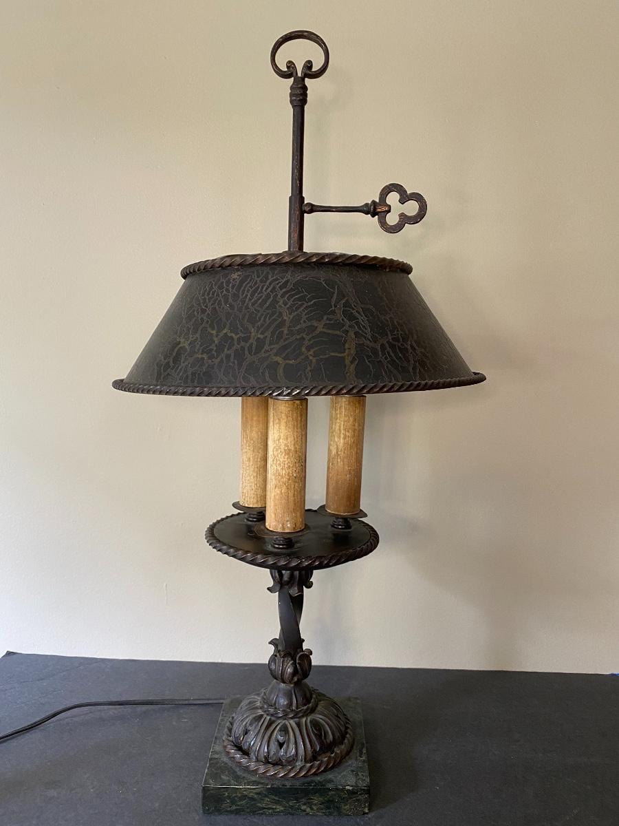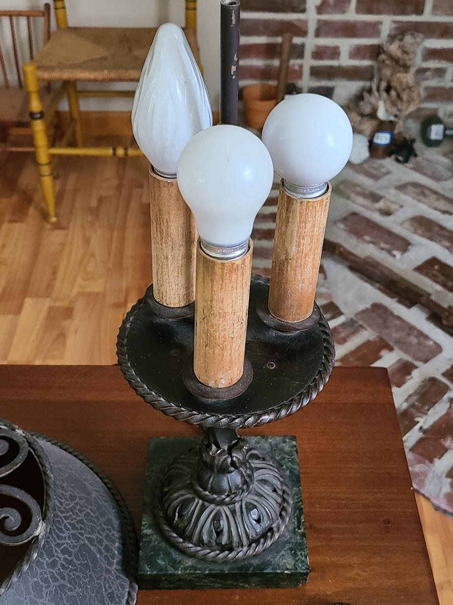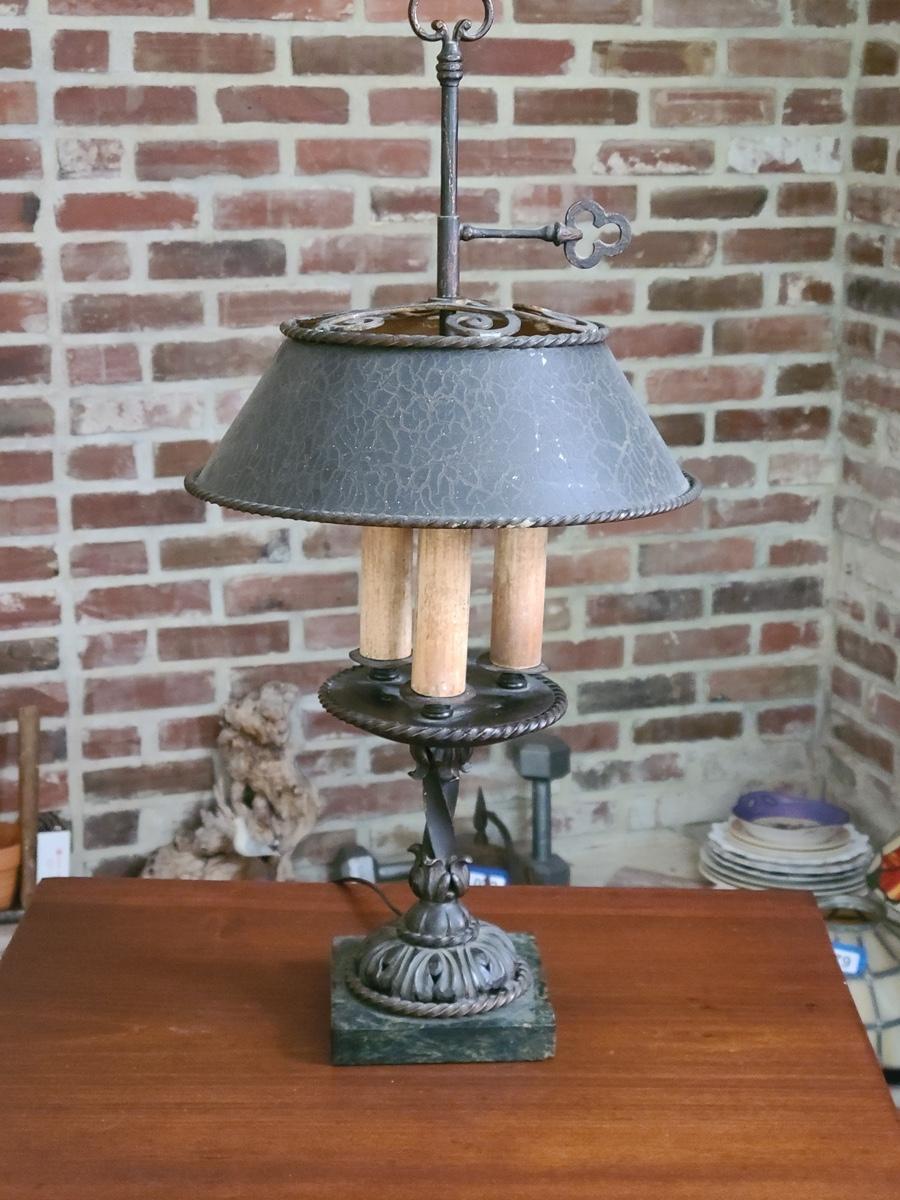 Lot 55: Antique Candlestick Lamp with Cast Metal Scrollwork Shade & Green Marble Base