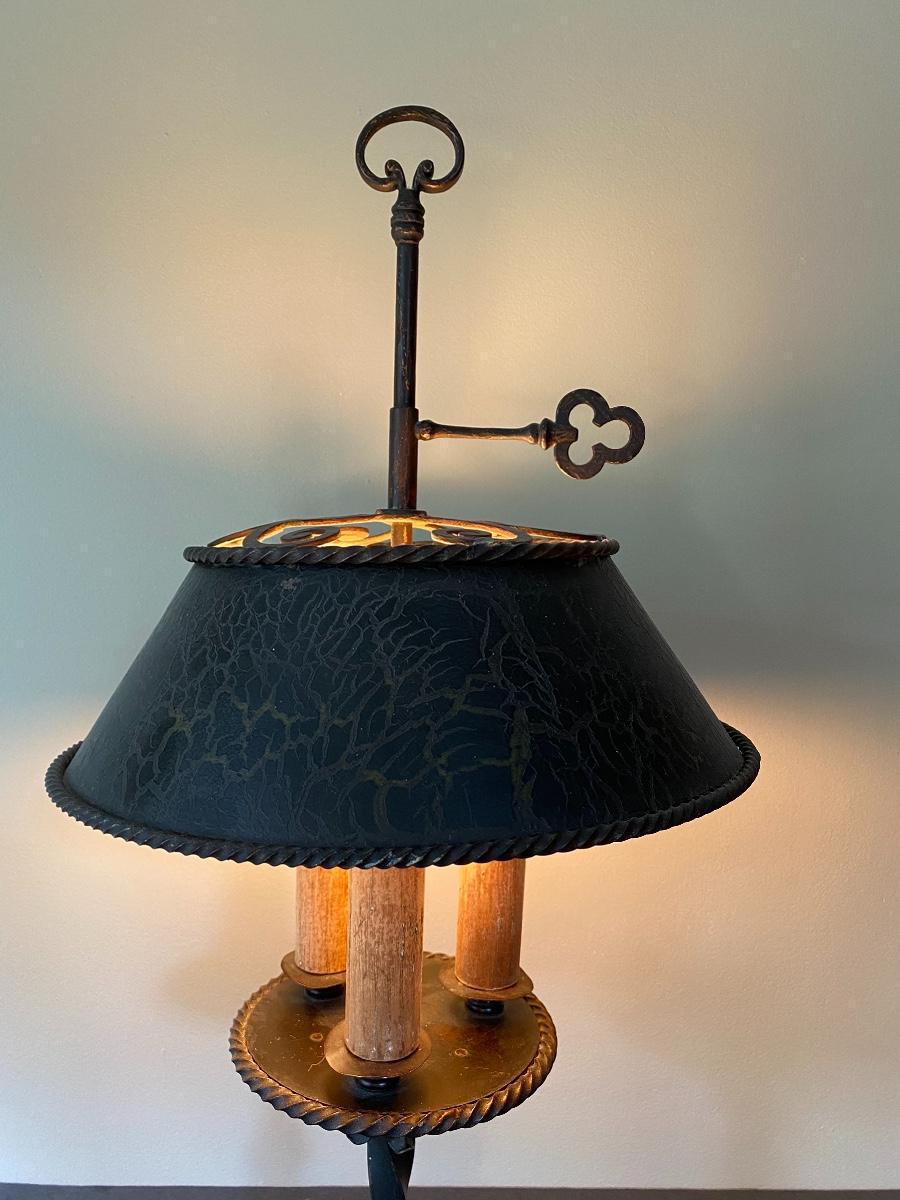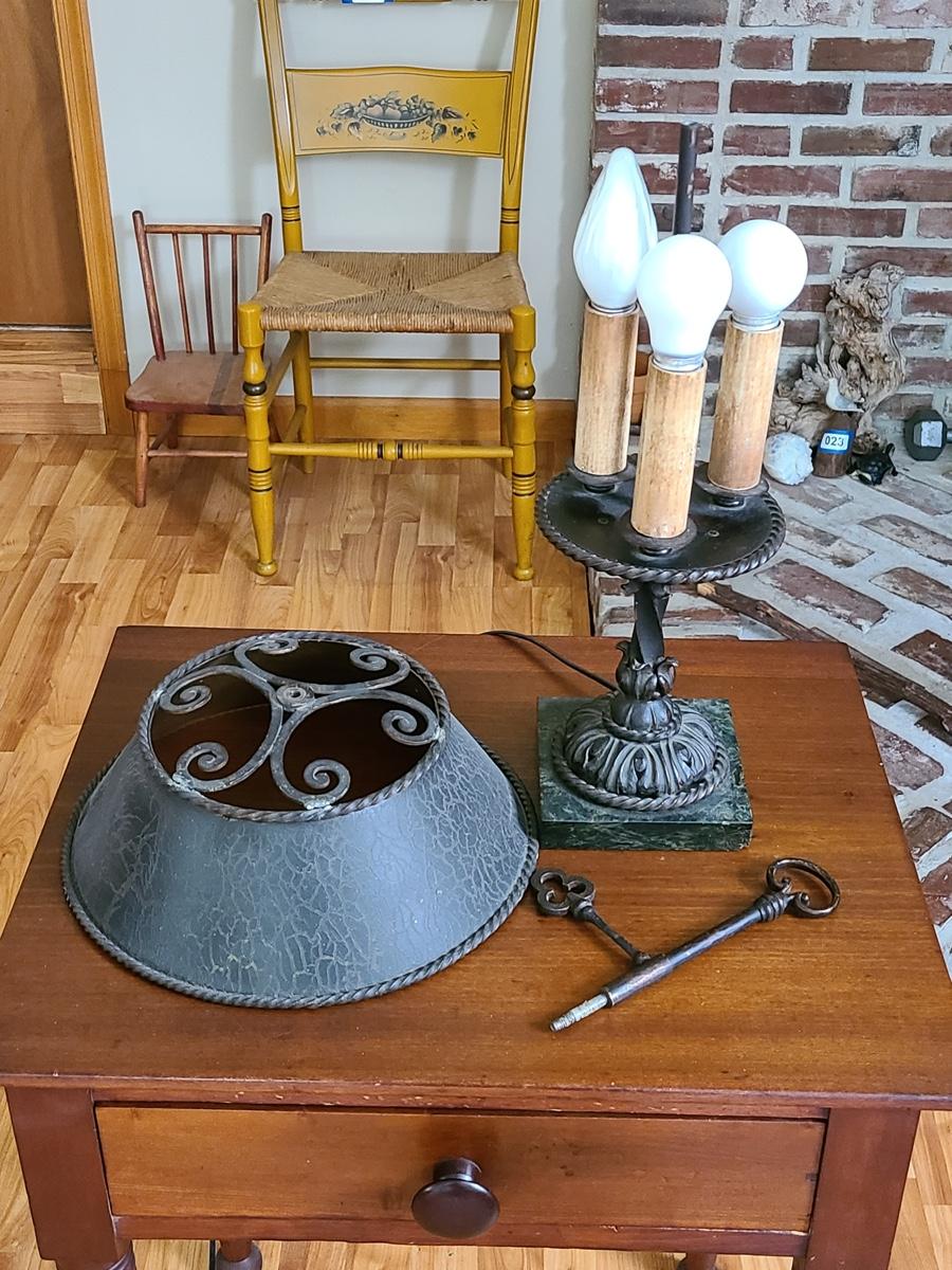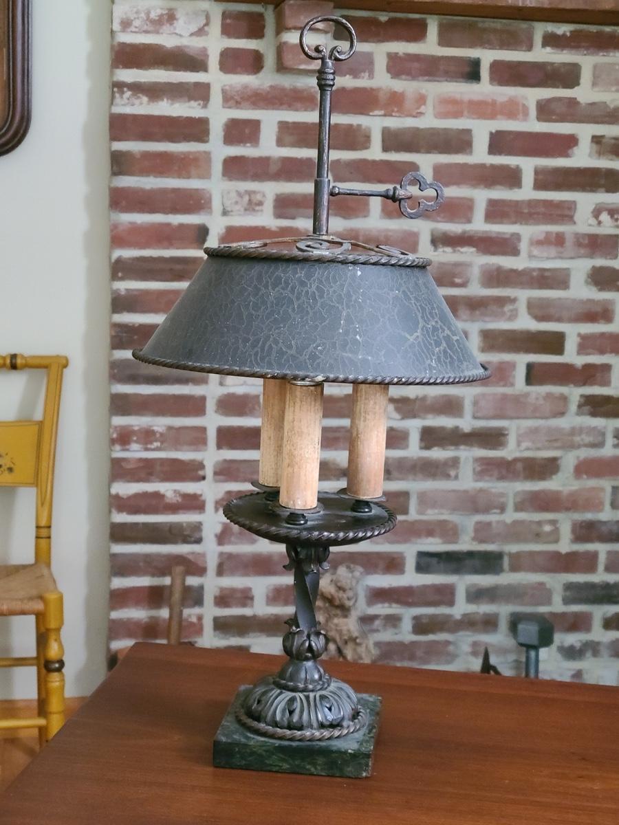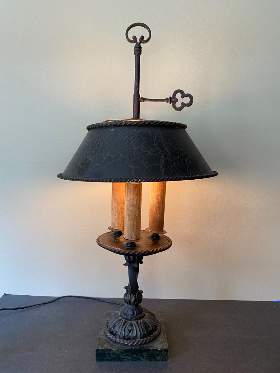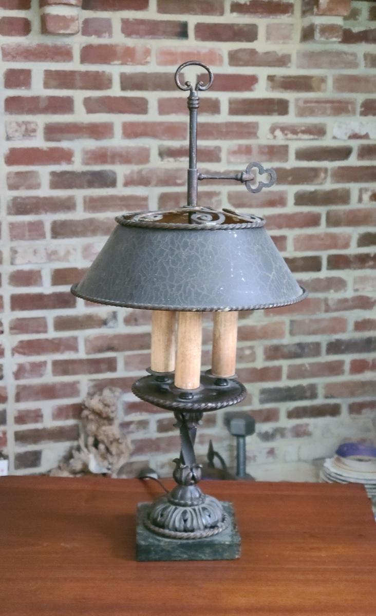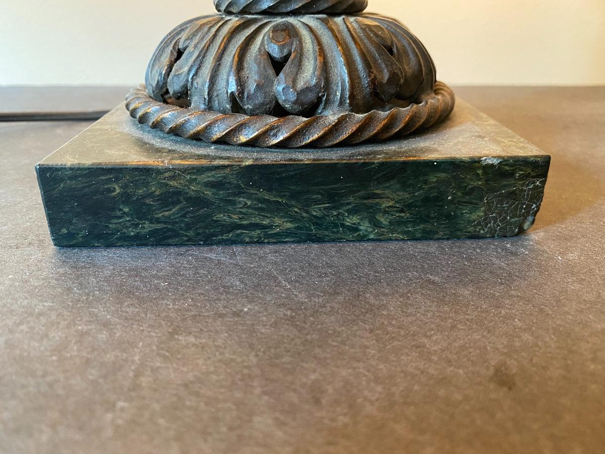 Lot 55: Antique Candlestick Lamp with Cast Metal Scrollwork Shade & Green Marble Base