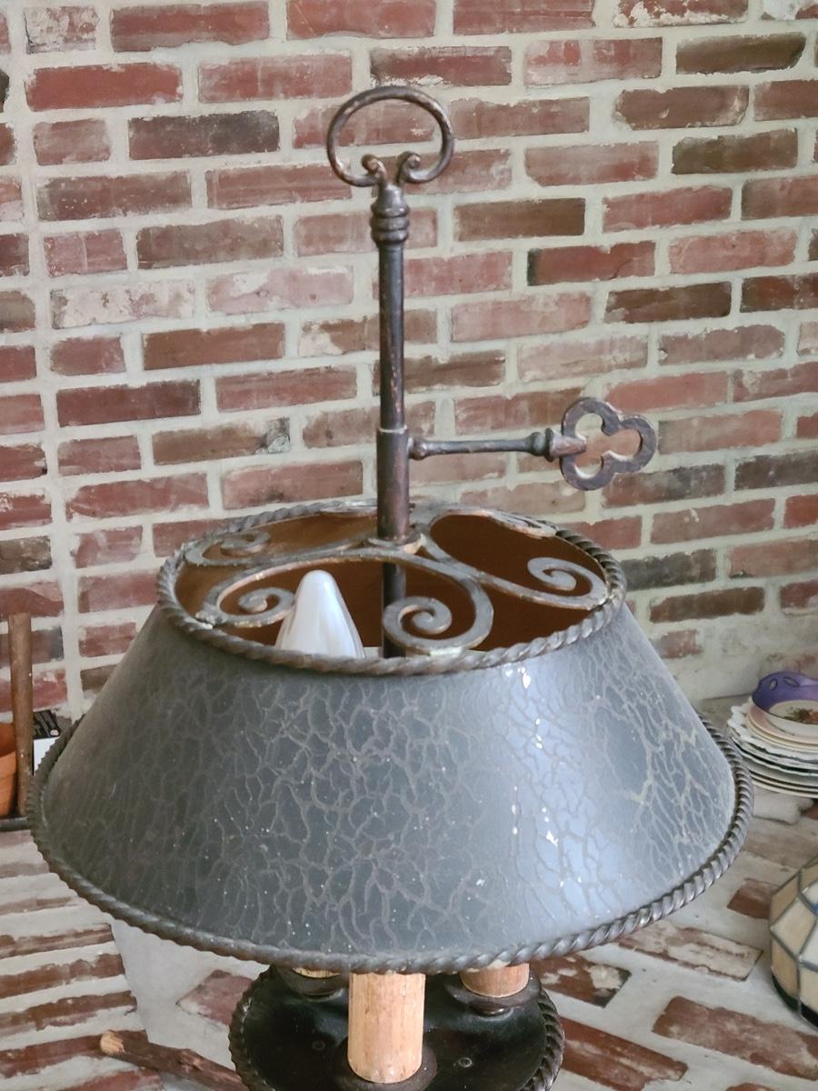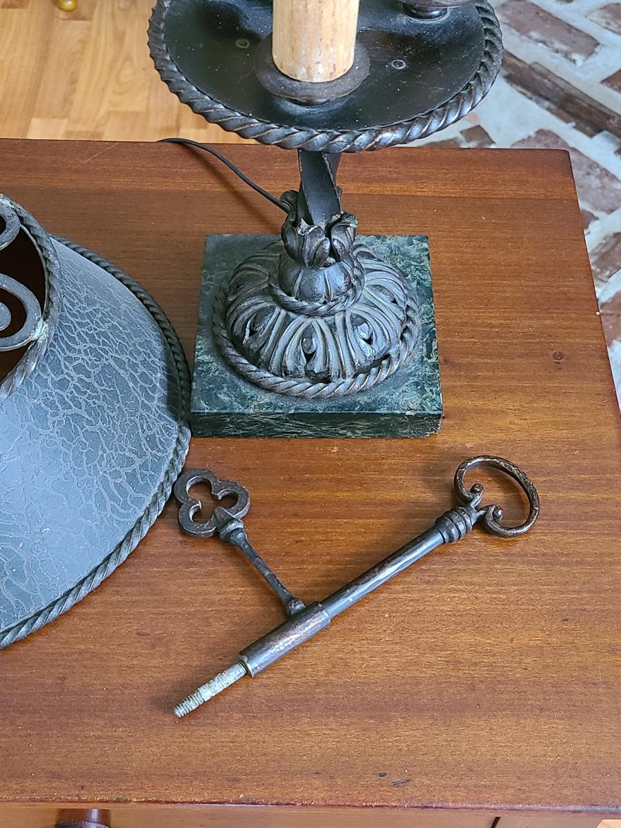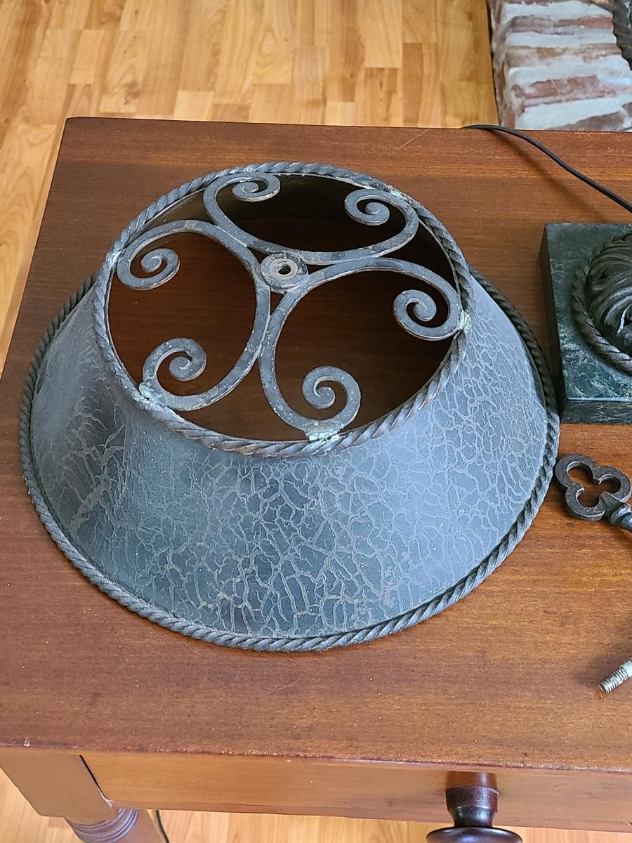 This looks to be an antique but is electric. The shade is metal and has gorgeous scrollwork on top with a green marble base. Functions and unique design! Please see all pictures as they are the best representation of the items. The pictures show condition, measurements if taken, and what is included in the lot. Due to the large amount that we photograph and the time frame, we are not always able to take measurements. All items unless noted, are pre-owned and have been used. If you purchased furniture, you must bring help. We do not allow one person to carry large furniture out on their own. Bring help, tools and a truck for the safety of our client’s homes, and your personal safety. Company policy. Thank you.