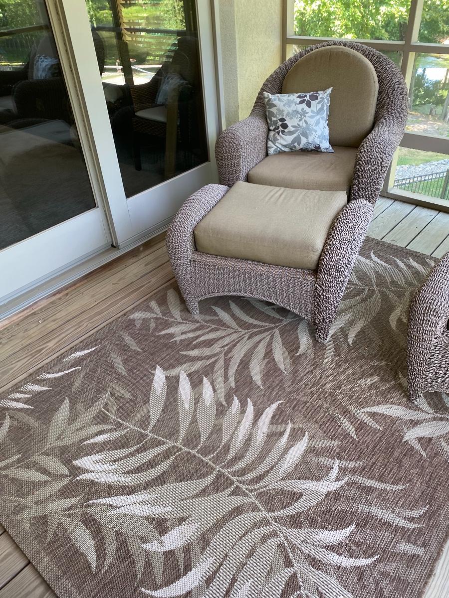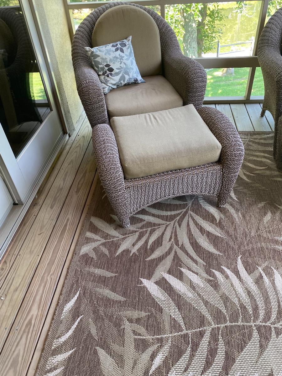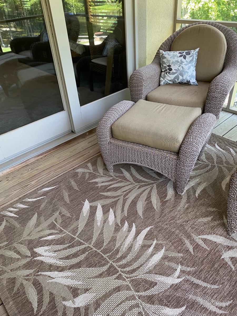 Chair and ottoman come with cushions and throw pillow. Outdoor throw rug is 5x7. Kept on covered patio so may need light cleaning. Please see all pictures as they are the best representation of the items in the lot, the condition of the lot, and will show measurements if taken. If purchasing furniture you must be able to move yourself with your own help, and truck.