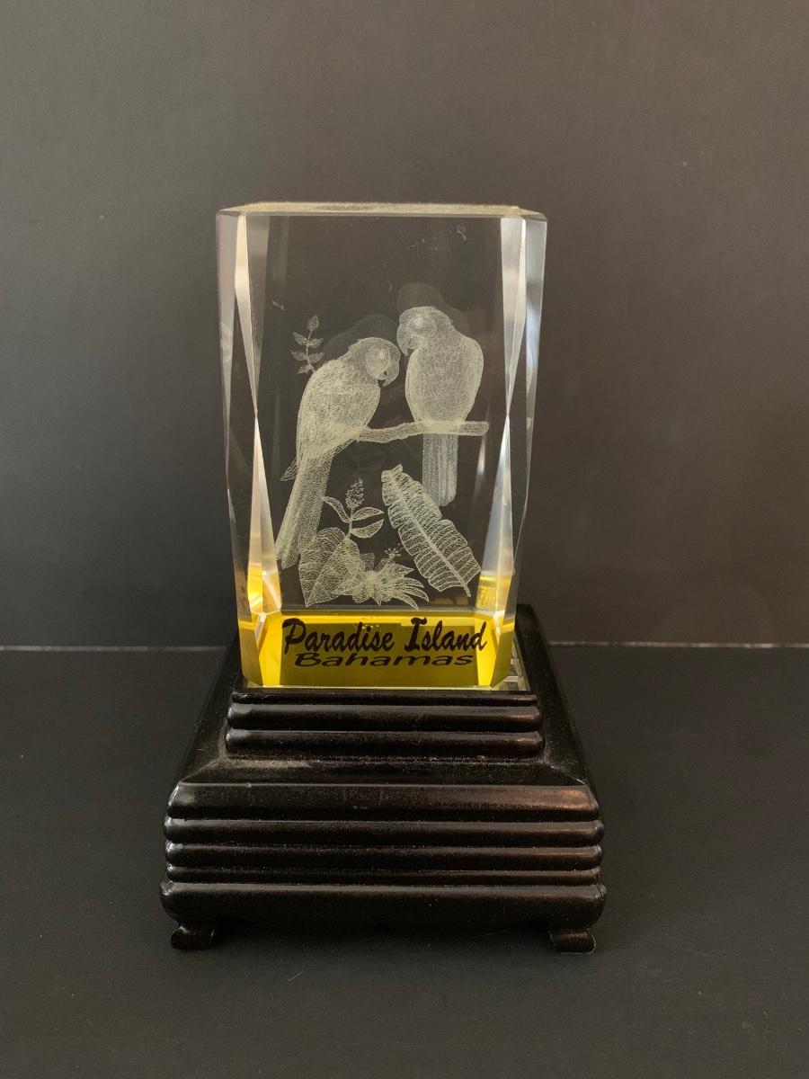 Crystal Glass 3D Laser Etched Cubes. Paper with Parrot design has a lighted lamp LED Base which is battery operated and untested.