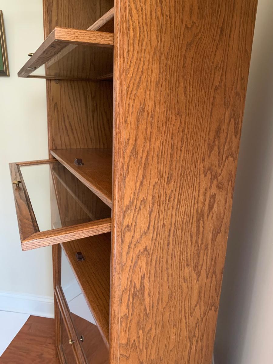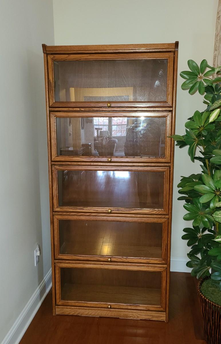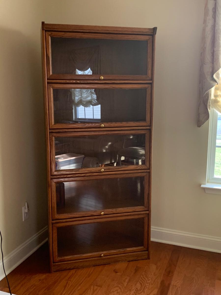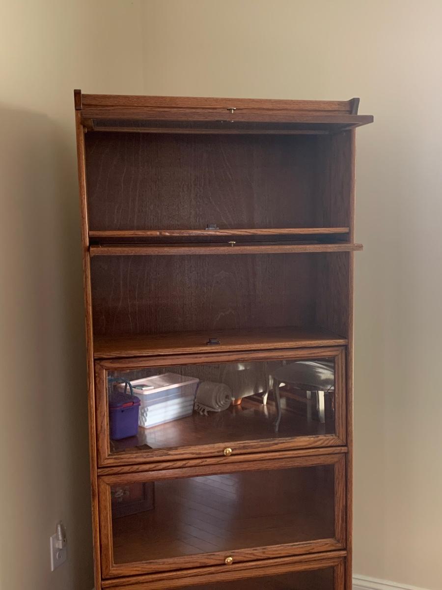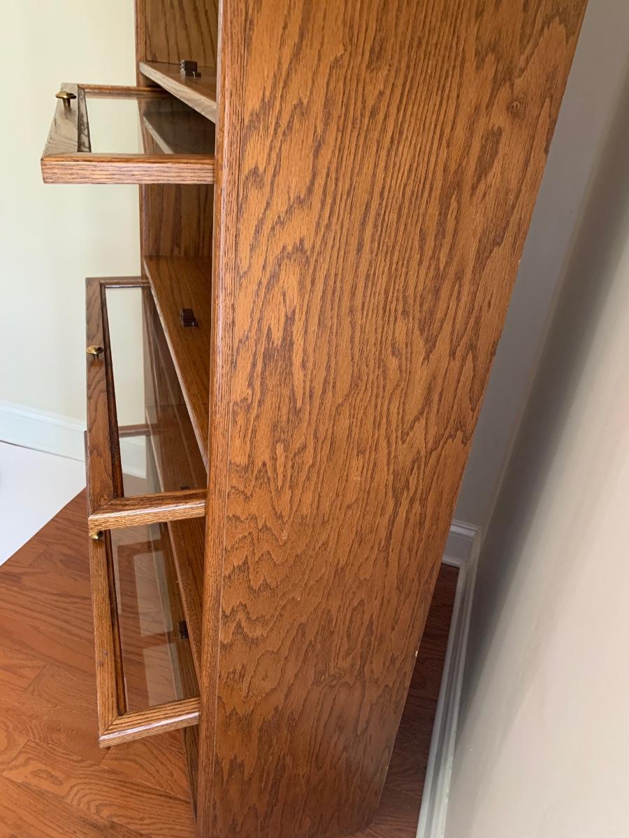 Oak finish Barrister bookcase 33 x 13 x 74. These is a mix of solid and pressed wood.