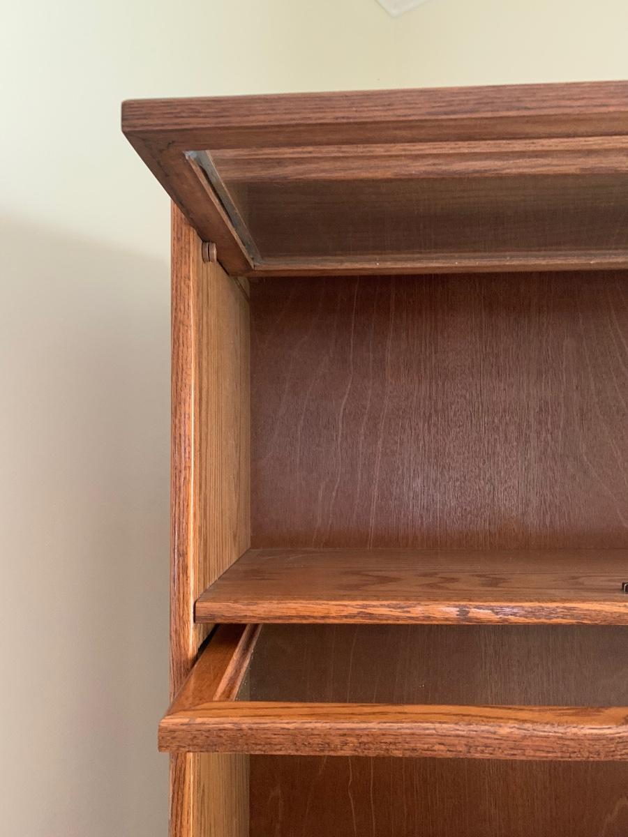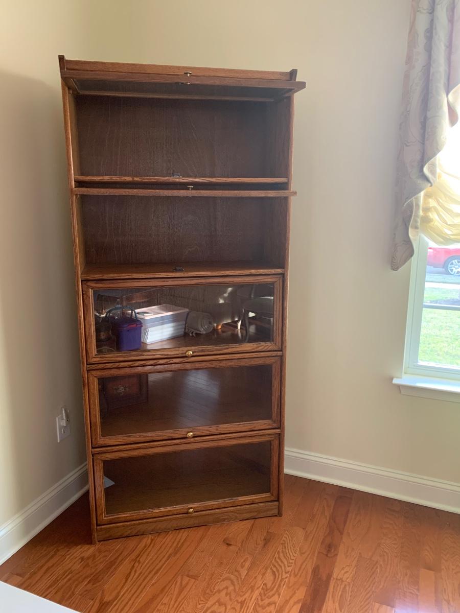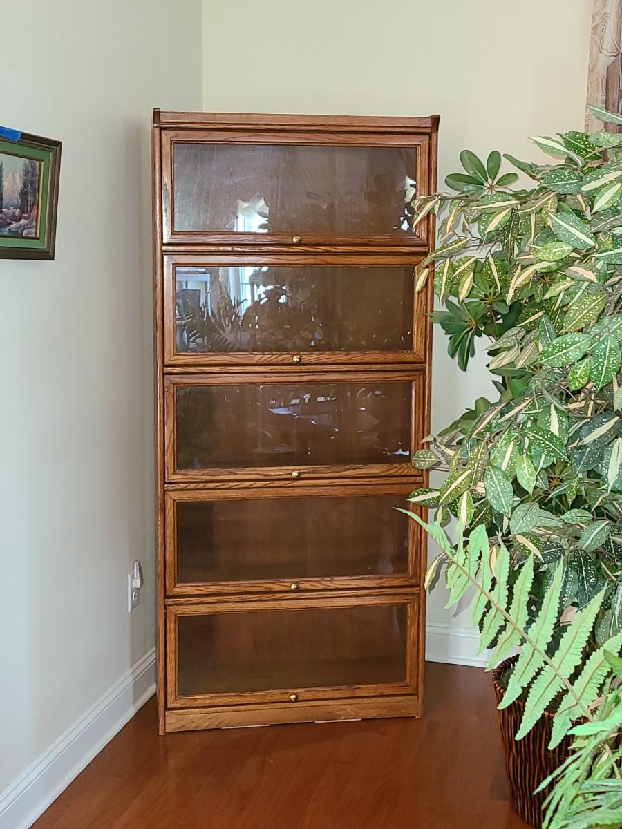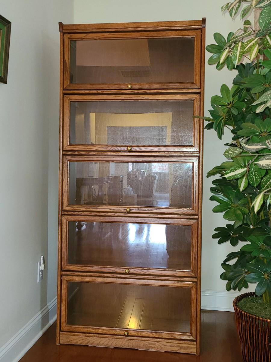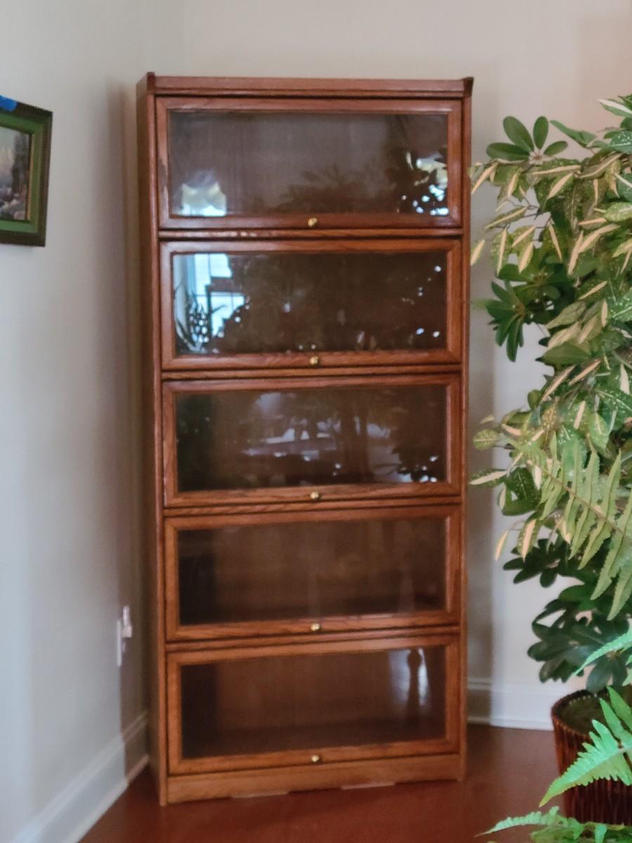 Oak finish Barrister bookcase 33 x 13 x 74. These is a mix of solid and pressed wood.