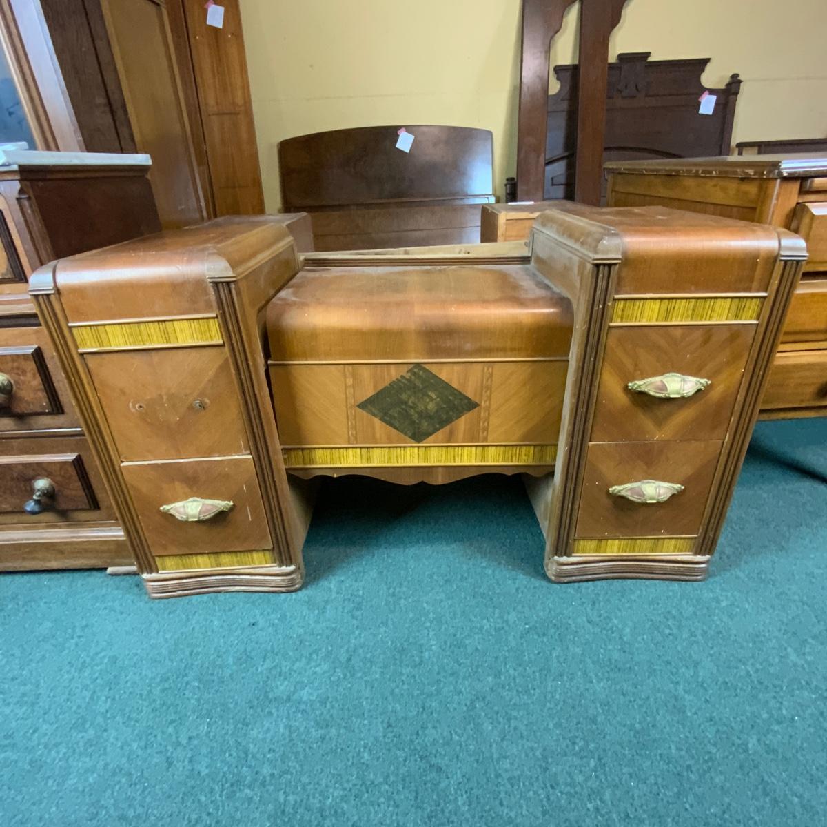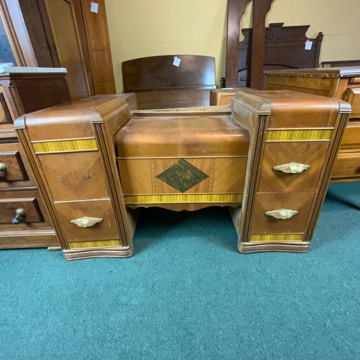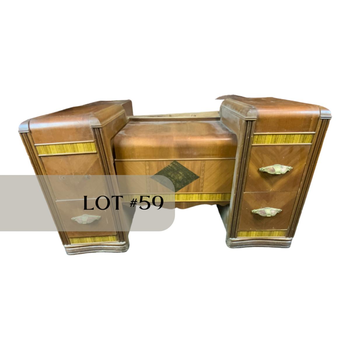 Art Deco Waterfall Vanity. Could easily be converted to two nightstands. Please see photos for details and condition. //::\\ Please see photos for details and condition. No attempt has been made to hide any imperfections. All items listed in this auction are warehouse items, and need to be cleaned. A majority of the items need restoration as well. All items are sold AS IS and WITHOUT GUARANTEE. If you are uncertain about an item, DO NOT BID. Due to the nature of this online auction in-person inspection is HIGHLY recommended. All Sales are FINAL. Pick Up Times are FIRM. Please confirm with your own schedule that you can pick up in the scheduled times listed in the Terms and Conditions. Any questions please message the auctioneer. DO NOT Contact The Harp Gallery.