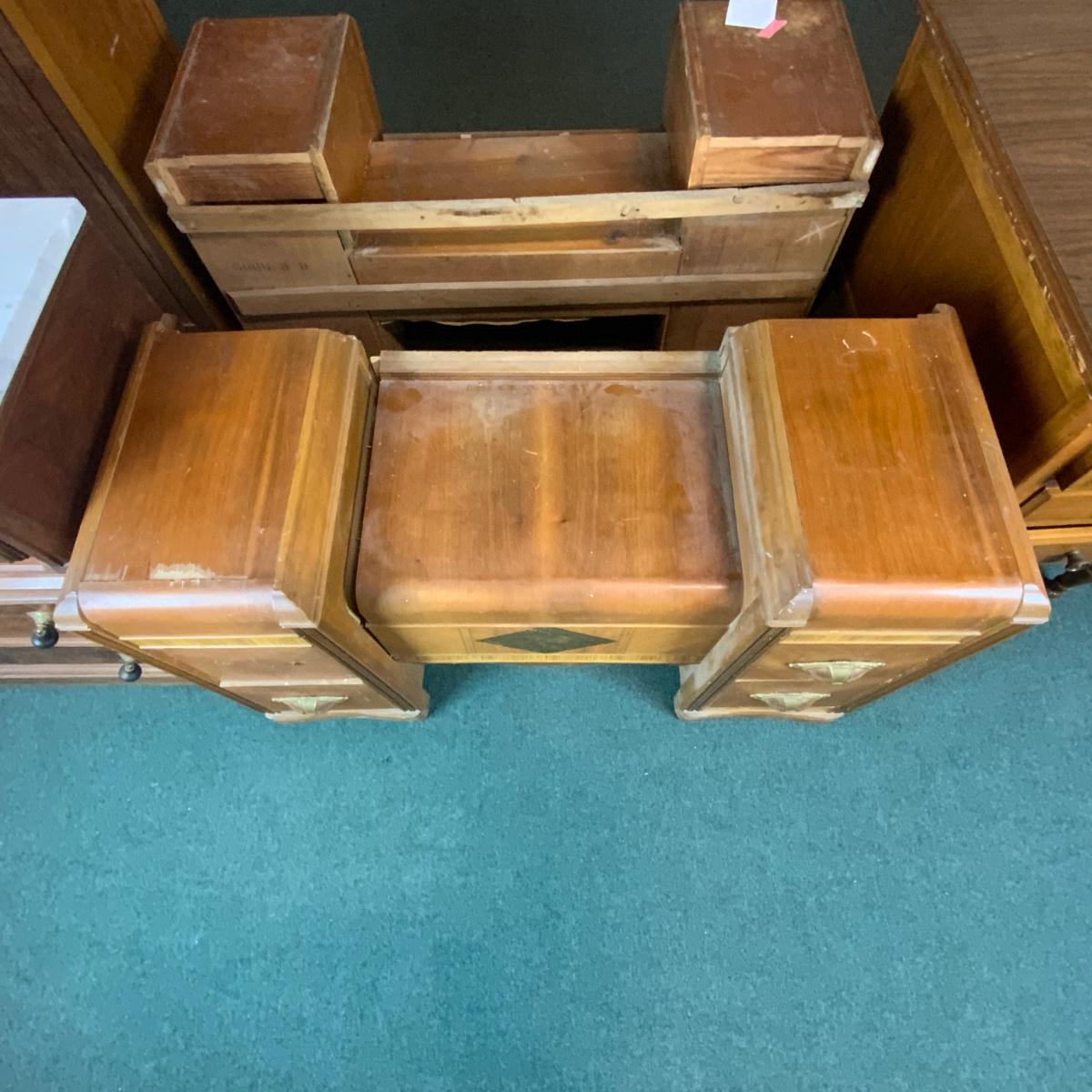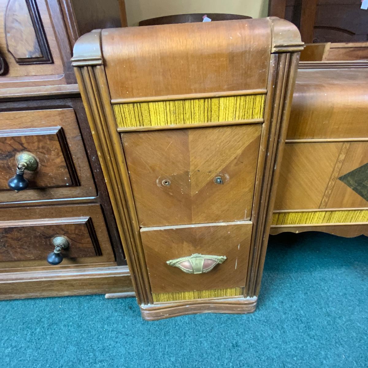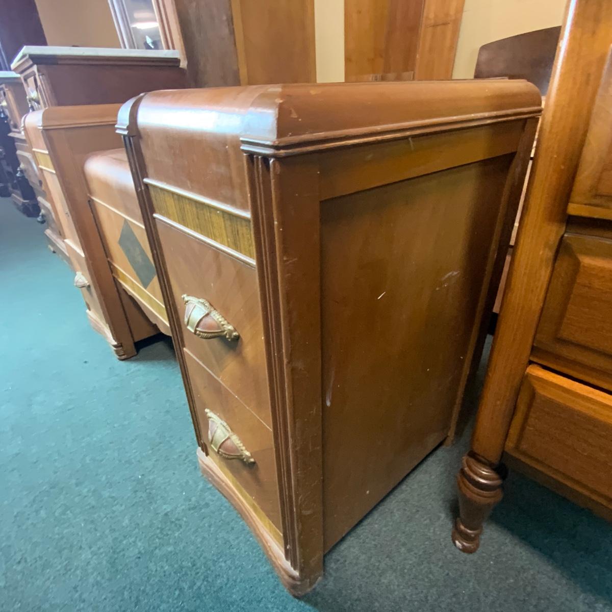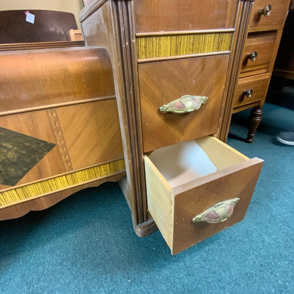 Art Deco Waterfall Vanity. Could easily be converted to two nightstands. Please see photos for details and condition. //::\\ Please see photos for details and condition. No attempt has been made to hide any imperfections. All items listed in this auction are warehouse items, and need to be cleaned. A majority of the items need restoration as well. All items are sold AS IS and WITHOUT GUARANTEE. If you are uncertain about an item, DO NOT BID. Due to the nature of this online auction in-person inspection is HIGHLY recommended. All Sales are FINAL. Pick Up Times are FIRM. Please confirm with your own schedule that you can pick up in the scheduled times listed in the Terms and Conditions. Any questions please message the auctioneer. DO NOT Contact The Harp Gallery.