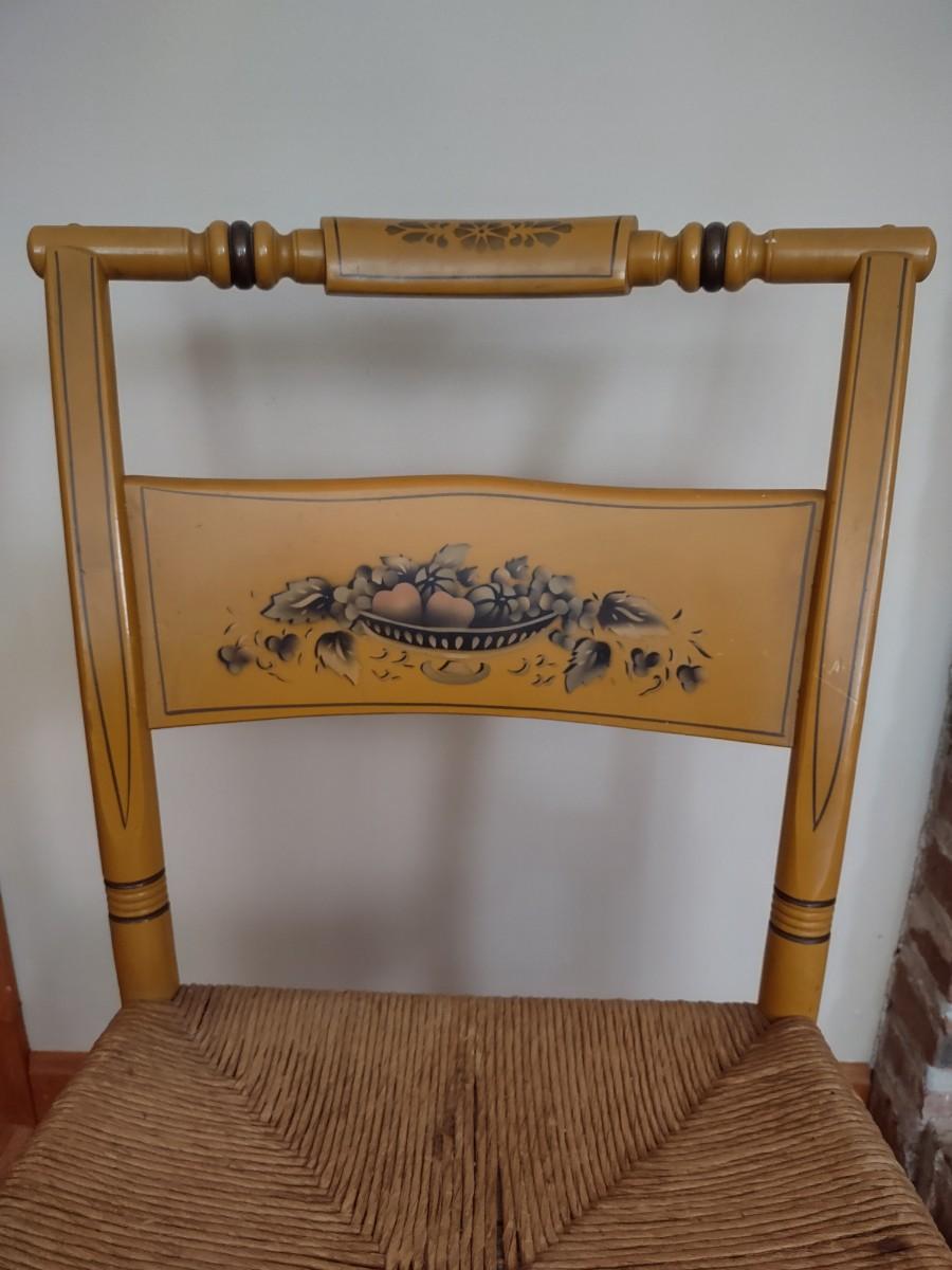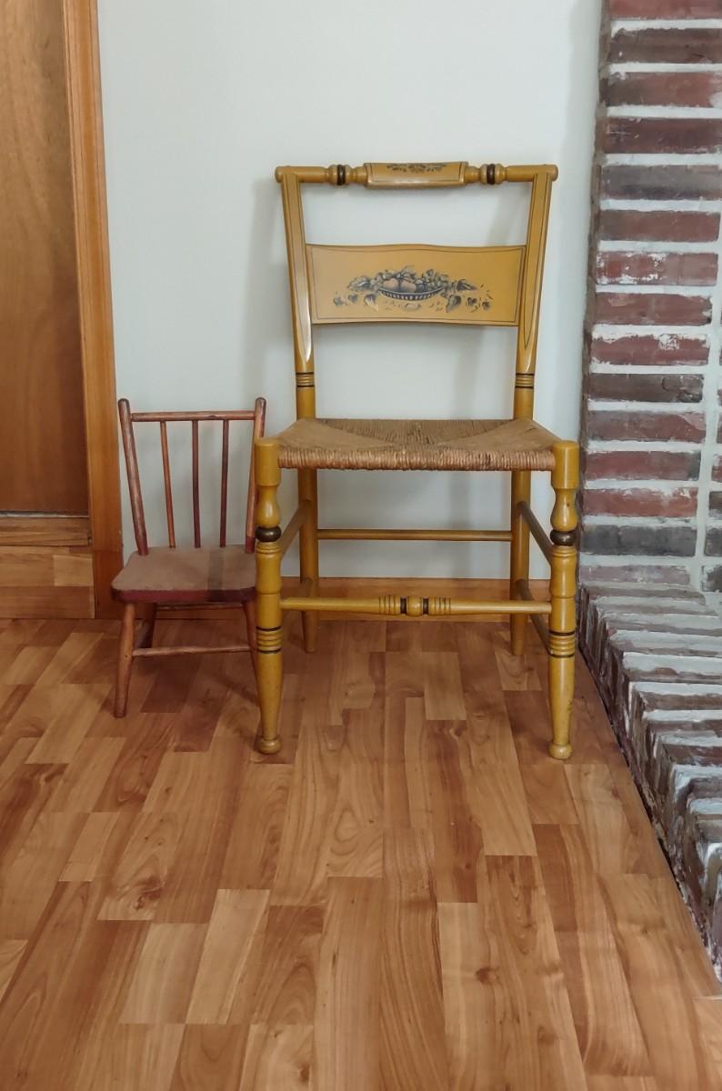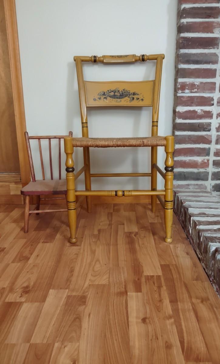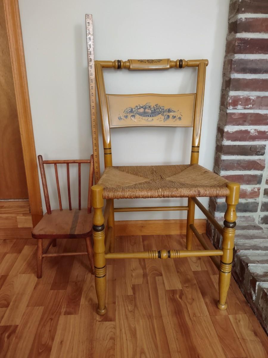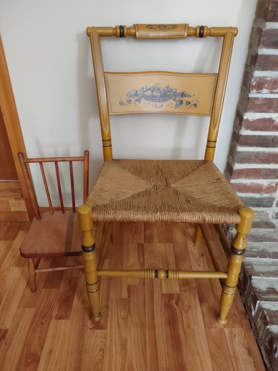 Two vintage chairs, one is doll-sized perfect for a patio or porch, and the other has a thatch seat with mustard yellow design, most likely a Hitchcock Chair but it is not marked.. Please see all pictures as they are the best representation of the items. The pictures show condition, measurements if taken, and what is included in the lot. Due to the large amount that we photograph and the time frame, we are not always able to take measurements. All items unless noted, are pre-owned and have been used. If you purchased furniture, you must bring help. We do not allow one person to carry large furniture out on their own. Bring help, tools and a truck for the safety of our client’s homes, and your personal safety. Company policy. Thank you.