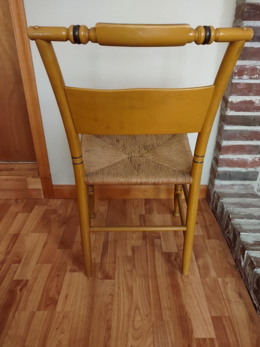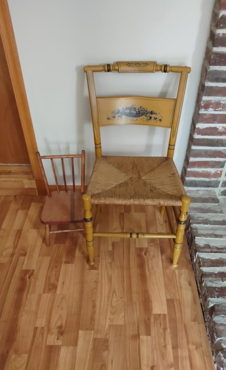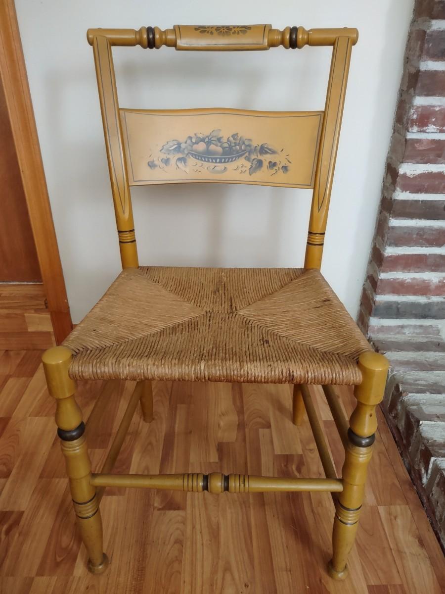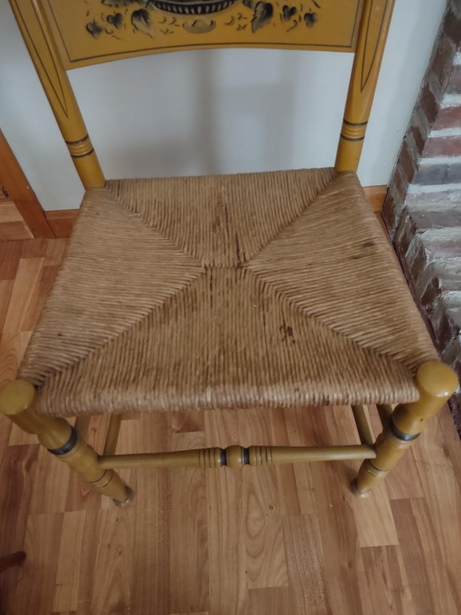 Two vintage chairs, one is doll-sized perfect for a patio or porch, and the other has a thatch seat with mustard yellow design, most likely a Hitchcock Chair but it is not marked.. Please see all pictures as they are the best representation of the items. The pictures show condition, measurements if taken, and what is included in the lot. Due to the large amount that we photograph and the time frame, we are not always able to take measurements. All items unless noted, are pre-owned and have been used. If you purchased furniture, you must bring help. We do not allow one person to carry large furniture out on their own. Bring help, tools and a truck for the safety of our client’s homes, and your personal safety. Company policy. Thank you.