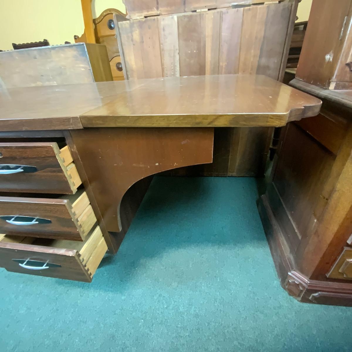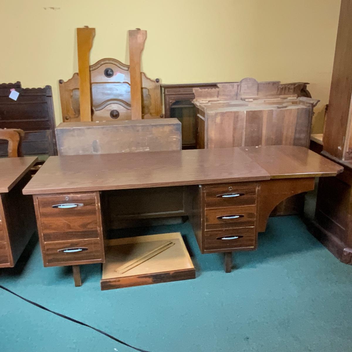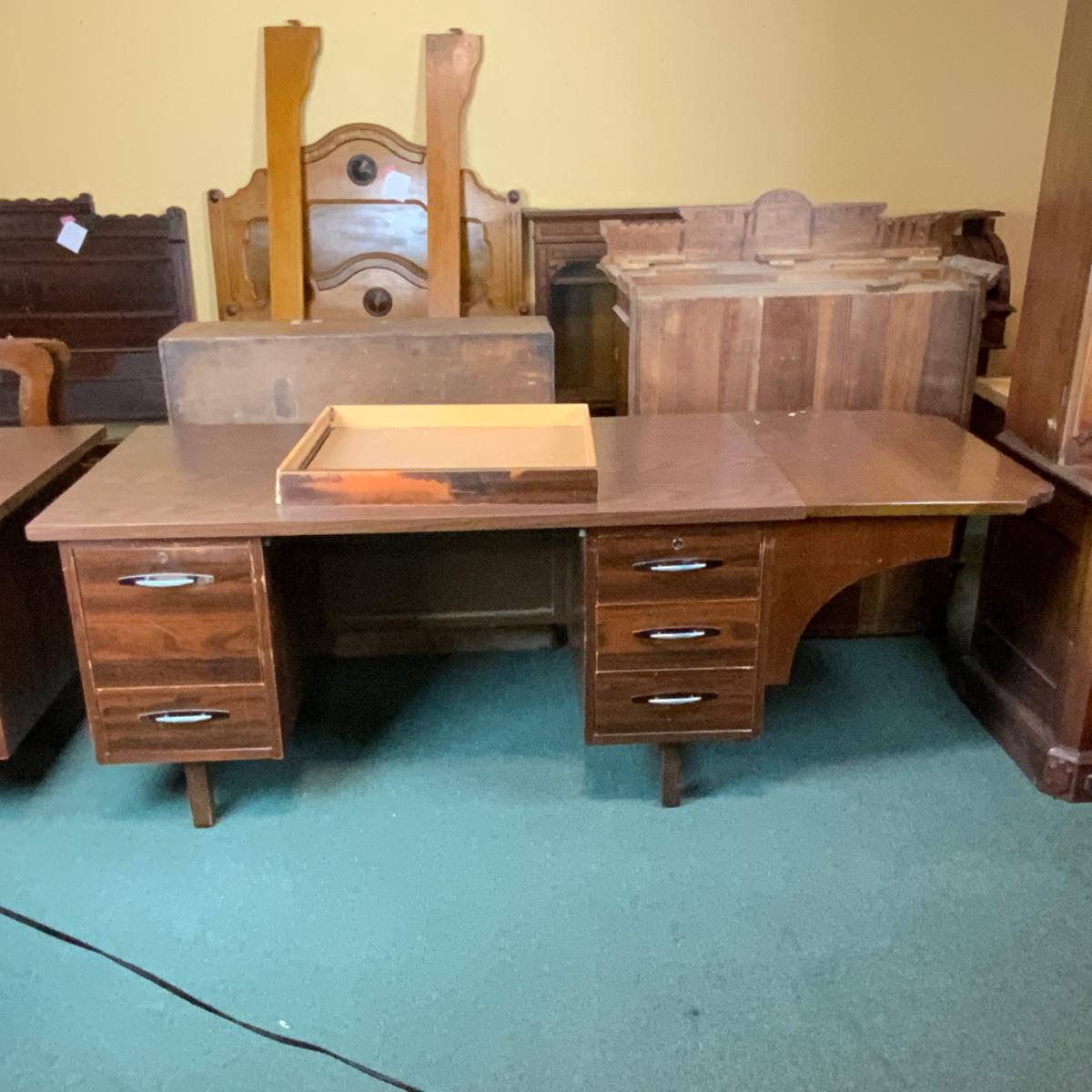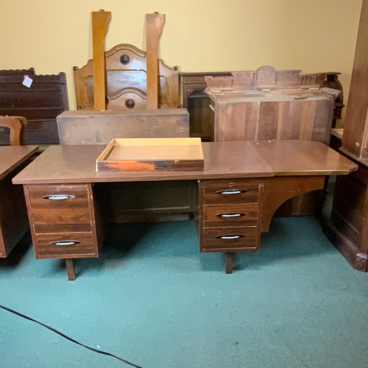 Extended mid century desk. It’s always nice to have a little extra room to spread things out. Center drawer is not attached, but is included live out your Mad Men Don Draper dreams with this desk. //::\\ Please see photos for details and condition. No attempt has been made to hide any imperfections. All items listed in this auction are warehouse items, and need to be cleaned. A majority of the items need restoration as well. All items are sold AS IS and WITHOUT GUARANTEE. If you are uncertain about an item, DO NOT BID. Due to the nature of this online auction in-person inspection is HIGHLY recommended. All Sales are FINAL. Pick Up Times are FIRM. Please confirm with your own schedule that you can pick up in the scheduled times listed in the Terms and Conditions. Any questions please message the auctioneer. DO NOT Contact The Harp Gallery.