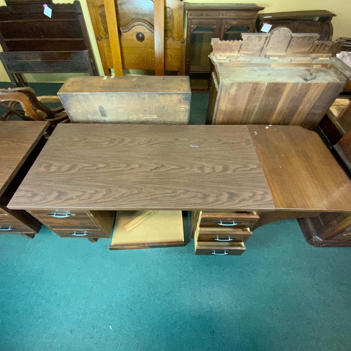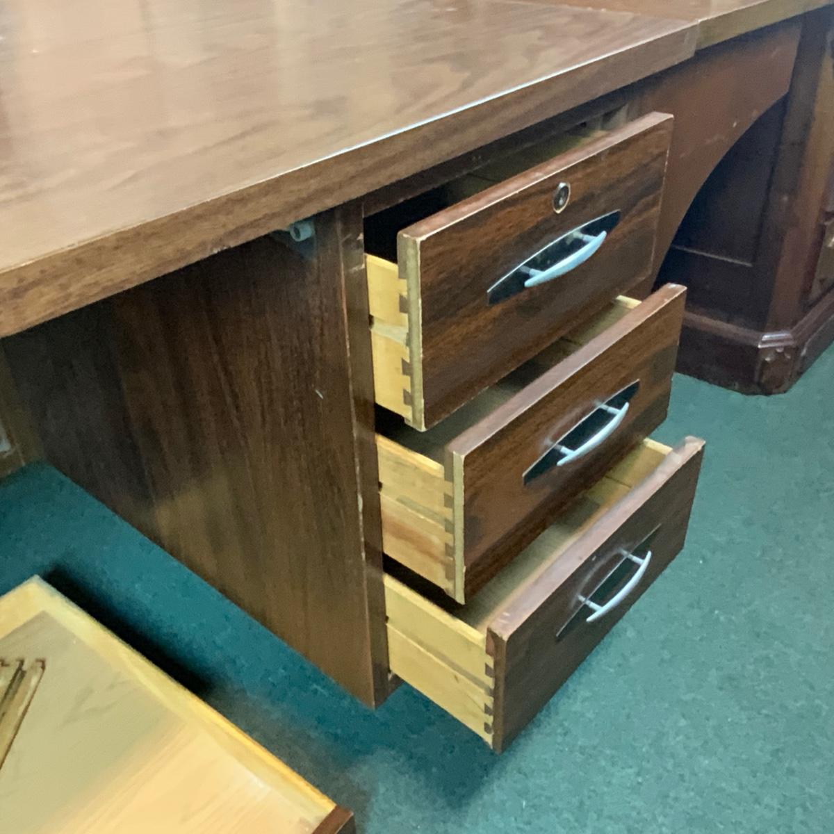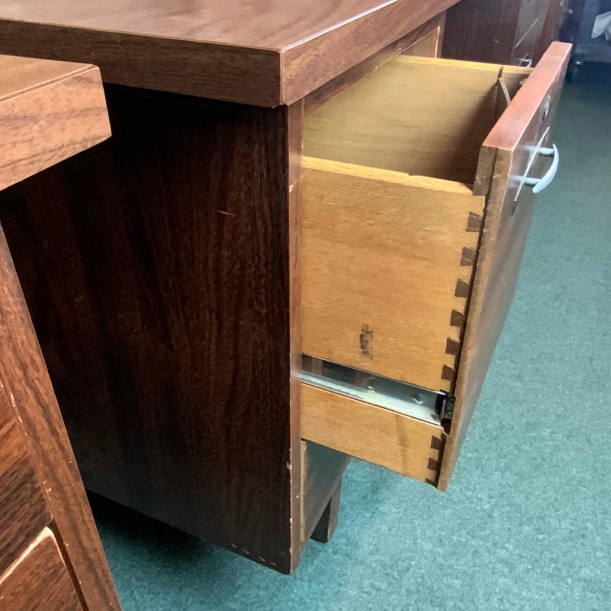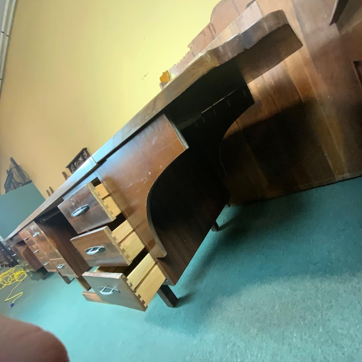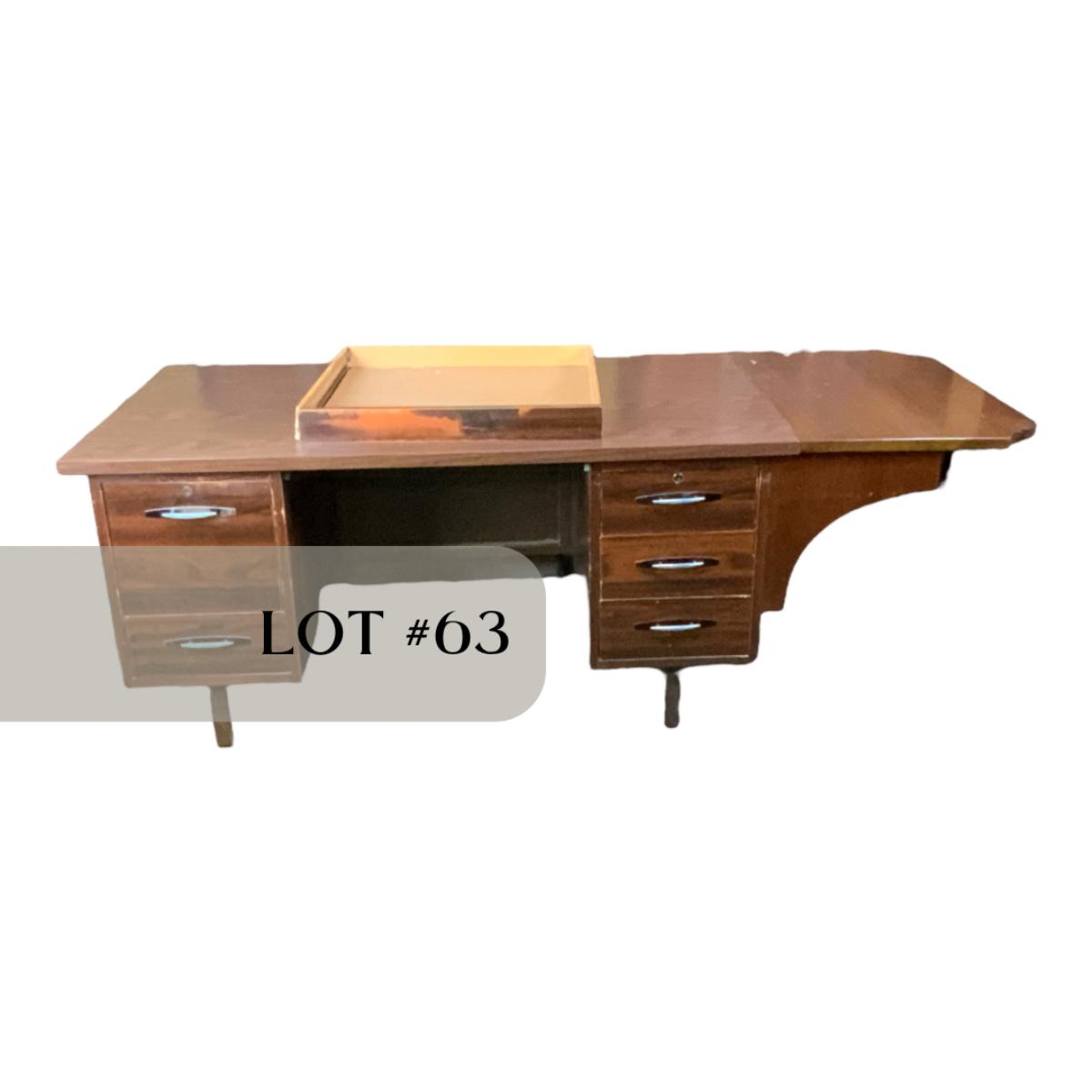 Extended mid century desk. It’s always nice to have a little extra room to spread things out. Center drawer is not attached, but is included live out your Mad Men Don Draper dreams with this desk. //::\\ Please see photos for details and condition. No attempt has been made to hide any imperfections. All items listed in this auction are warehouse items, and need to be cleaned. A majority of the items need restoration as well. All items are sold AS IS and WITHOUT GUARANTEE. If you are uncertain about an item, DO NOT BID. Due to the nature of this online auction in-person inspection is HIGHLY recommended. All Sales are FINAL. Pick Up Times are FIRM. Please confirm with your own schedule that you can pick up in the scheduled times listed in the Terms and Conditions. Any questions please message the auctioneer. DO NOT Contact The Harp Gallery.