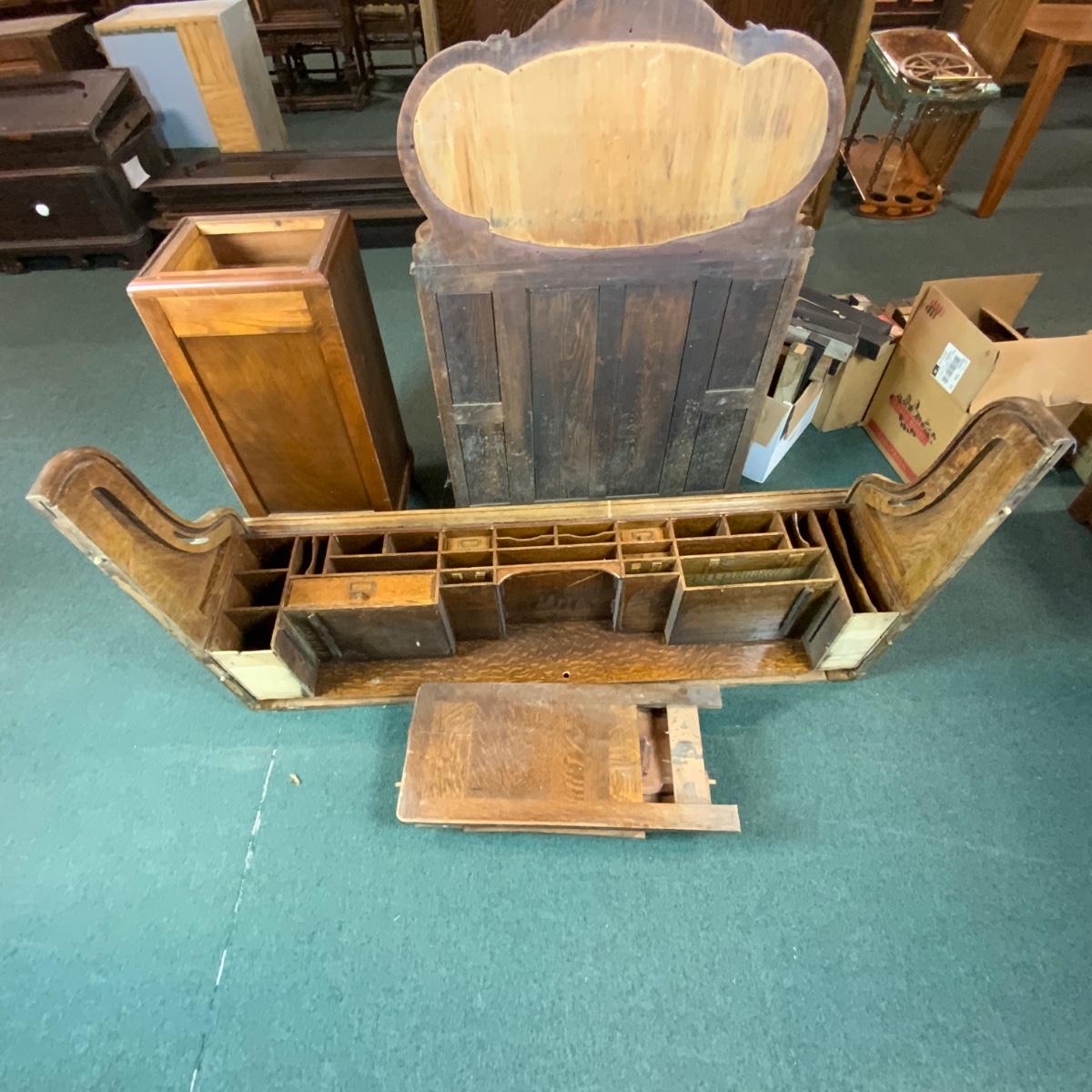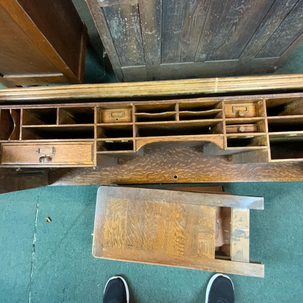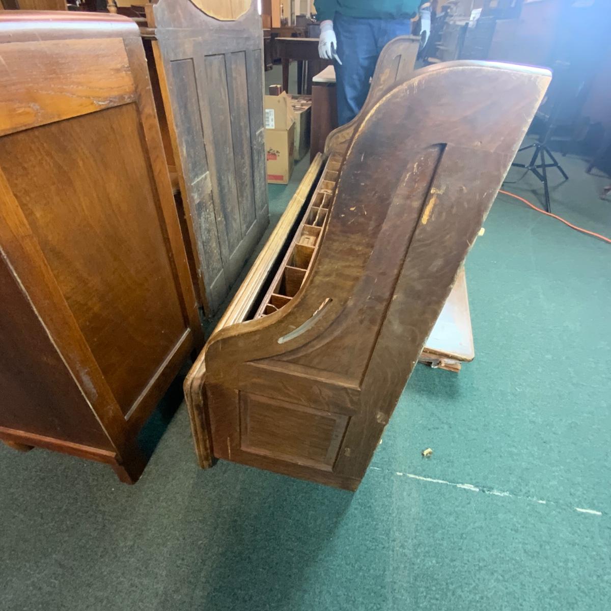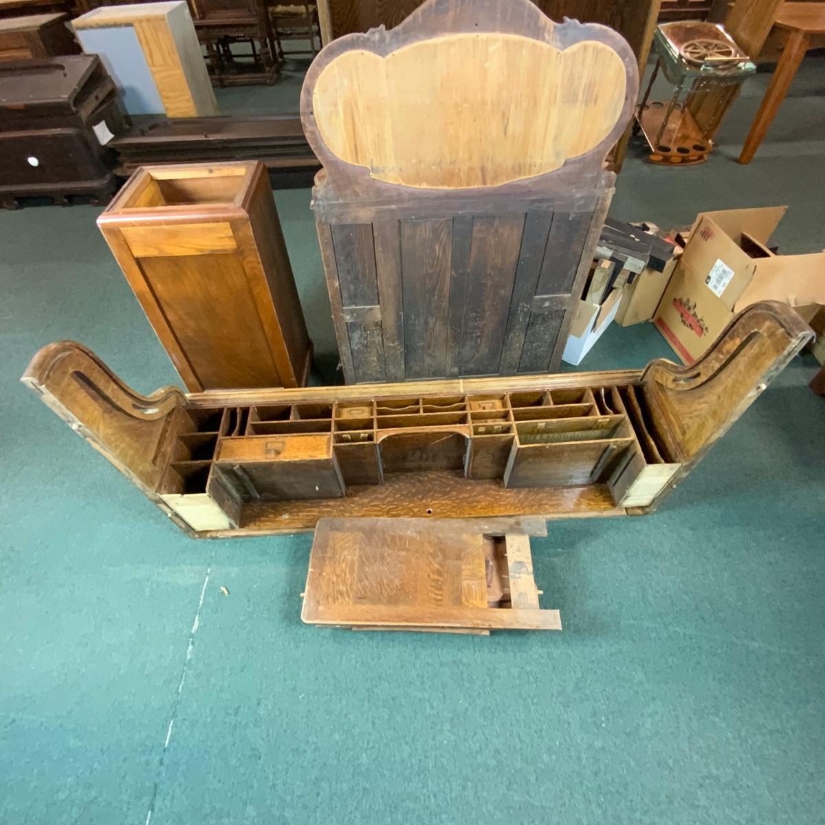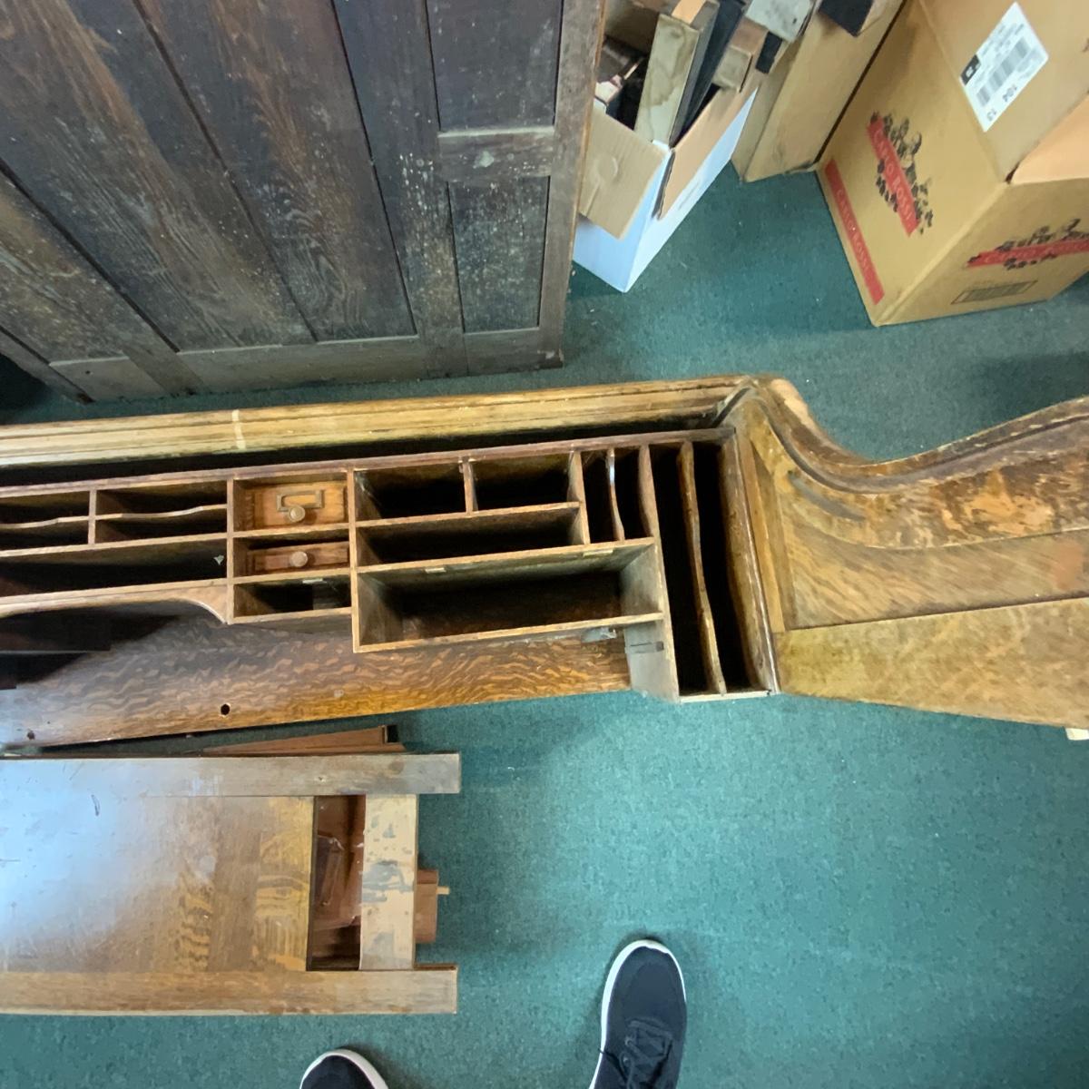 Salvaged desktop with compartments. Extra wood as well. Great sides could make for a wonderful desk if you have the ambition. //::\\ Please see photos for details and condition. No attempt has been made to hide any imperfections. All items listed in this auction are warehouse items, and need to be cleaned. A majority of the items need restoration as well. All items are sold AS IS and WITHOUT GUARANTEE. If you are uncertain about an item, DO NOT BID. Due to the nature of this online auction in-person inspection is HIGHLY recommended. All Sales are FINAL. Pick Up Times are FIRM. Please confirm with your own schedule that you can pick up in the scheduled times listed in the Terms and Conditions. Any questions please message the auctioneer. DO NOT Contact The Harp Gallery.