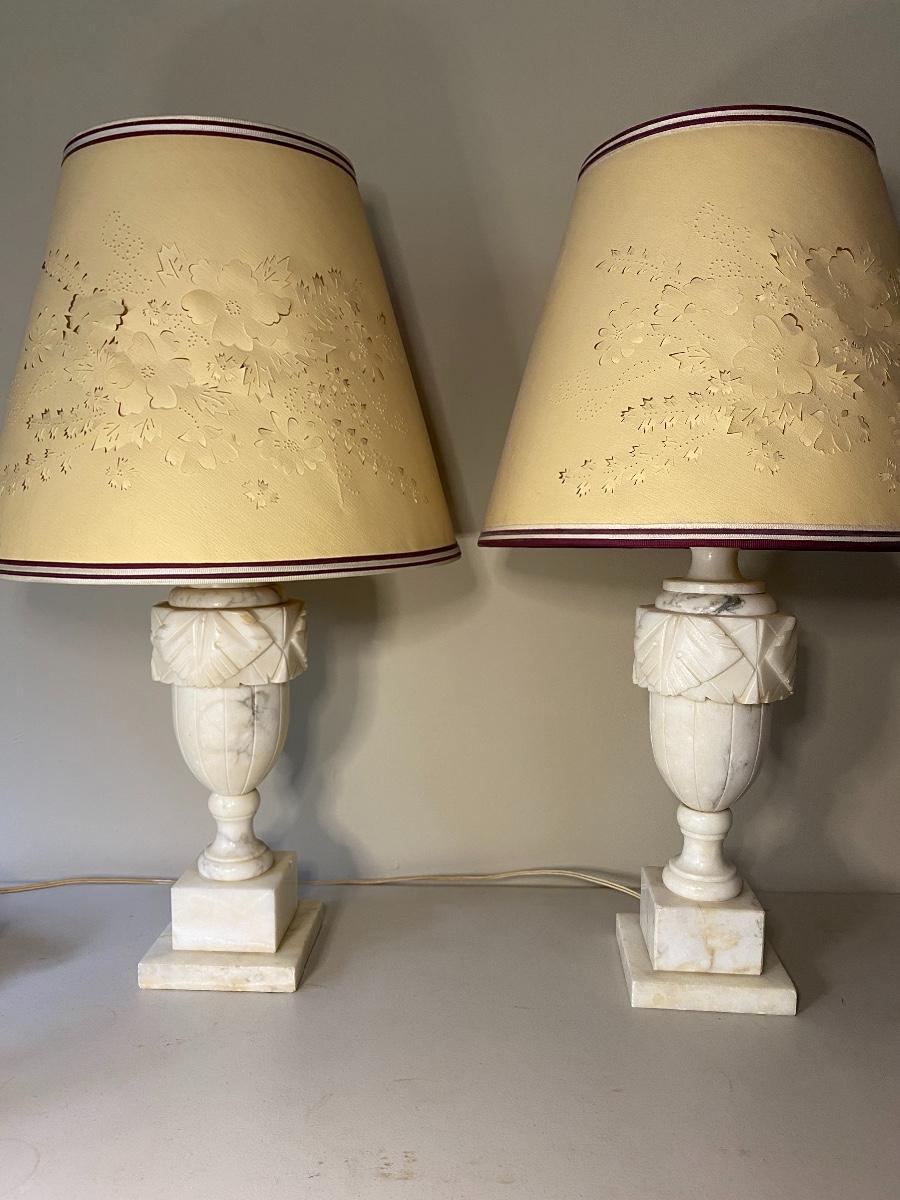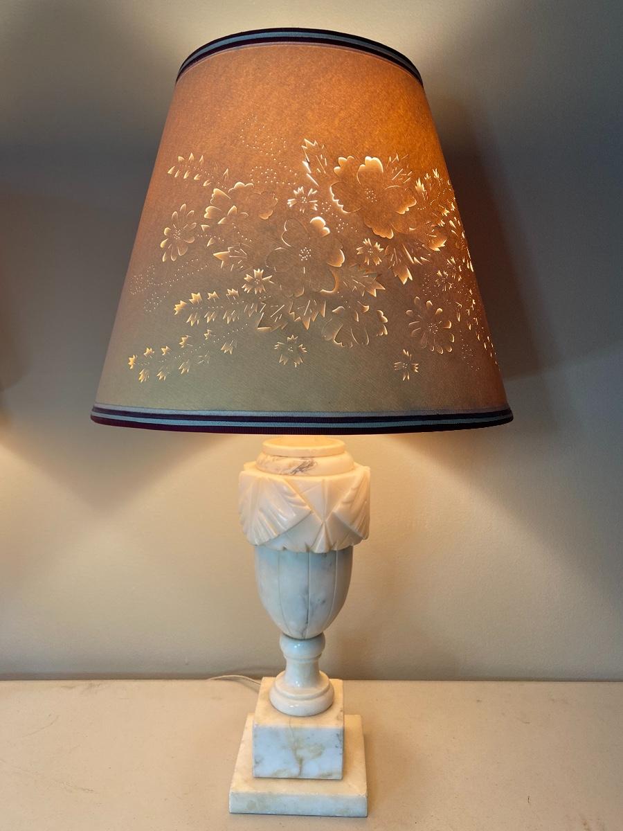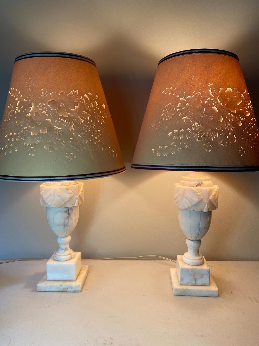 Classy pair of marble lamps with punched shades that are beige in color, and give a soft glow when lit. Please see all pictures as they are the best representation of the items. The pictures show condition, measurements if taken, and what is included in the lot. Due to the large amount that we photograph and the time frame, we are not always able to take measurements. All items unless noted, are pre-owned and have been used. If you purchased furniture, you must bring help. We do not allow one person to carry large furniture out on their own. Bring help, tools and a truck for the safety of our client’s homes, and your personal safety. Company policy. Thank you.