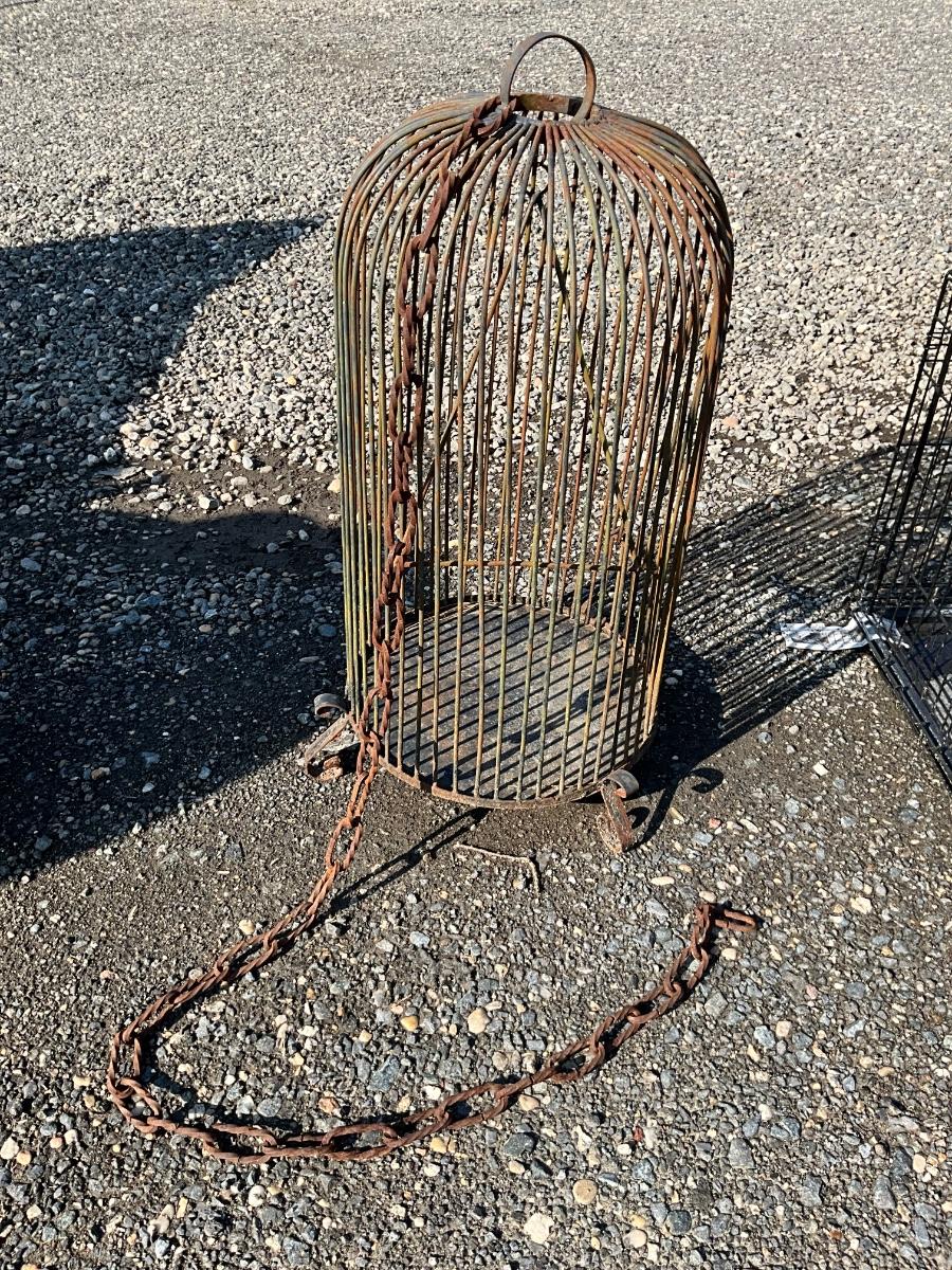 Large Vintage Wrought Iron Bird Cage, could be hung with its 7.5’ Chain or sit on table its a footed bird cage, could be used indoors or outdoors