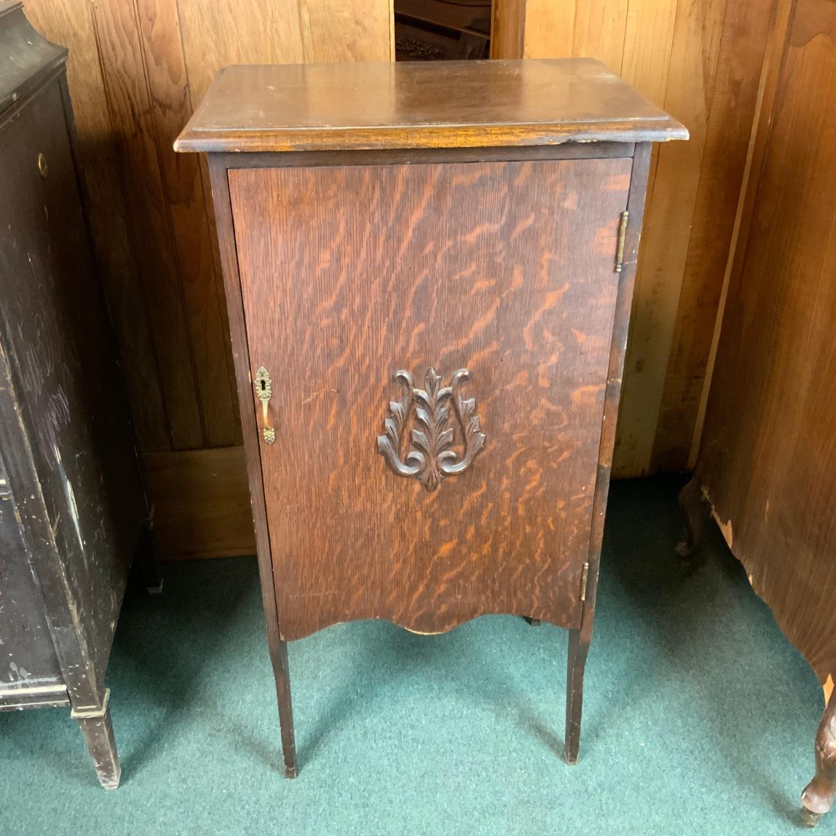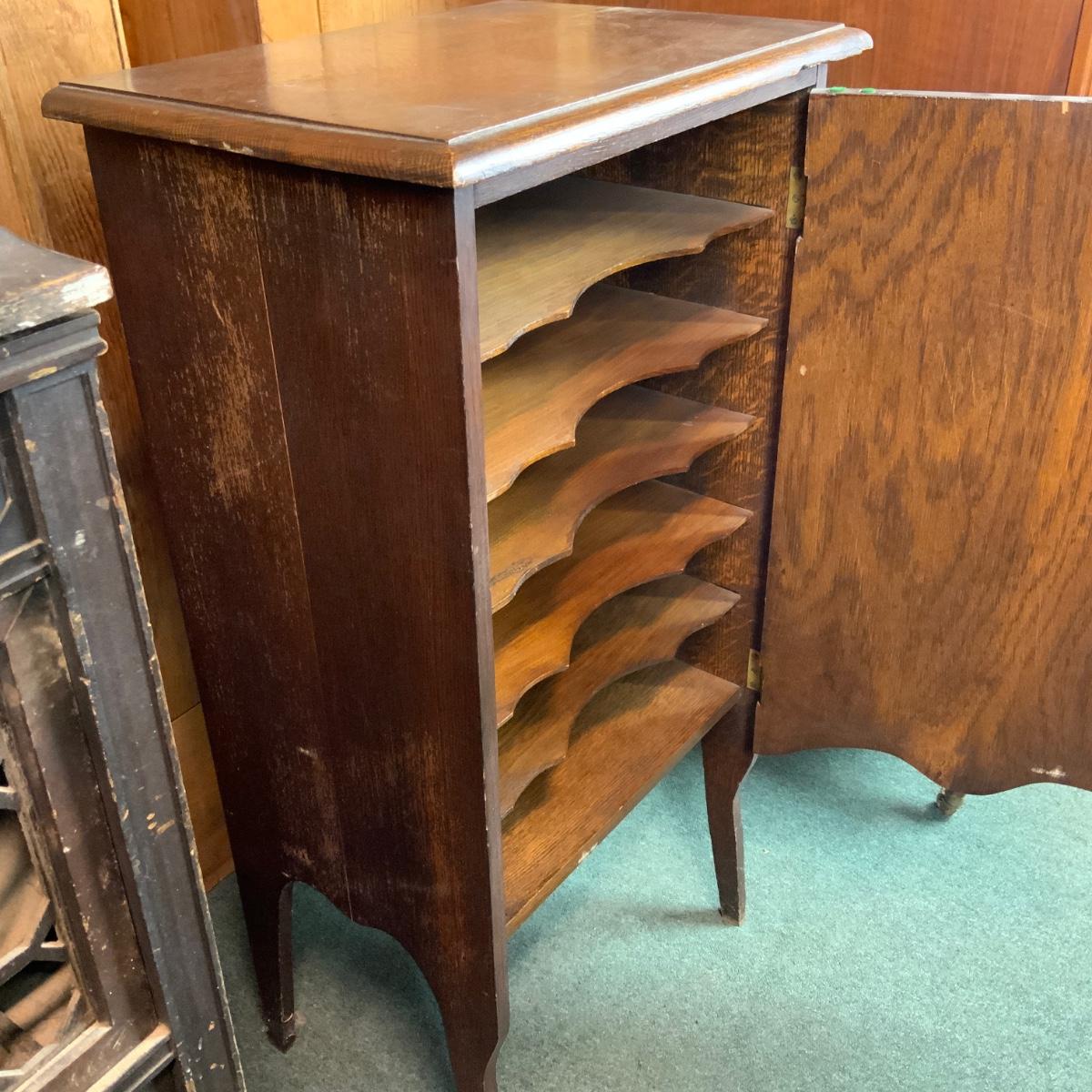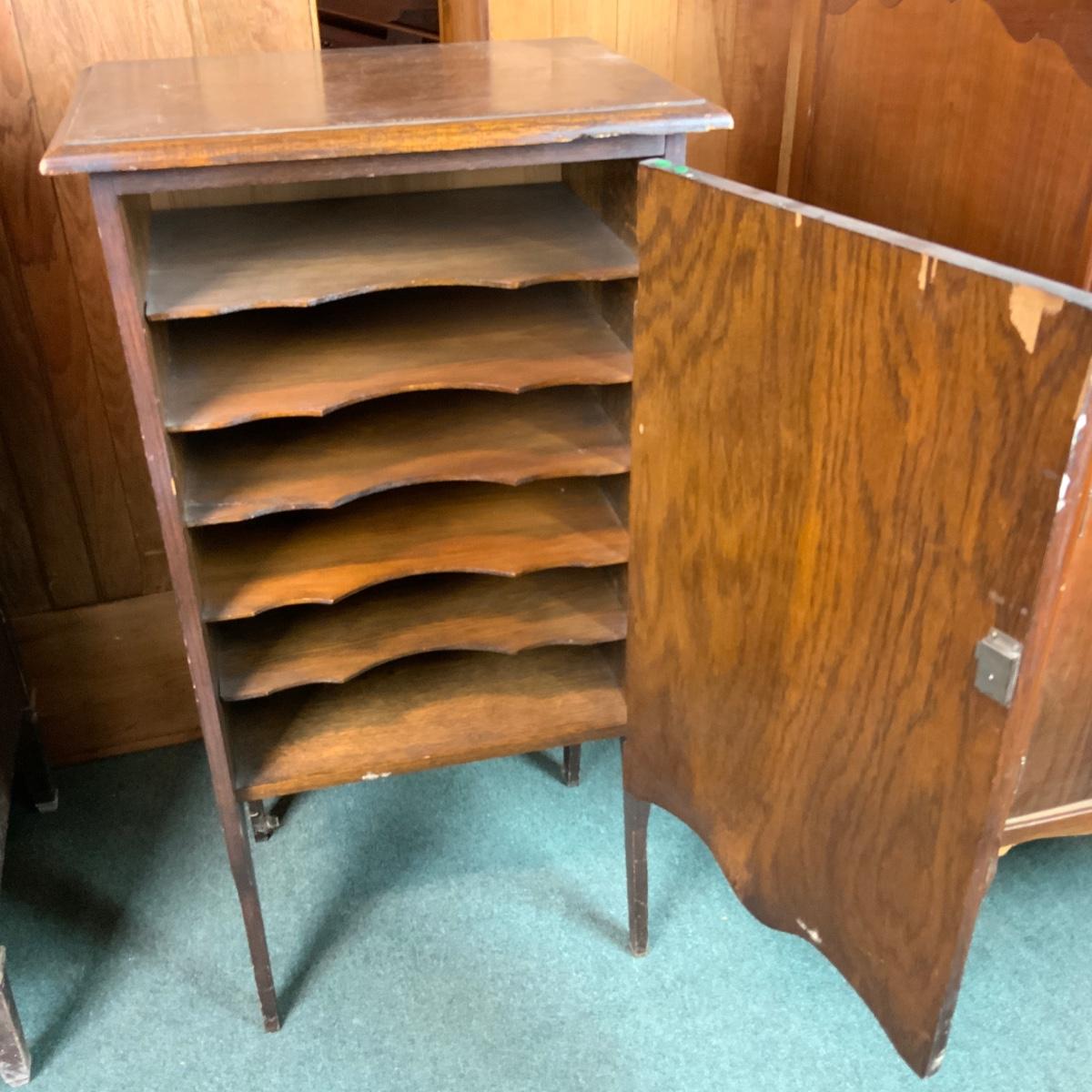 Oak music cabinet. A wonderful, organizational piece, sturdy and well-made. //::\\ Please see photos for details and condition. No attempt has been made to hide any imperfections. All items listed in this auction are warehouse items, and need to be cleaned. A majority of the items need restoration as well. All items are sold AS IS and WITHOUT GUARANTEE. If you are uncertain about an item, DO NOT BID. Due to the nature of this online auction in-person inspection is HIGHLY recommended. All Sales are FINAL. Pick Up Times are FIRM. Please confirm with your own schedule that you can pick up in the scheduled times listed in the Terms and Conditions. Any questions please message the auctioneer. DO NOT Contact The Harp Gallery.