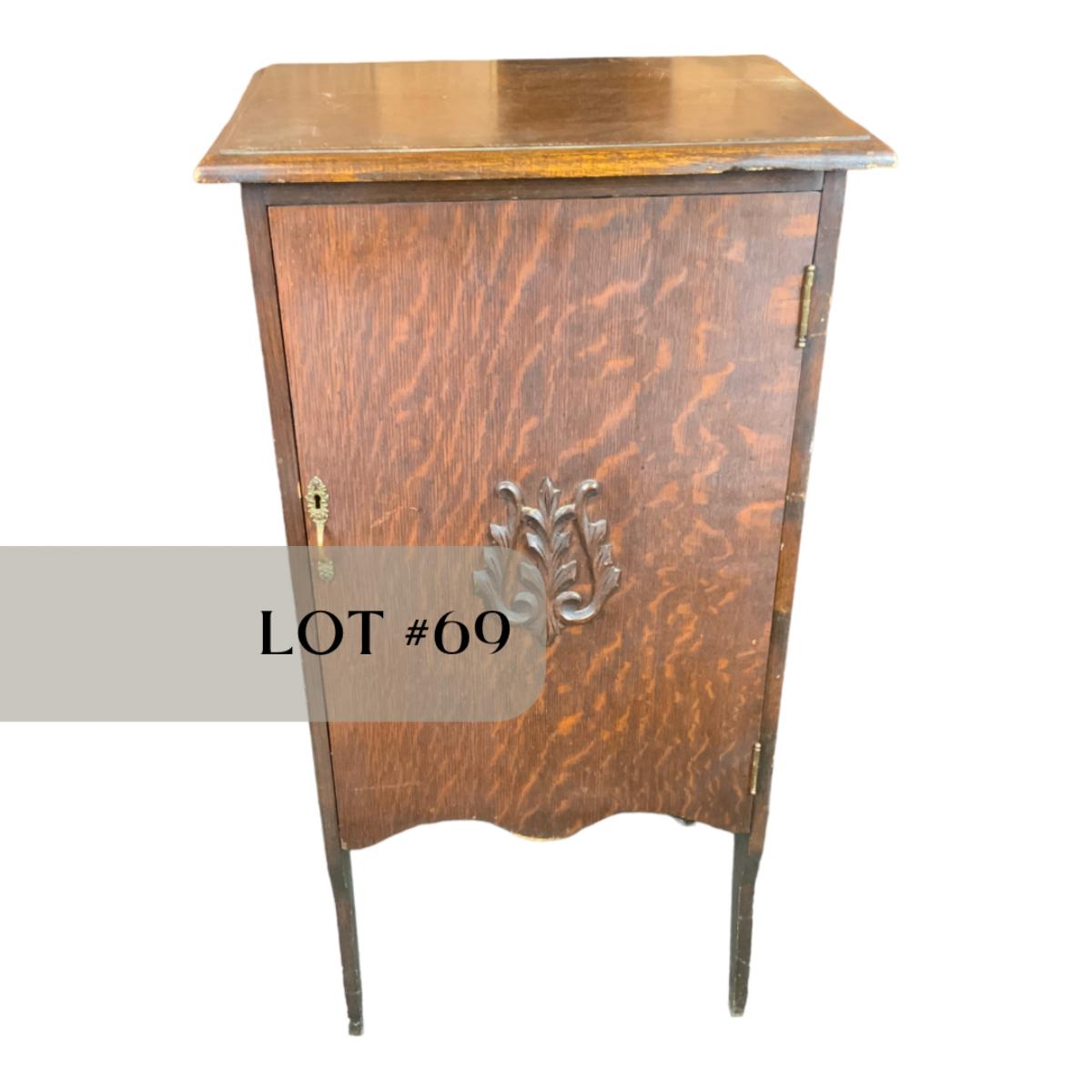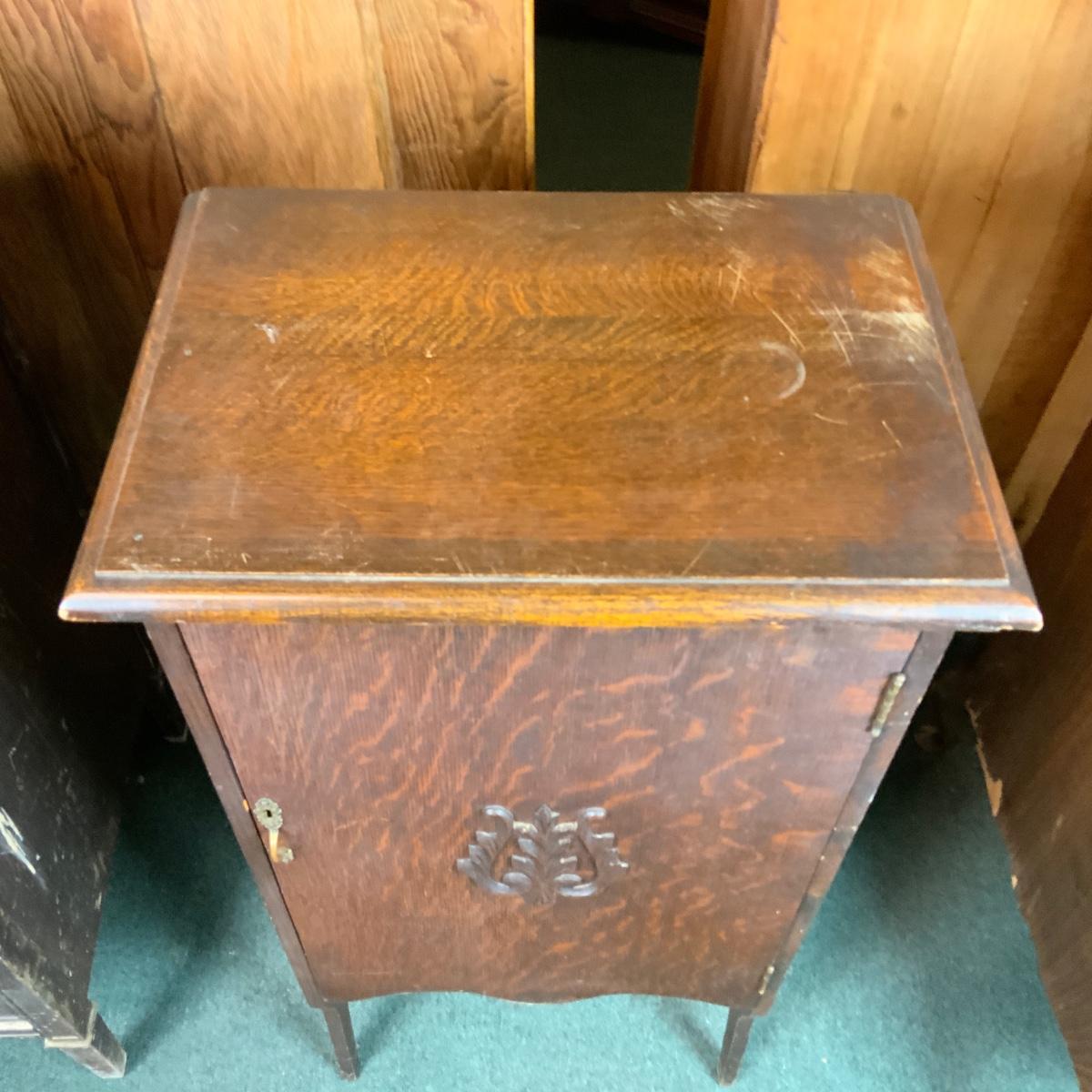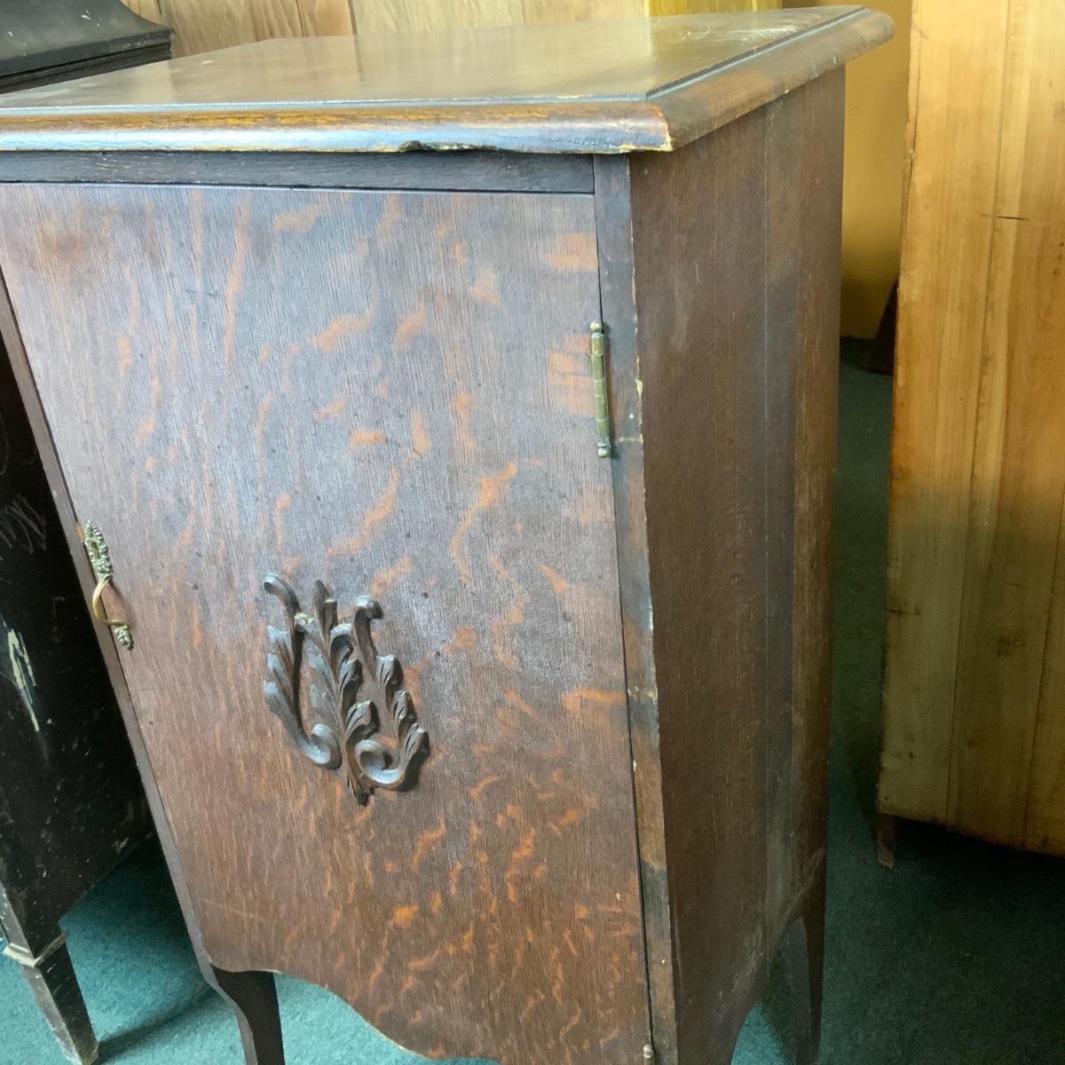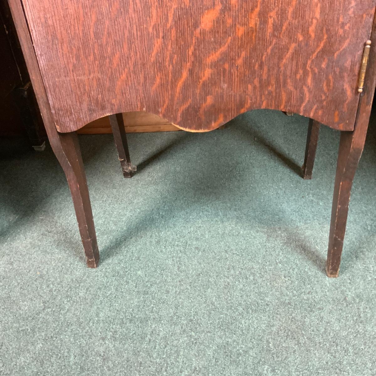 Oak music cabinet. A wonderful, organizational piece, sturdy and well-made. //::\\ Please see photos for details and condition. No attempt has been made to hide any imperfections. All items listed in this auction are warehouse items, and need to be cleaned. A majority of the items need restoration as well. All items are sold AS IS and WITHOUT GUARANTEE. If you are uncertain about an item, DO NOT BID. Due to the nature of this online auction in-person inspection is HIGHLY recommended. All Sales are FINAL. Pick Up Times are FIRM. Please confirm with your own schedule that you can pick up in the scheduled times listed in the Terms and Conditions. Any questions please message the auctioneer. DO NOT Contact The Harp Gallery.