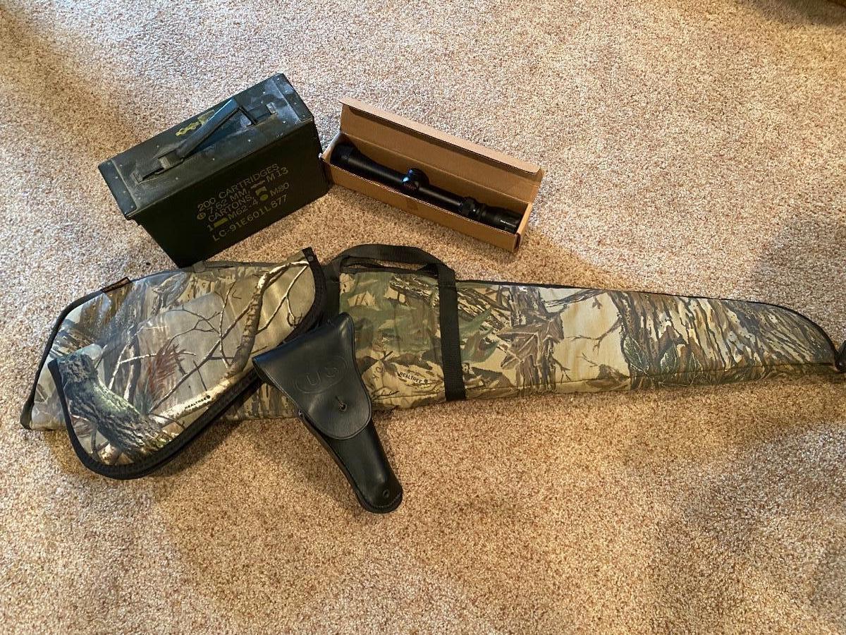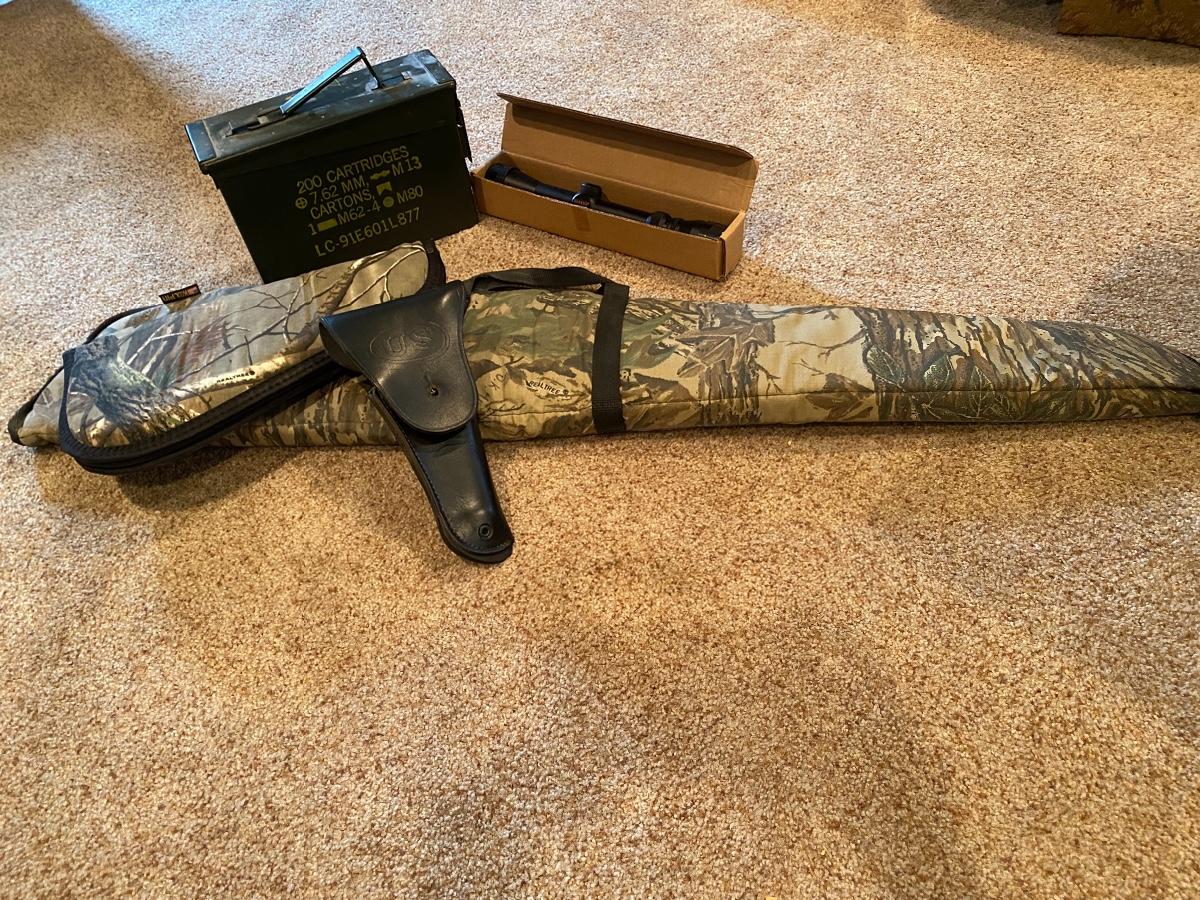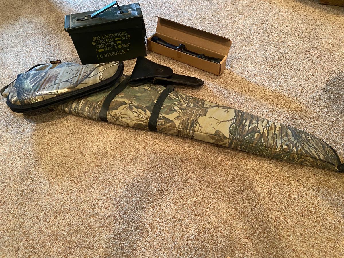 Vintage Ammo box, and a Bolen Holster that the client said was unused during Vietnam. Also included is a scope (Model 21017) and camo gun case.
