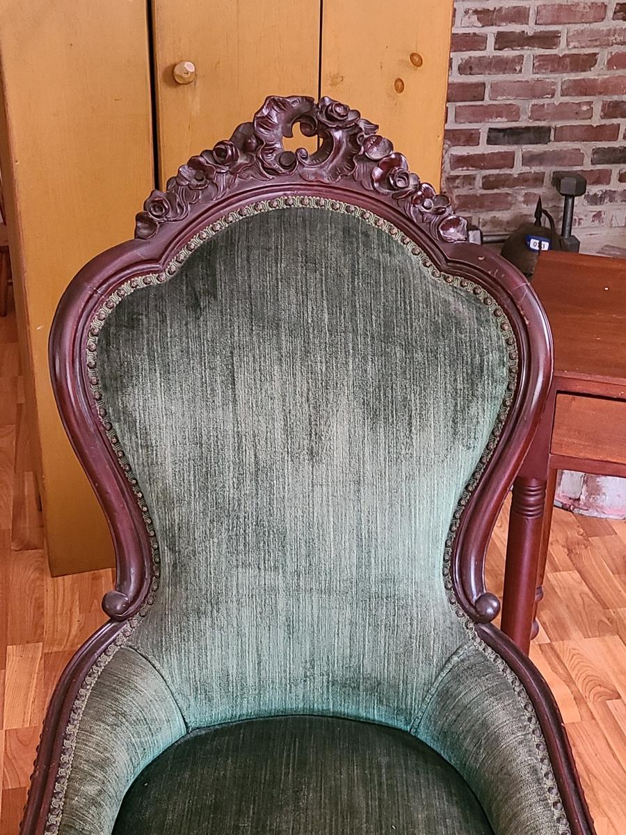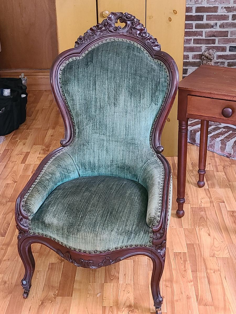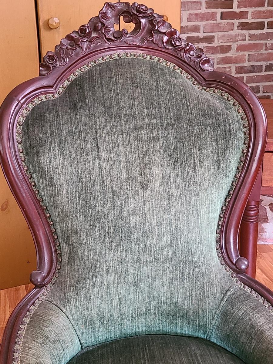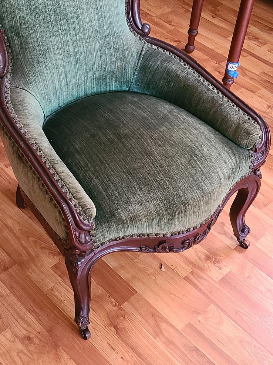 This chair is gorgeous and still looks new with minor wear to the deep green velvet/velour. Wood carved frame with studded accents all around! 39" Please see all pictures as they are the best representation of the items. The pictures show condition, measurements if taken, and what is included in the lot. Due to the large amount that we photograph and the time frame, we are not always able to take measurements. All items unless noted, are pre-owned and have been used. If you purchased furniture, you must bring help. We do not allow one person to carry large furniture out on their own. Bring help, tools and a truck for the safety of our client’s homes, and your personal safety. Company policy. Thank you.