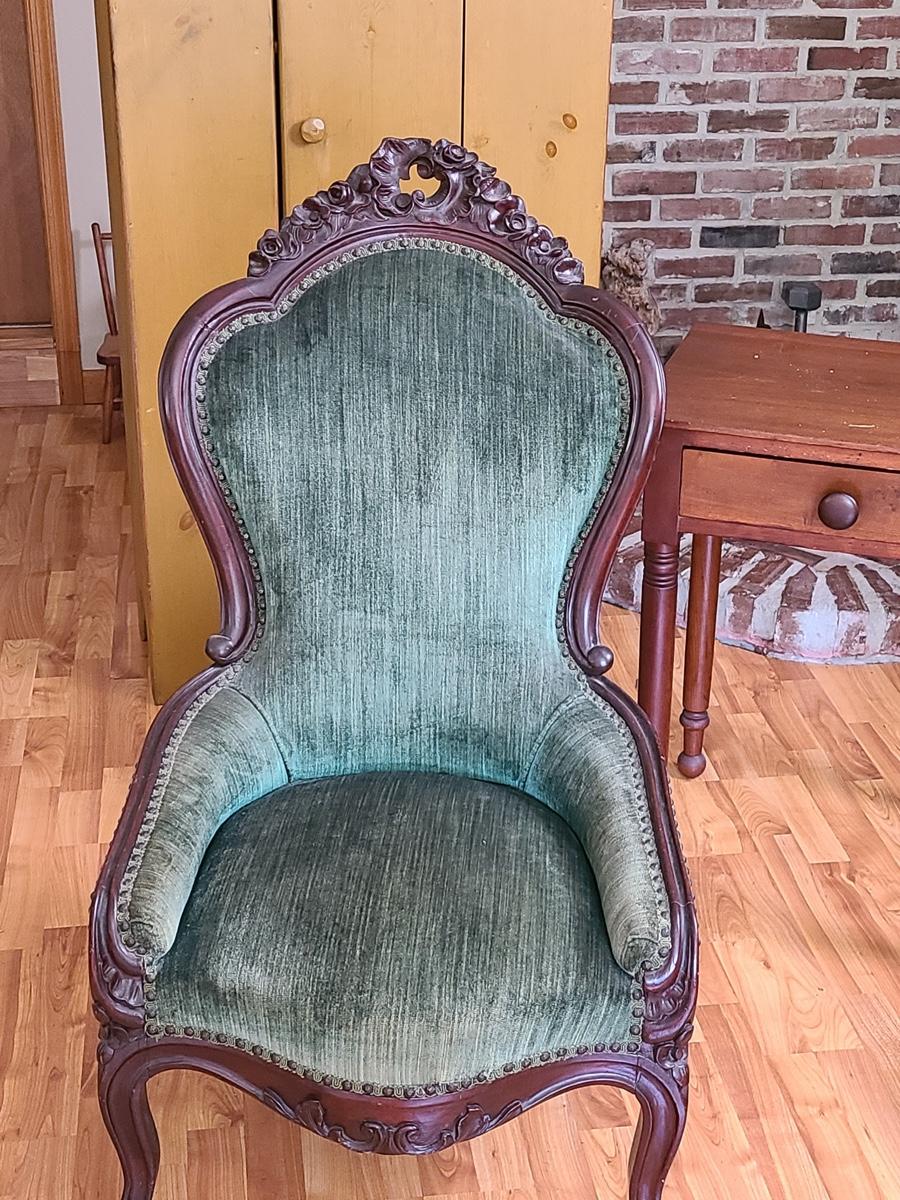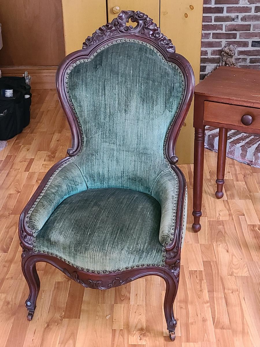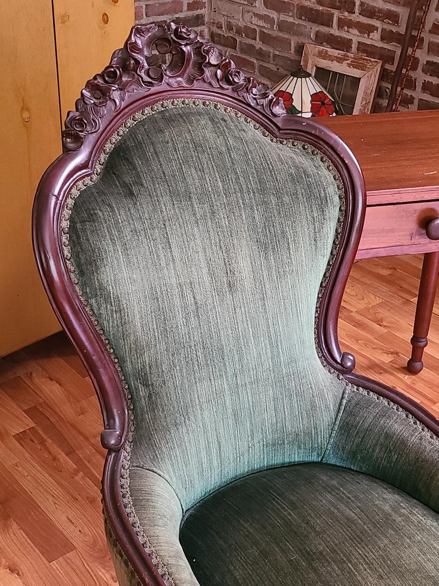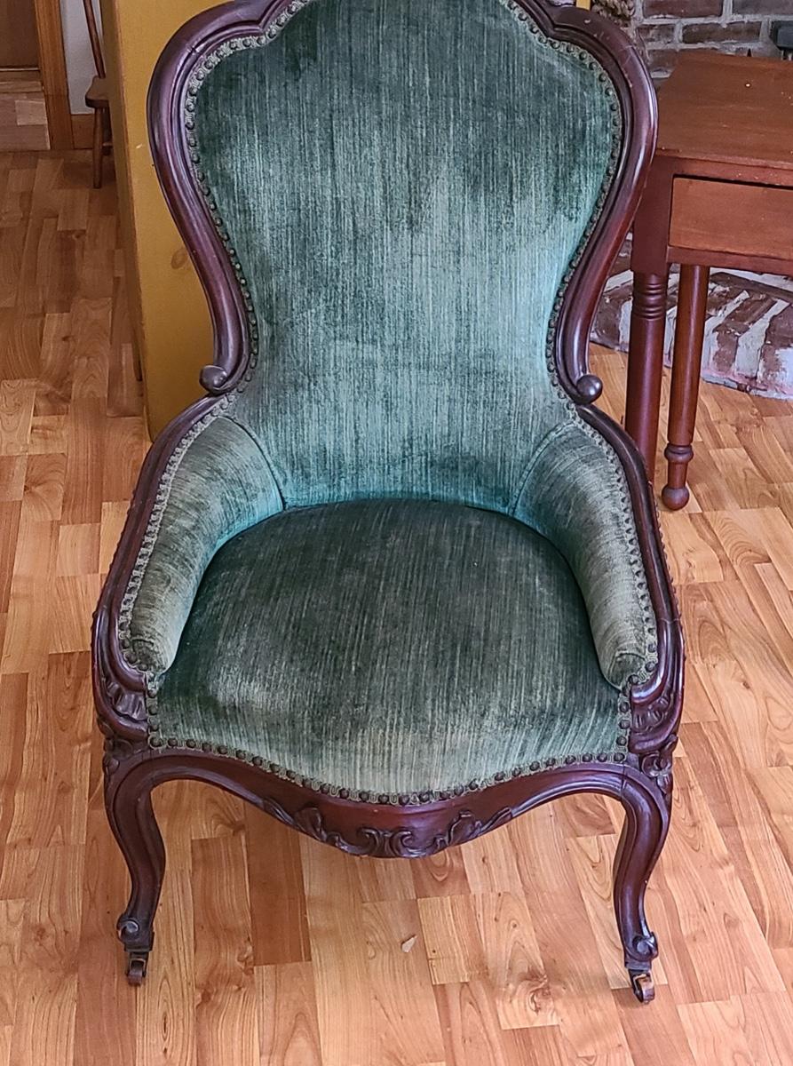 This chair is gorgeous and still looks new with minor wear to the deep green velvet/velour. Wood carved frame with studded accents all around! 39" Please see all pictures as they are the best representation of the items. The pictures show condition, measurements if taken, and what is included in the lot. Due to the large amount that we photograph and the time frame, we are not always able to take measurements. All items unless noted, are pre-owned and have been used. If you purchased furniture, you must bring help. We do not allow one person to carry large furniture out on their own. Bring help, tools and a truck for the safety of our client’s homes, and your personal safety. Company policy. Thank you.
