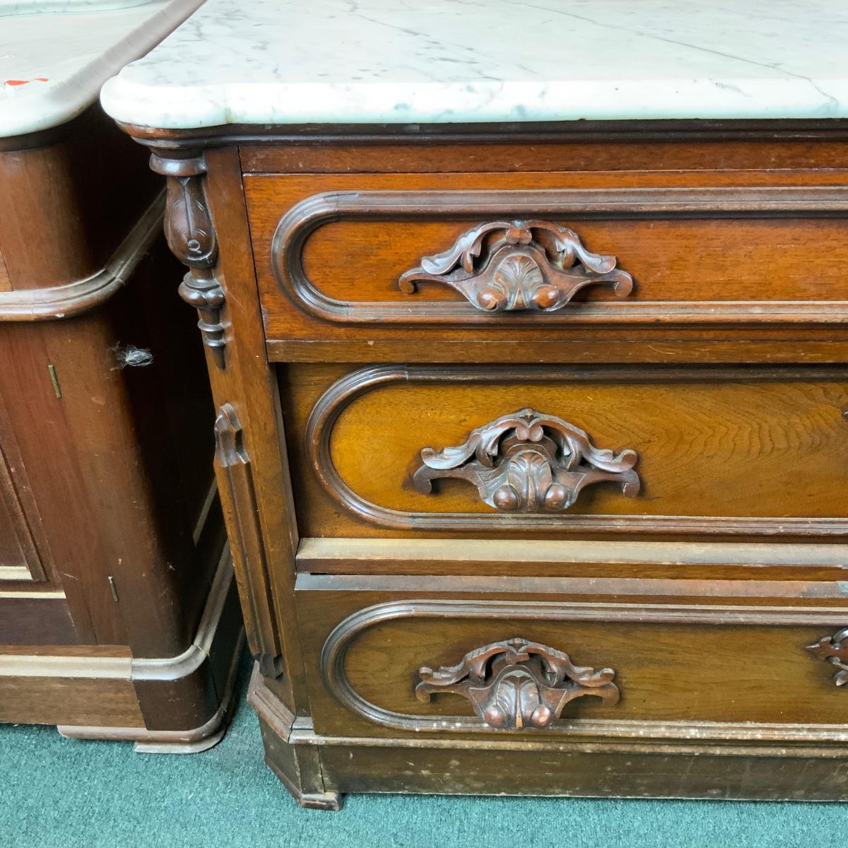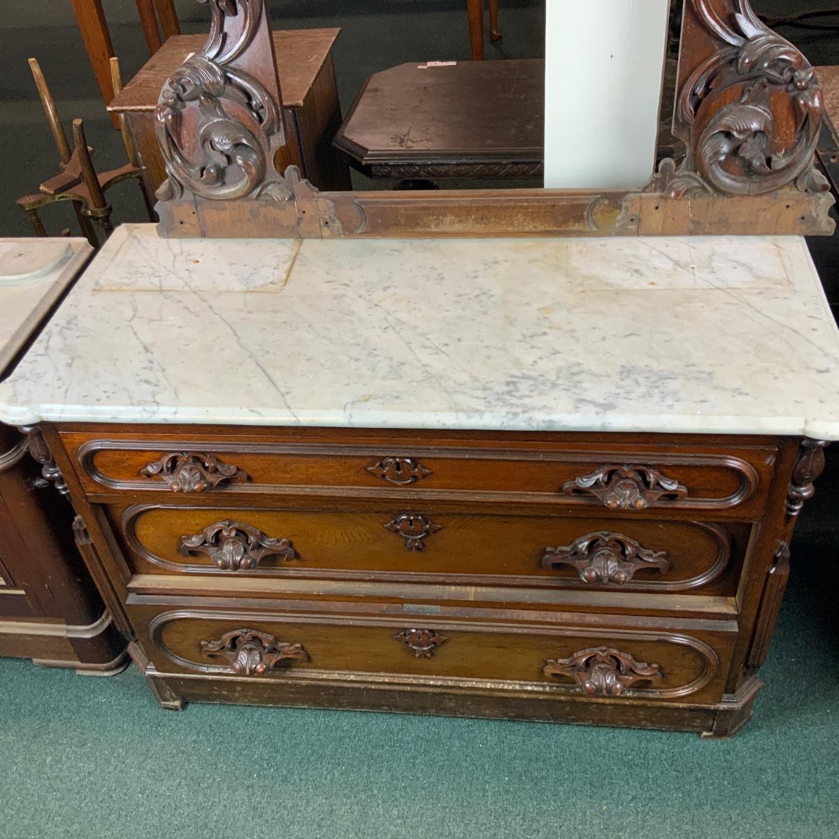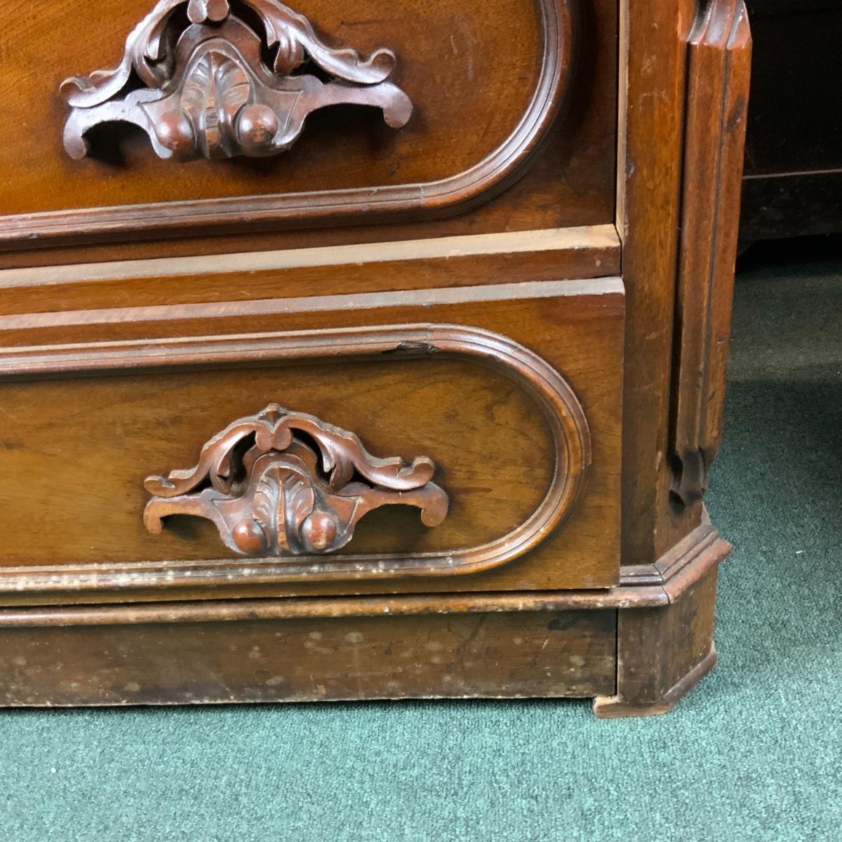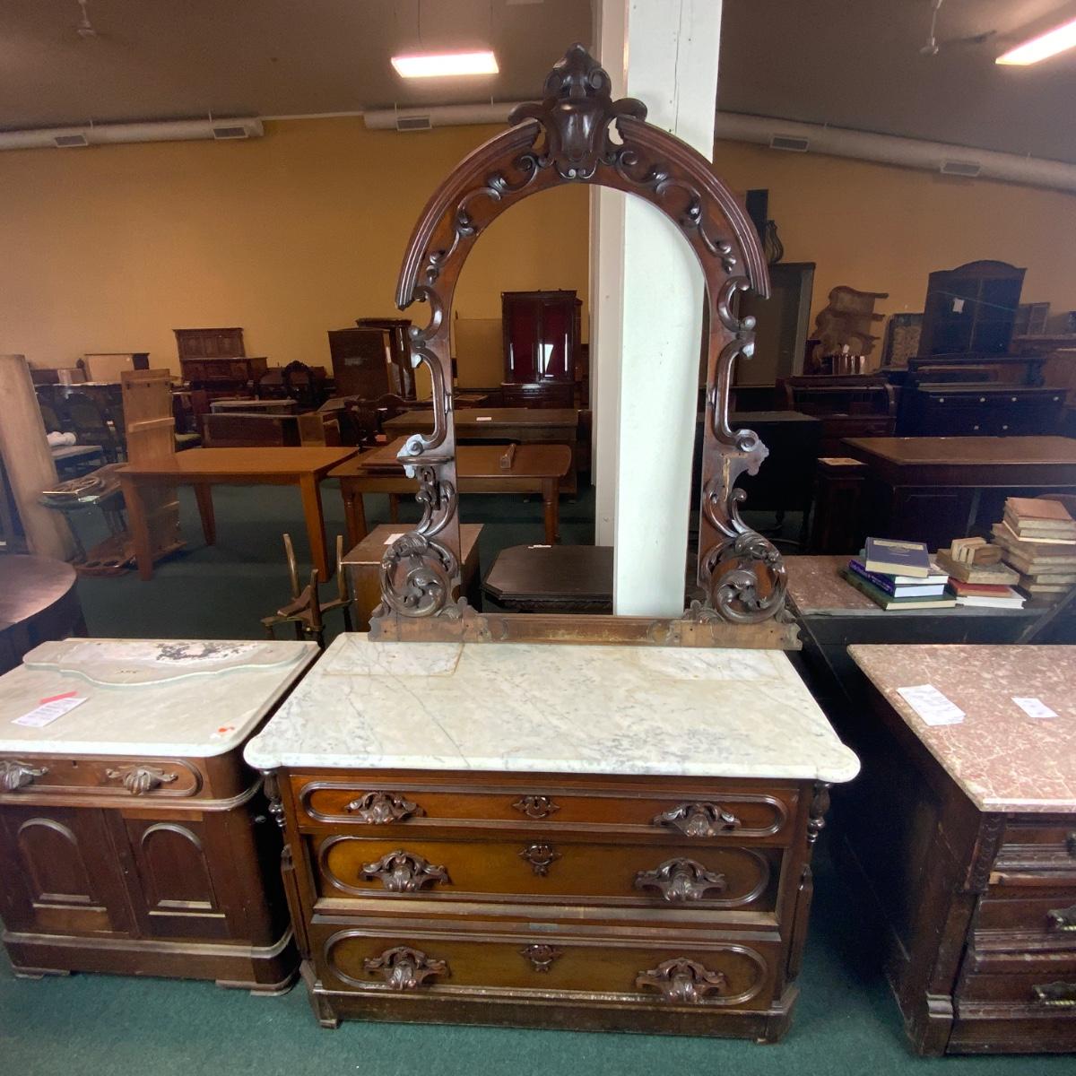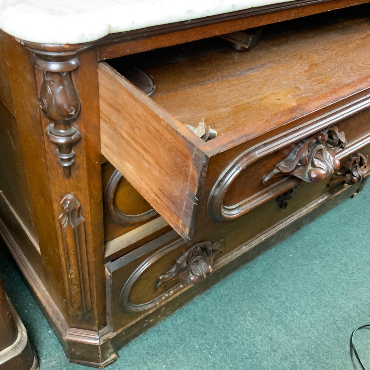 Victorian marble top dresser, just needs a replacement mirror and small restoration. Wonderful carved drawer pulls and details. //::\\ Please see photos for details and condition. No attempt has been made to hide any imperfections. All items listed in this auction are warehouse items, and need to be cleaned. A majority of the items need restoration as well. All items are sold AS IS and WITHOUT GUARANTEE. If you are uncertain about an item, DO NOT BID. Due to the nature of this online auction in-person inspection is HIGHLY recommended. All Sales are FINAL. Pick Up Times are FIRM. Please confirm with your own schedule that you can pick up in the scheduled times listed in the Terms and Conditions. Any questions please message the auctioneer. DO NOT Contact The Harp Gallery.
