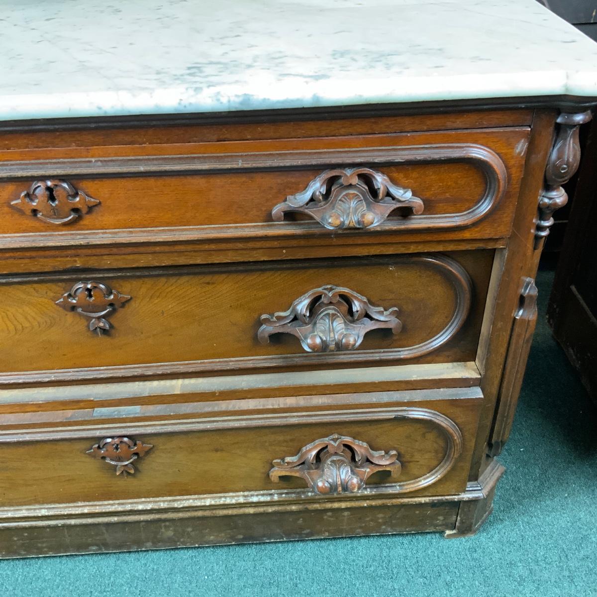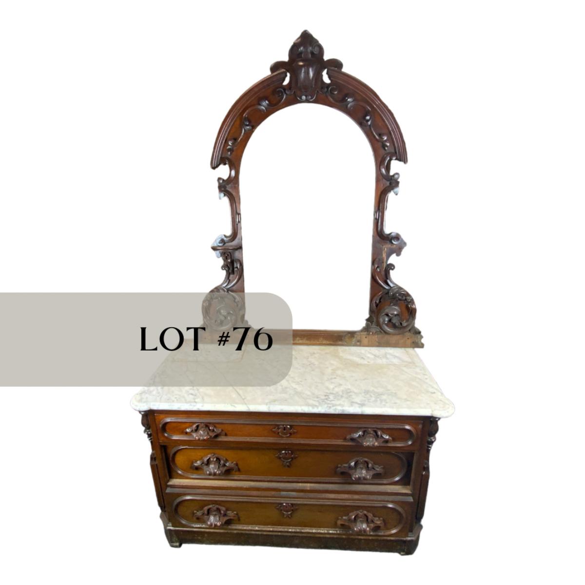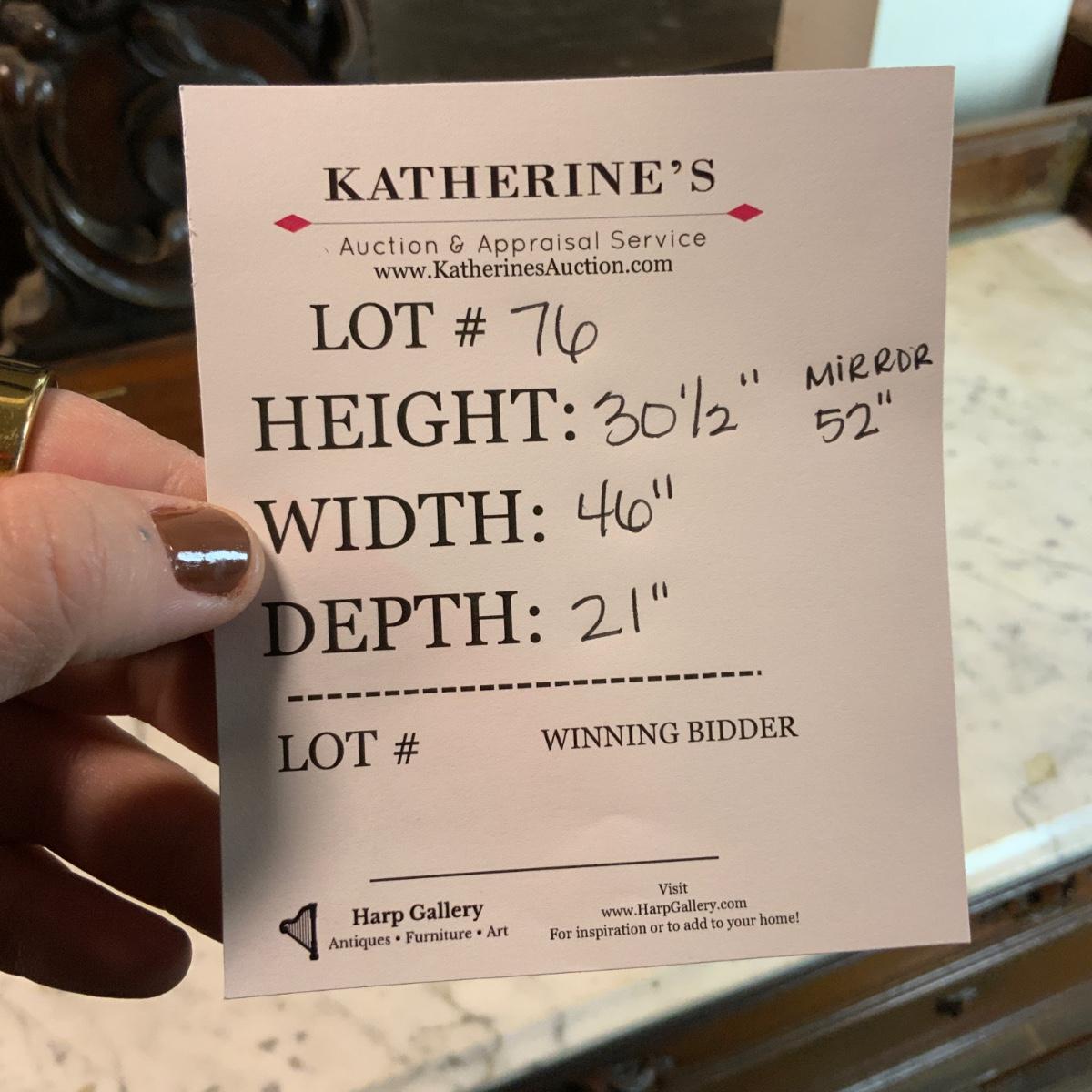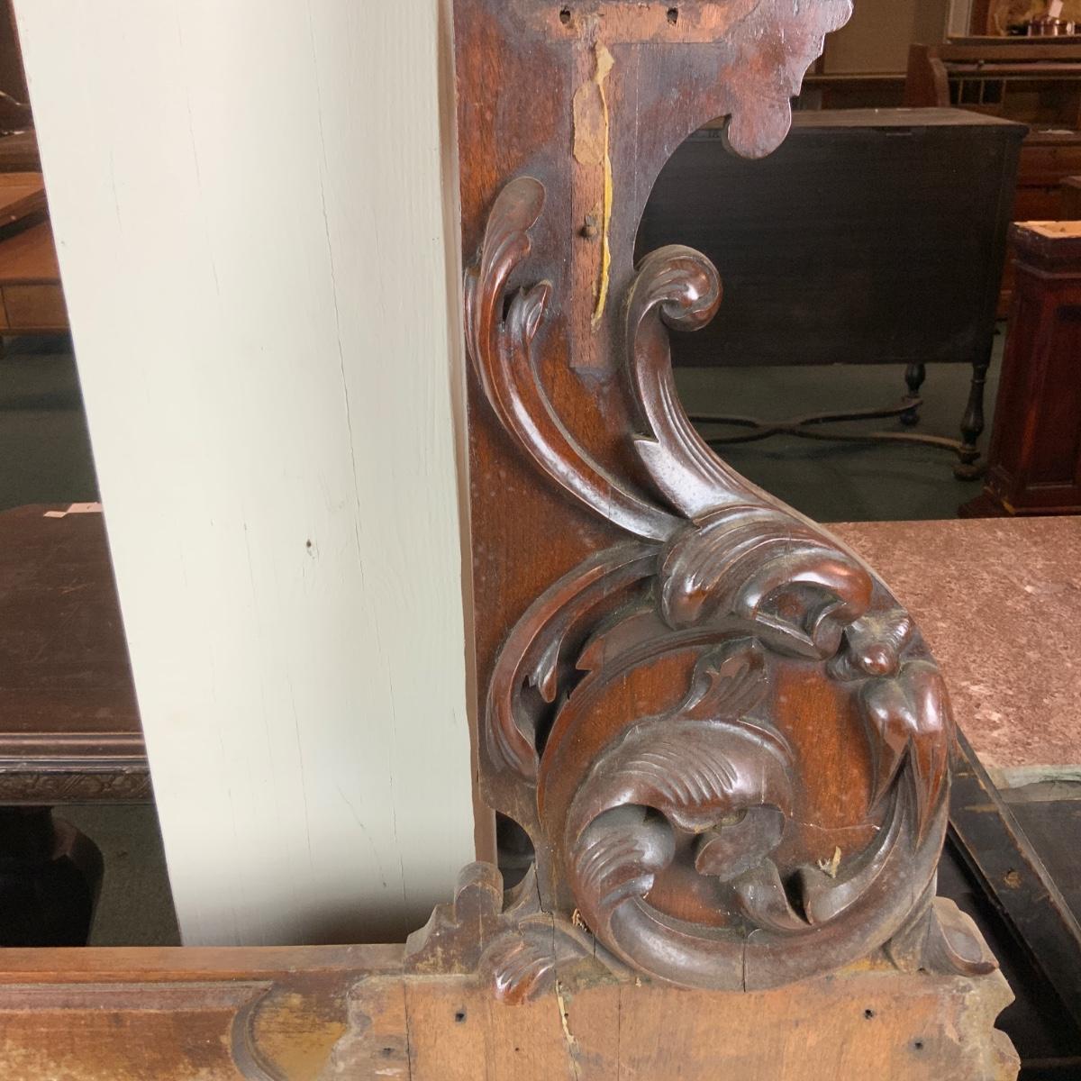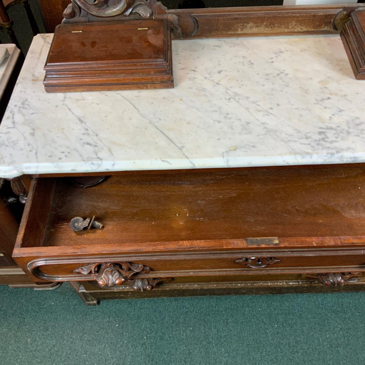 Victorian marble top dresser, just needs a replacement mirror and small restoration. Wonderful carved drawer pulls and details. //::\\ Please see photos for details and condition. No attempt has been made to hide any imperfections. All items listed in this auction are warehouse items, and need to be cleaned. A majority of the items need restoration as well. All items are sold AS IS and WITHOUT GUARANTEE. If you are uncertain about an item, DO NOT BID. Due to the nature of this online auction in-person inspection is HIGHLY recommended. All Sales are FINAL. Pick Up Times are FIRM. Please confirm with your own schedule that you can pick up in the scheduled times listed in the Terms and Conditions. Any questions please message the auctioneer. DO NOT Contact The Harp Gallery.