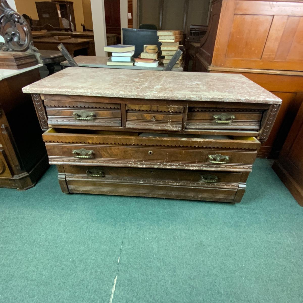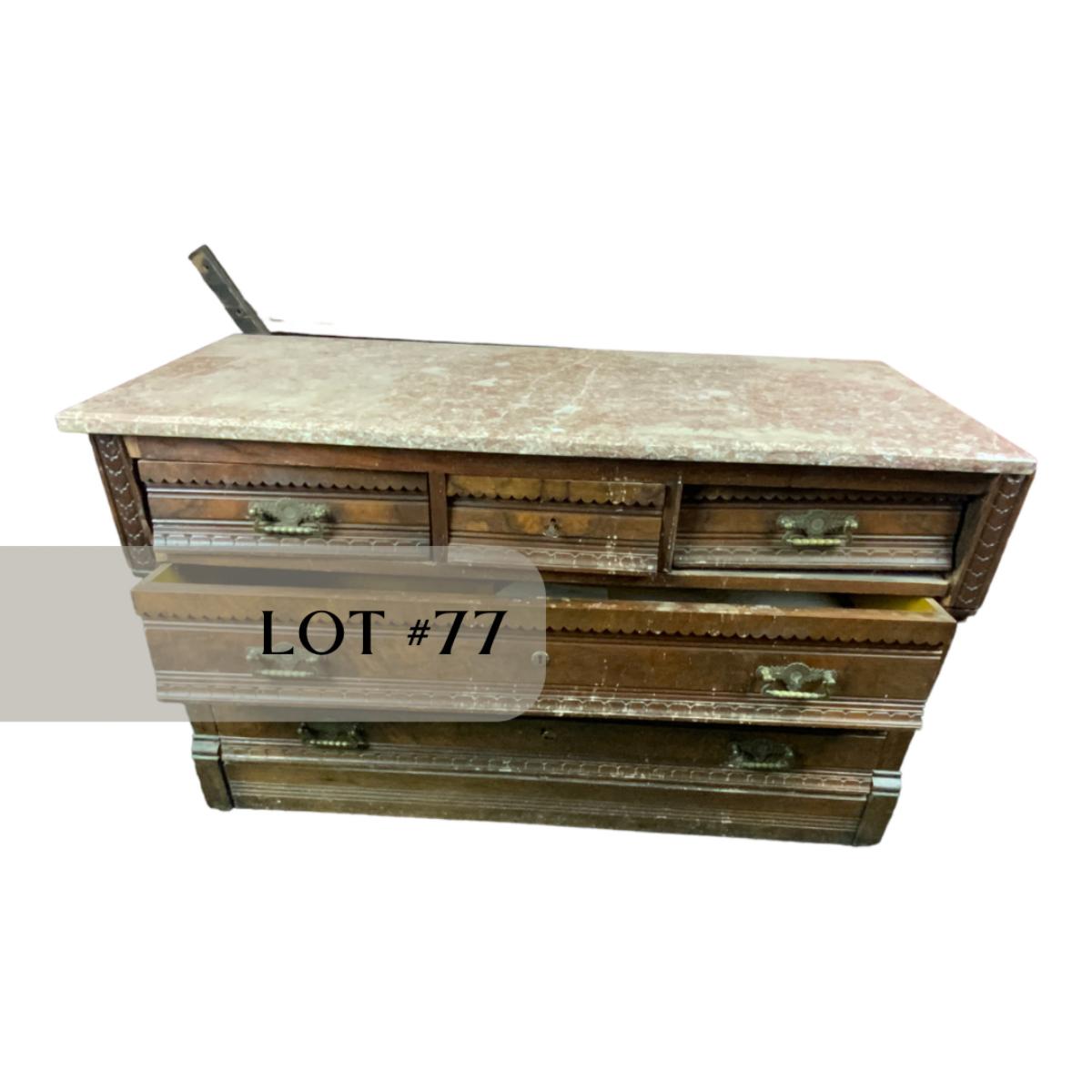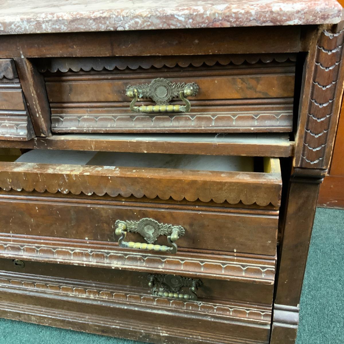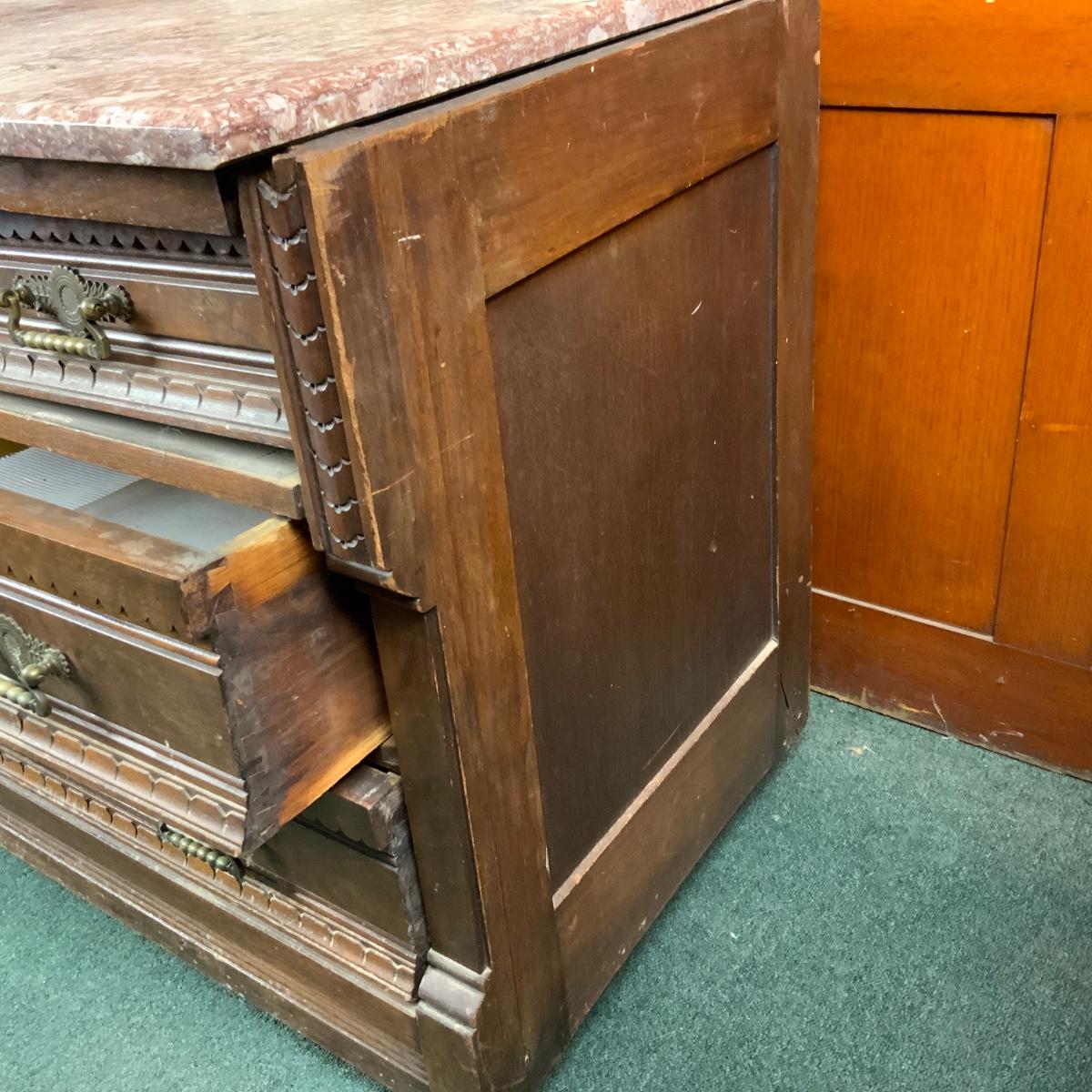 Victorian marble top dresser. Needs work to bring it back to its original glory. Has great bones. //::\\ Please see photos for details and condition. No attempt has been made to hide any imperfections. All items listed in this auction are warehouse items, and need to be cleaned. A majority of the items need restoration as well. All items are sold AS IS and WITHOUT GUARANTEE. If you are uncertain about an item, DO NOT BID. Due to the nature of this online auction in-person inspection is HIGHLY recommended. All Sales are FINAL. Pick Up Times are FIRM. Please confirm with your own schedule that you can pick up in the scheduled times listed in the Terms and Conditions. Any questions please message the auctioneer. DO NOT Contact The Harp Gallery.