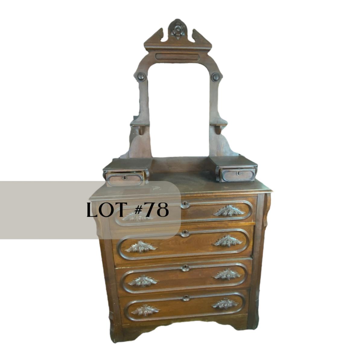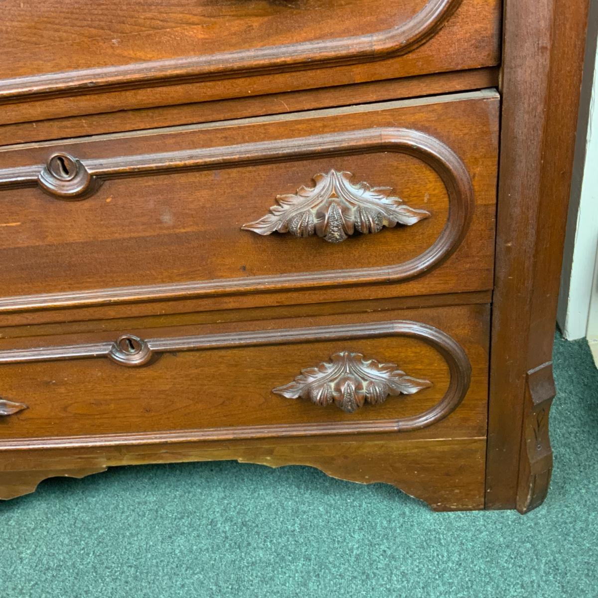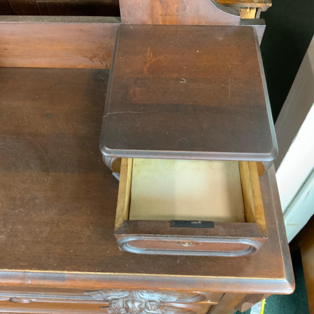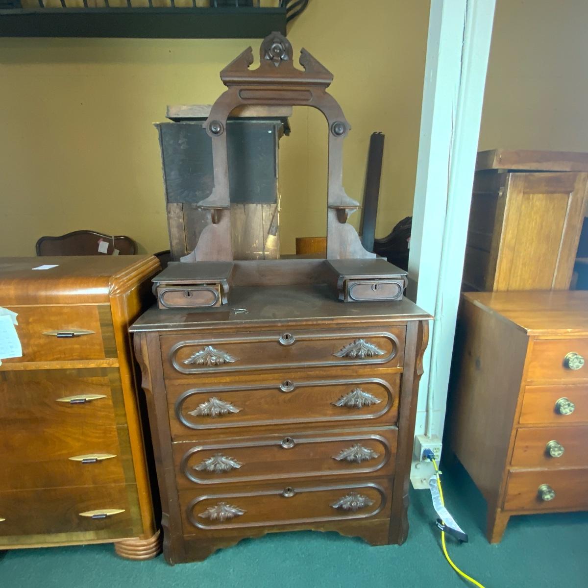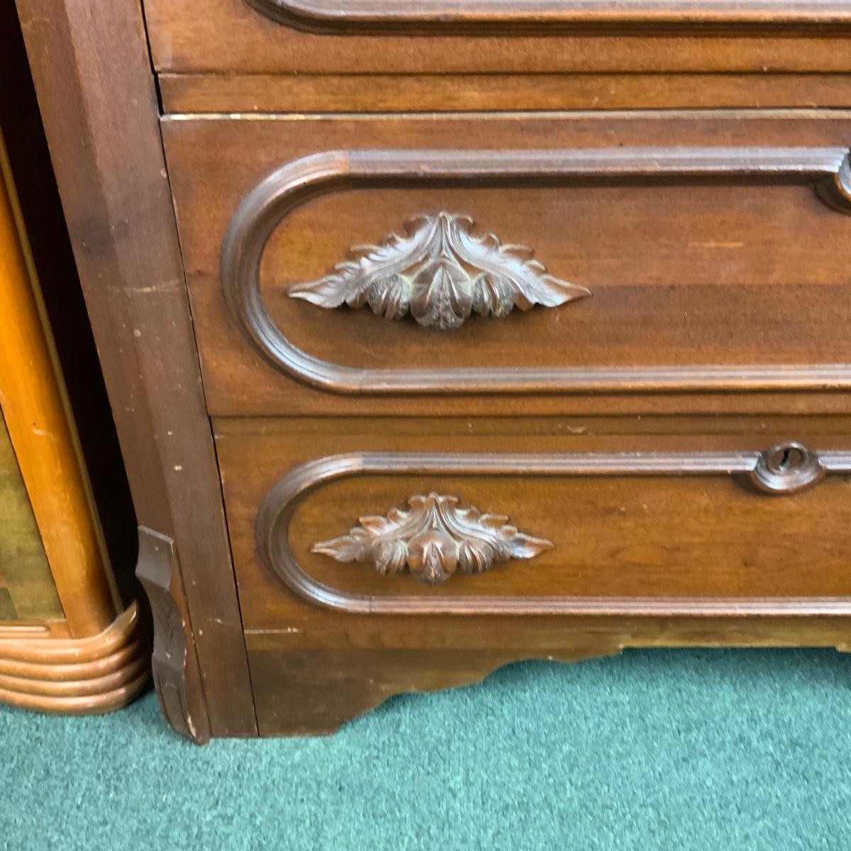 Victorian walnut dresser. Needs new mirror. Spectacular details and hand carved drawer pulls. //::\\ Please see photos for details and condition. No attempt has been made to hide any imperfections. All items listed in this auction are warehouse items, and need to be cleaned. A majority of the items need restoration as well. All items are sold AS IS and WITHOUT GUARANTEE. If you are uncertain about an item, DO NOT BID. Due to the nature of this online auction in-person inspection is HIGHLY recommended. All Sales are FINAL. Pick Up Times are FIRM. Please confirm with your own schedule that you can pick up in the scheduled times listed in the Terms and Conditions. Any questions please message the auctioneer. DO NOT Contact The Harp Gallery.
