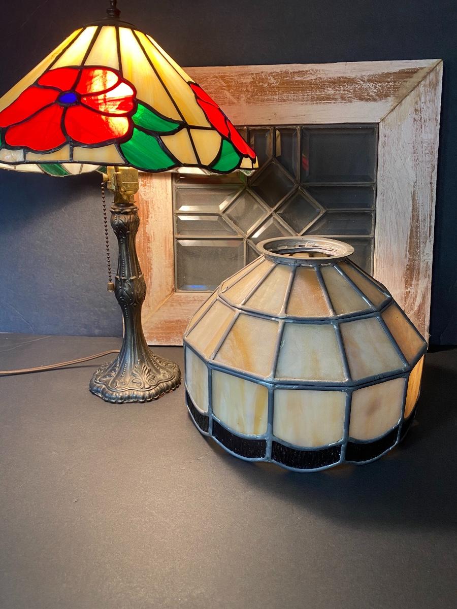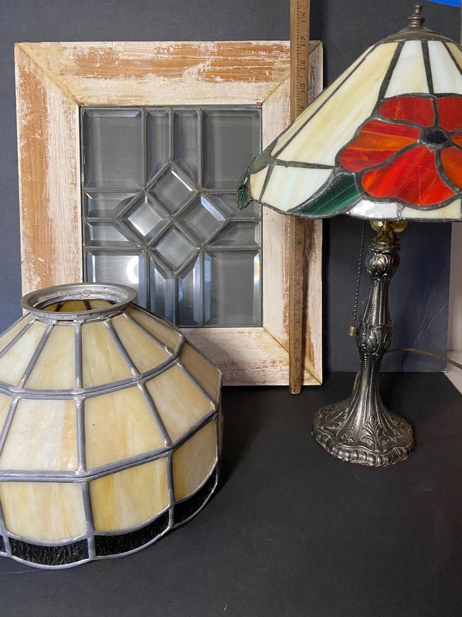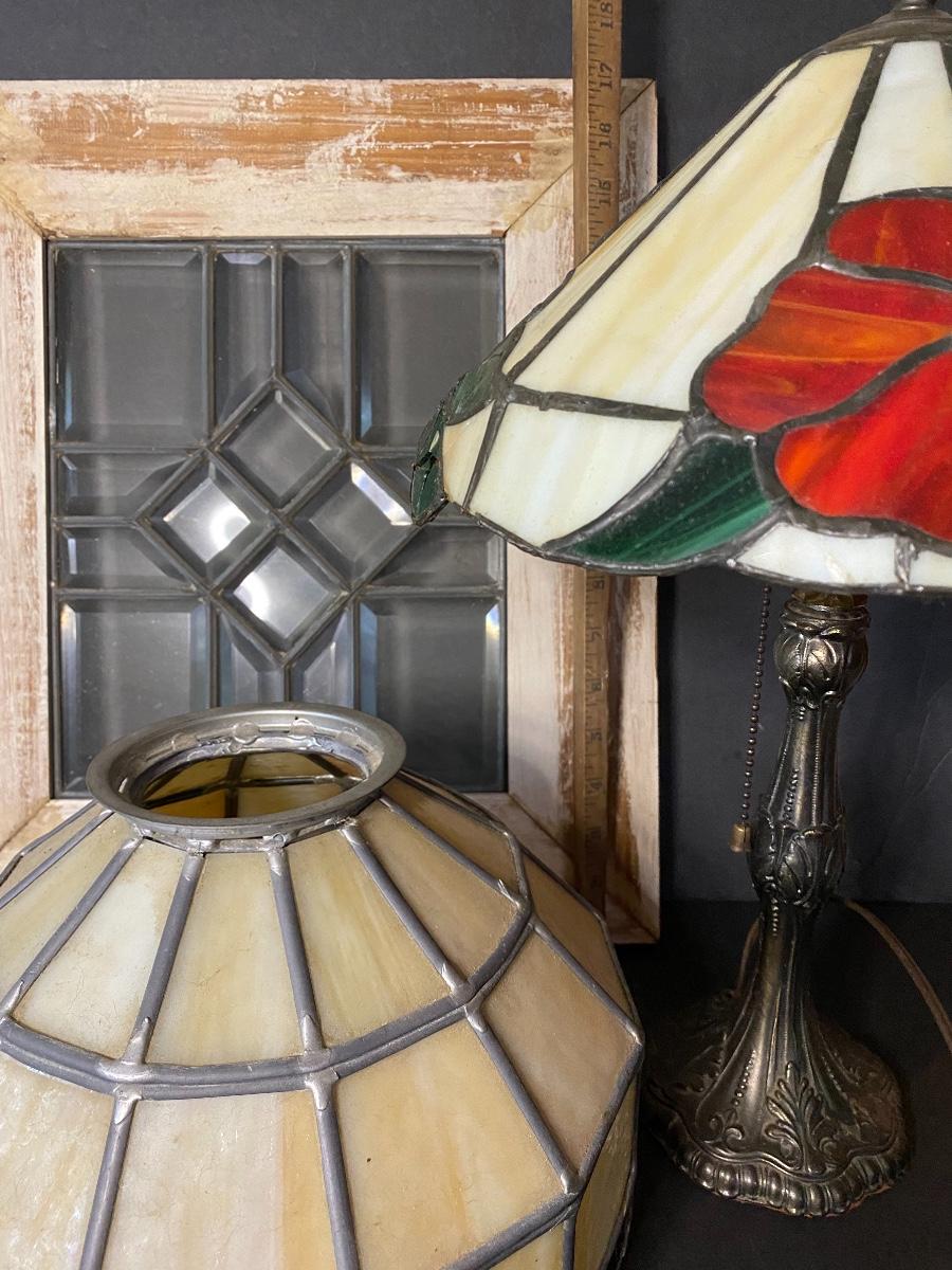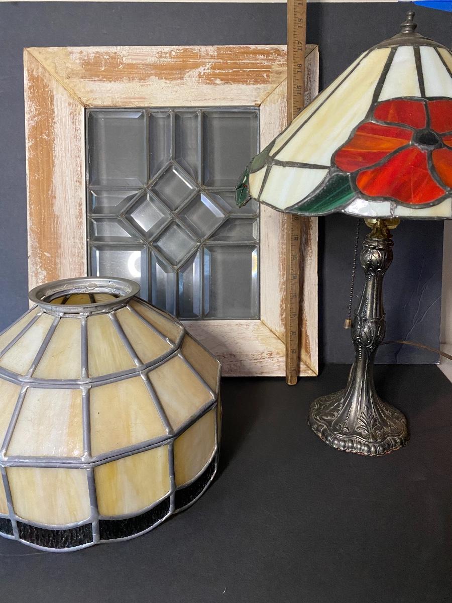 Antique leaded glass window panel that has been framed. Gorgeous! Also included is a stained glass lamp with vibrant colors but unfortunately has damage to the glass, and an extra shade. Please see all pictures as they are the best representation of the items. The pictures show condition, measurements if taken, and what is included in the lot. Due to the large amount that we photograph and the time frame, we are not always able to take measurements. All items unless noted, are pre-owned and have been used. If you purchased furniture, you must bring help. We do not allow one person to carry large furniture out on their own. Bring help, tools and a truck for the safety of our client’s homes, and your personal safety. Company policy. Thank you.