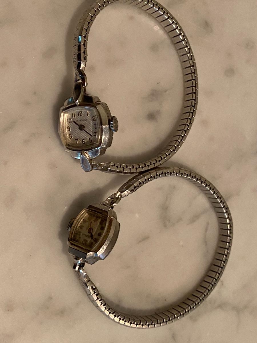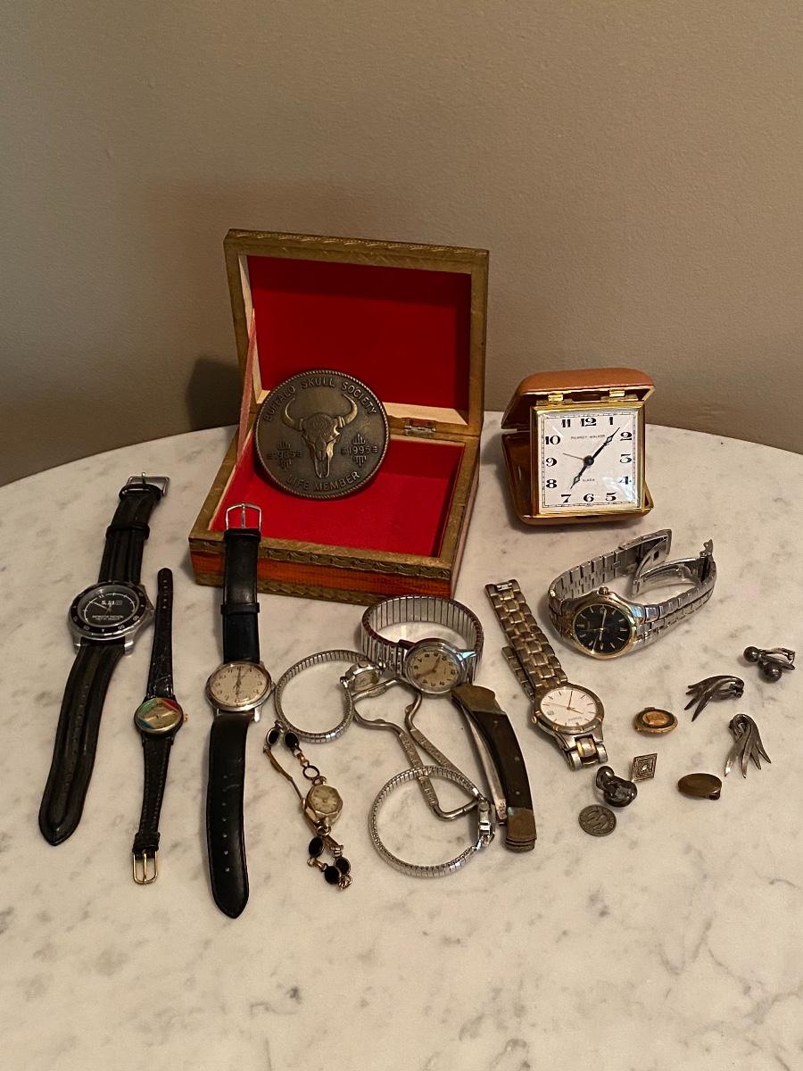 This is a great lot of antique and vintage watches and "jewelry box" finds. Please see the lot for all the fun pieces. They do show wear from age, both sets of earrings are marked Sterling on back. Please see all pictures as they are the best representation of the items. The pictures show condition, measurements if taken, and what is included in the lot. Due to the large amount that we photograph and the time frame, we are not always able to take measurements. All items unless noted, are pre-owned and have been used. If you purchased furniture, you must bring help. We do not allow one person to carry large furniture out on their own. Bring help, tools and a truck for the safety of our client’s homes, and your personal safety. Company policy. Thank you.