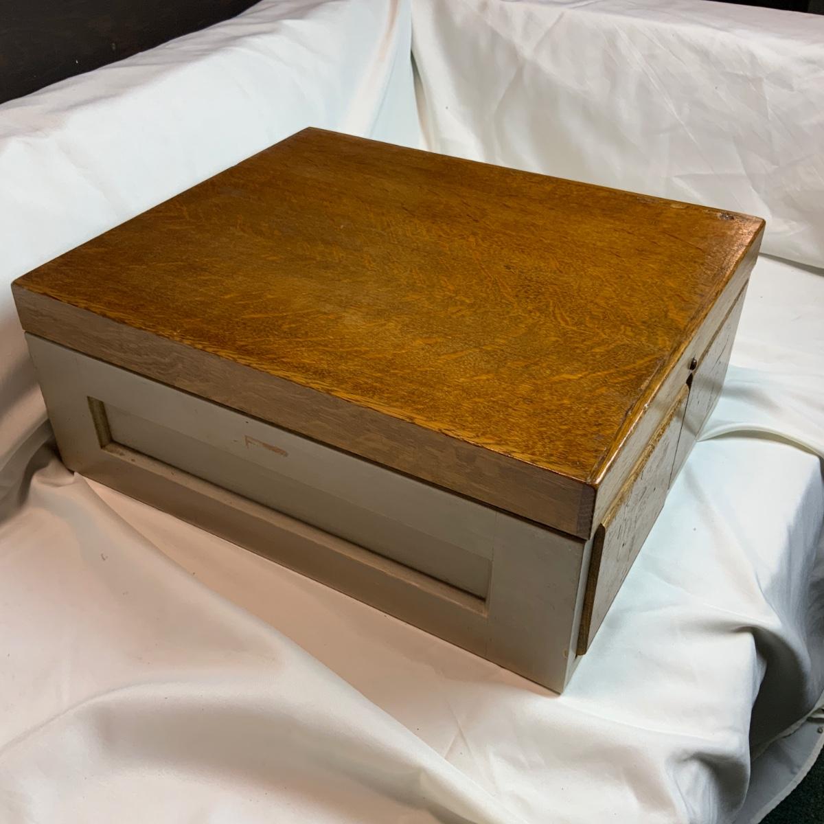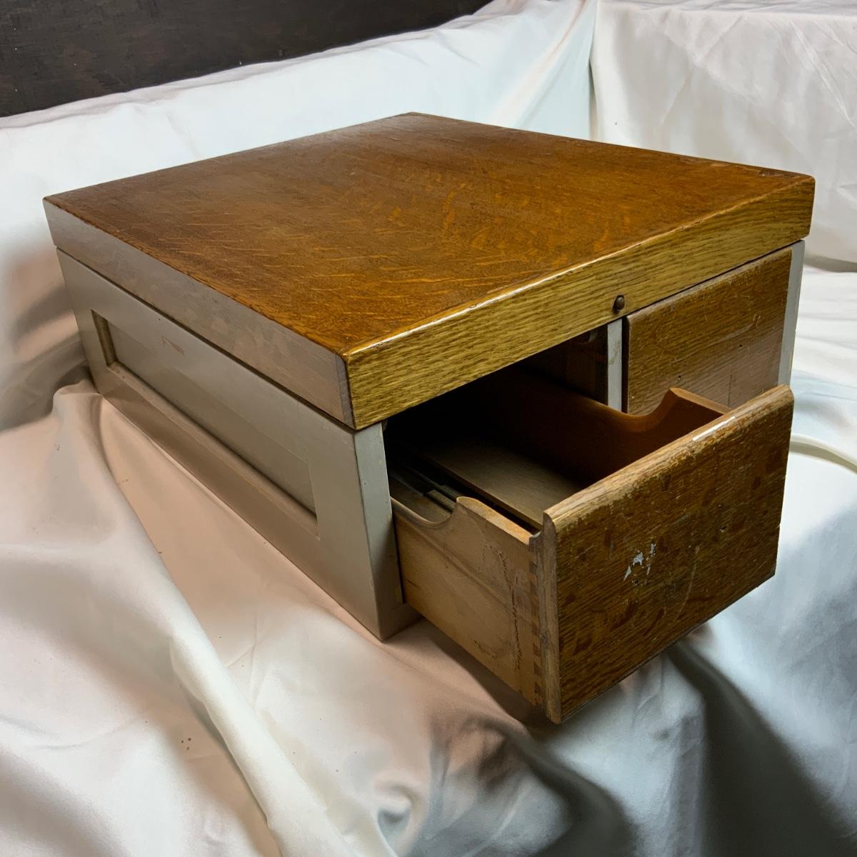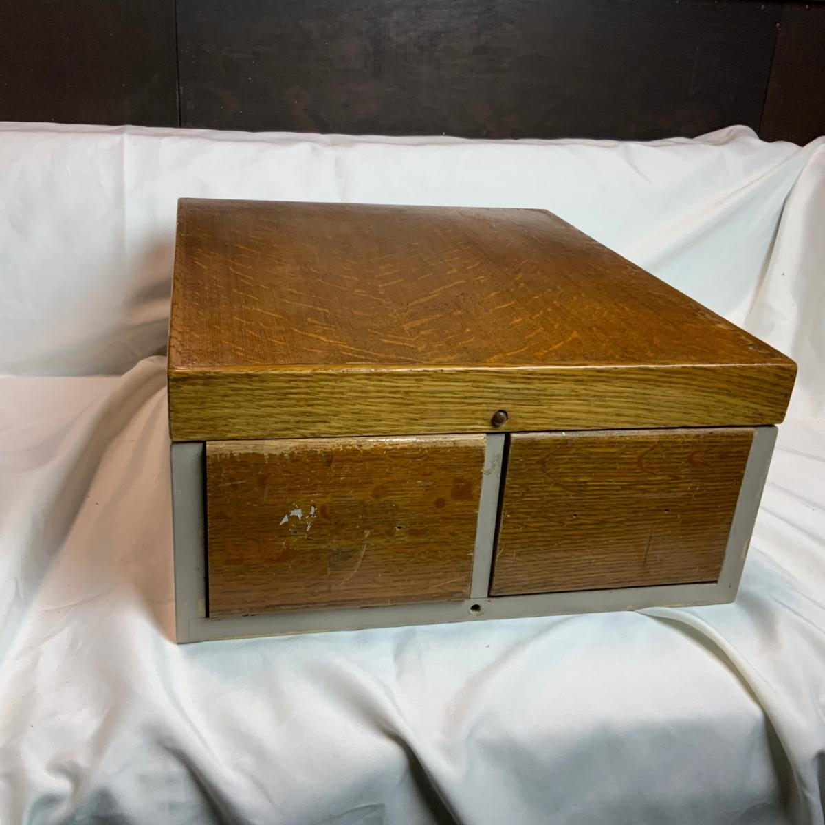 Small Metal and Wood Filing Cabinet. Small organization tool perfect for any office. There was a note on this piece indicating there is lead paint on it. Please refrain from nibbling on the paint. //::\\ Please see photos for details and condition. No attempt has been made to hide any imperfections. All items listed in this auction are warehouse items, and need to be cleaned. A majority of the items need restoration as well. All items are sold AS IS and WITHOUT GUARANTEE. If you are uncertain about an item, DO NOT BID. Due to the nature of this online auction in-person inspection is HIGHLY recommended. All Sales are FINAL. Pick Up Times are FIRM. Please confirm with your own schedule that you can pick up in the scheduled times listed in the Terms and Conditions. Any questions please message the auctioneer. DO NOT Contact The Harp Gallery.