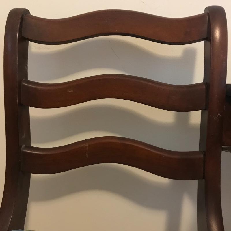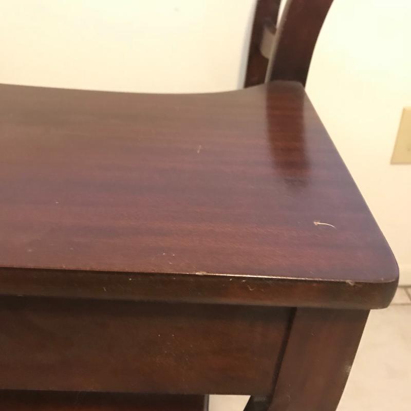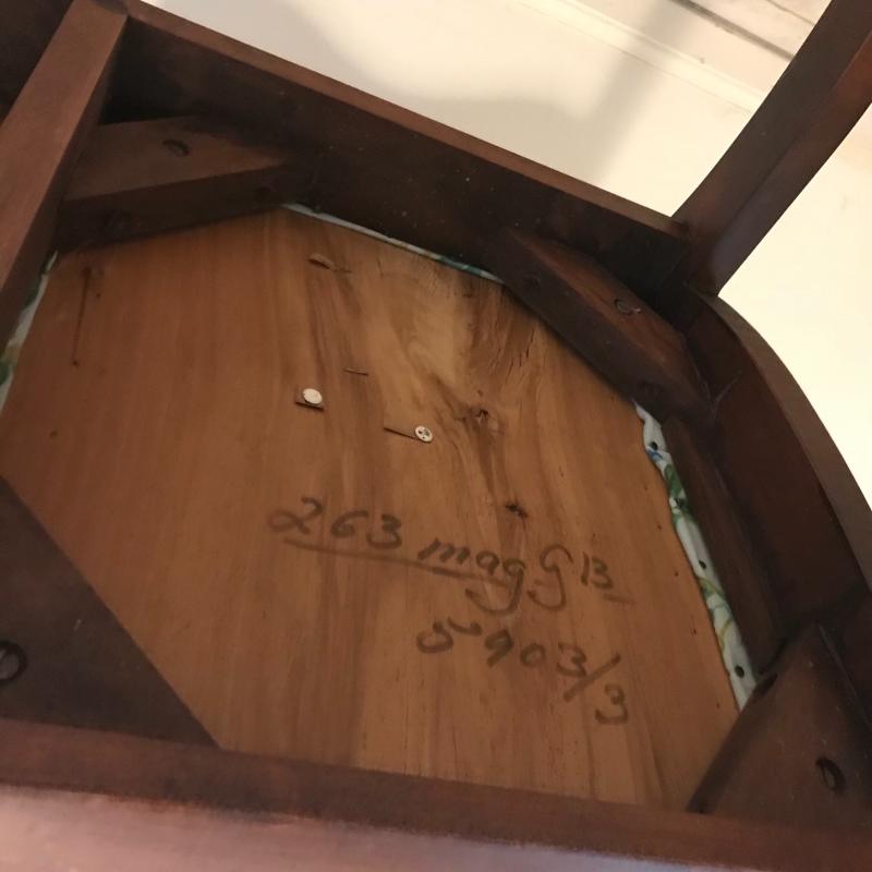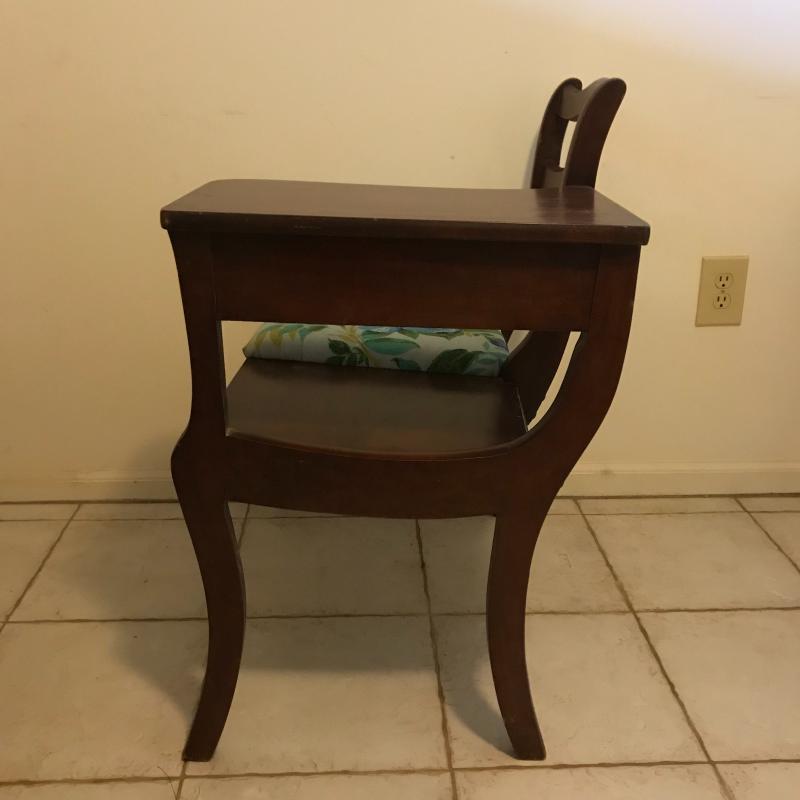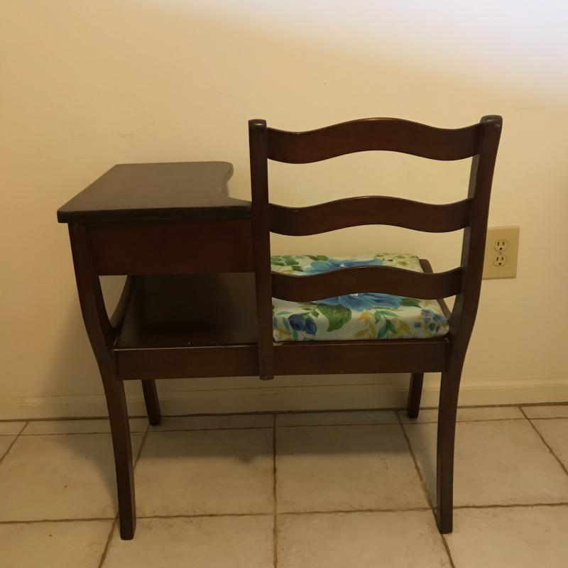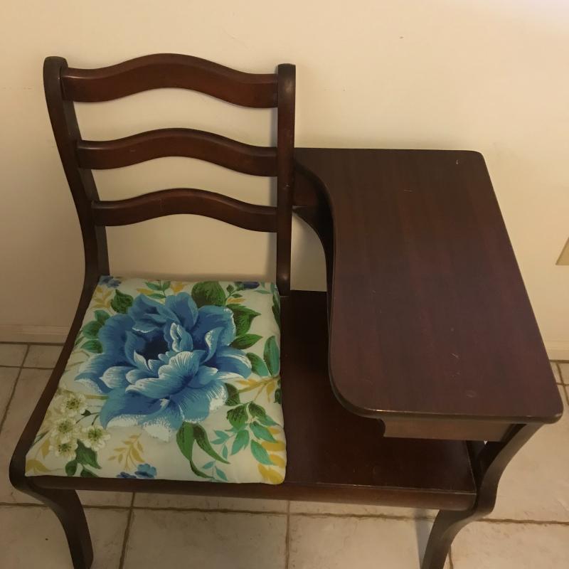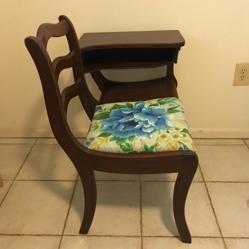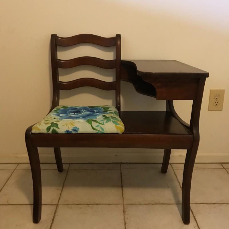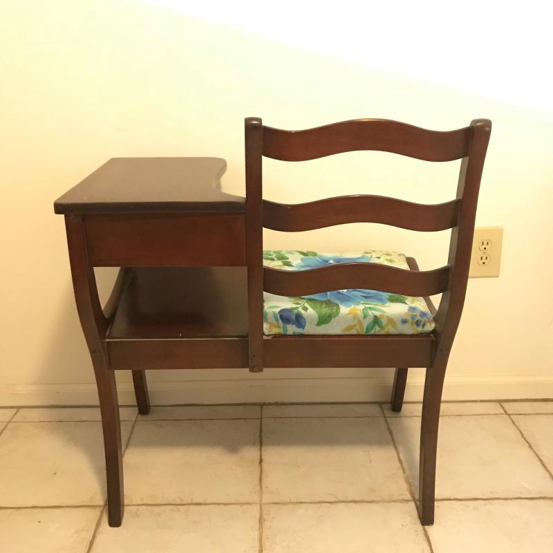 Charming little table-seat duo with a flowered cushion and dark wood finish. Complete with small organizing shelf, this sturdy piece measures approx. 27.5” x 19” x 32”. Some wear is noted in photos, but it’s in great shape overall. Local pick up only.