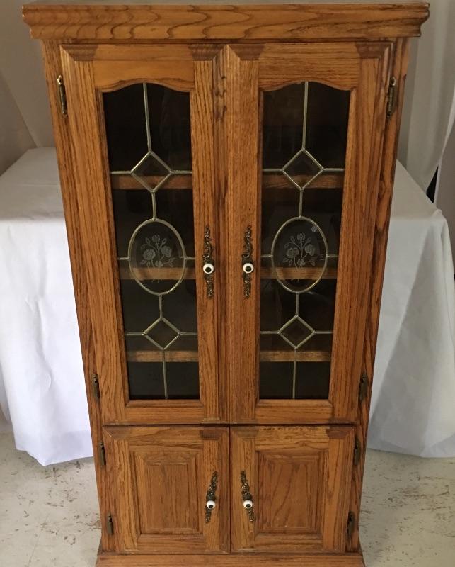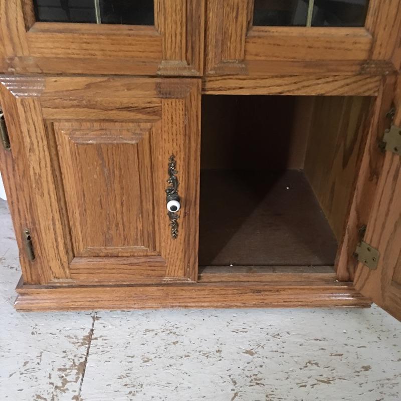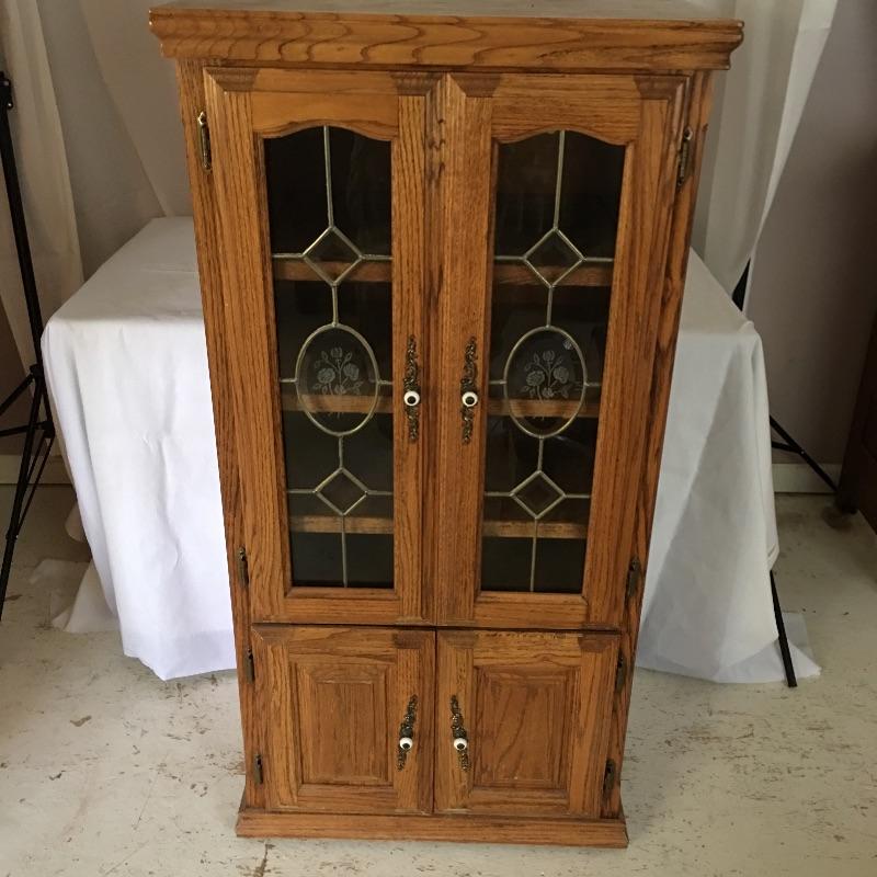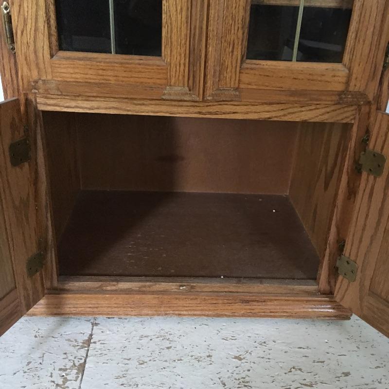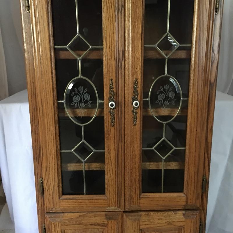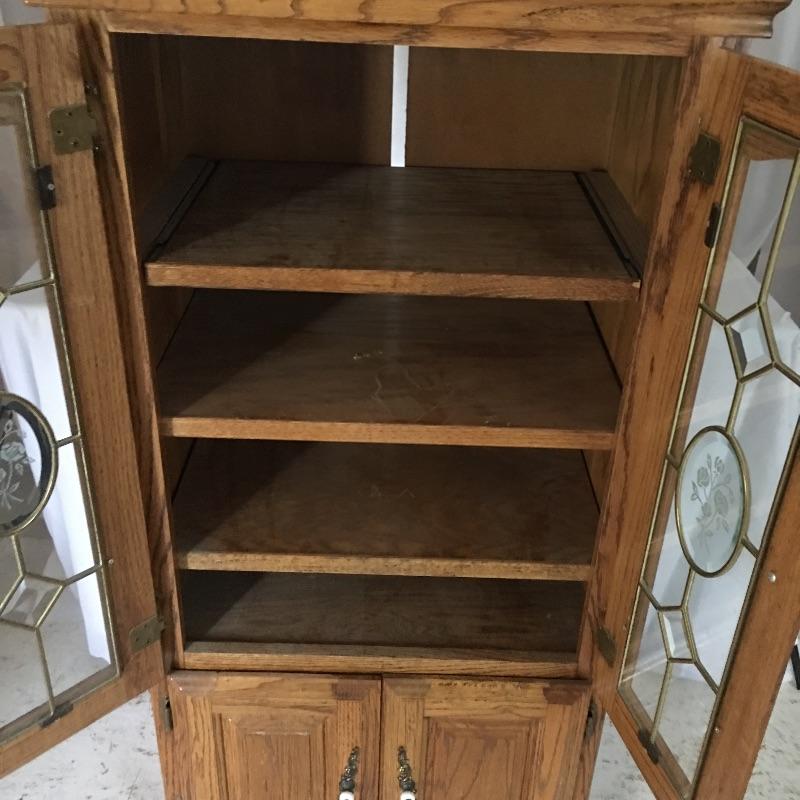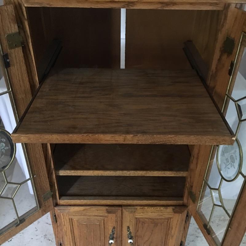 Handsome wooden cabinet with glass inserts on top doors. Cabinet has four shelves with top shelf on slides. Will need to go down small flight of stairs to move out of home.