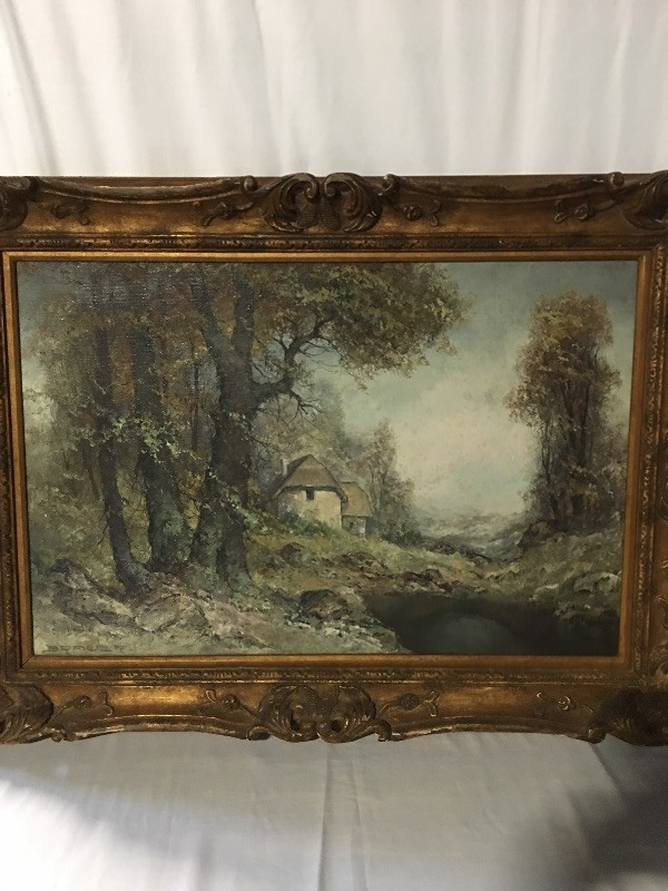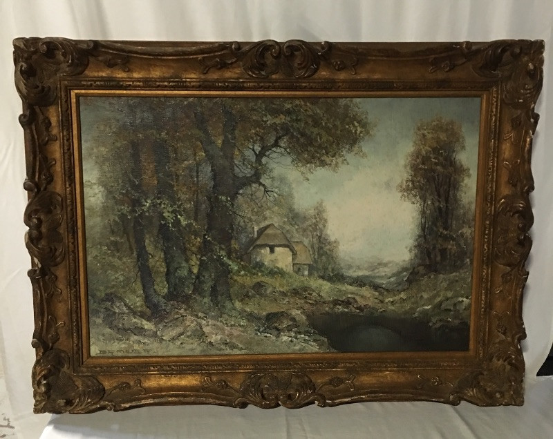 Own a piece of stunning German art with this Wilhelm Brauer original landscape oil painting on canvas depicting a cottage in the woods. It is signed and framed in a beautifully ornate gold colored frame which measures 32.5” x 44.5”.