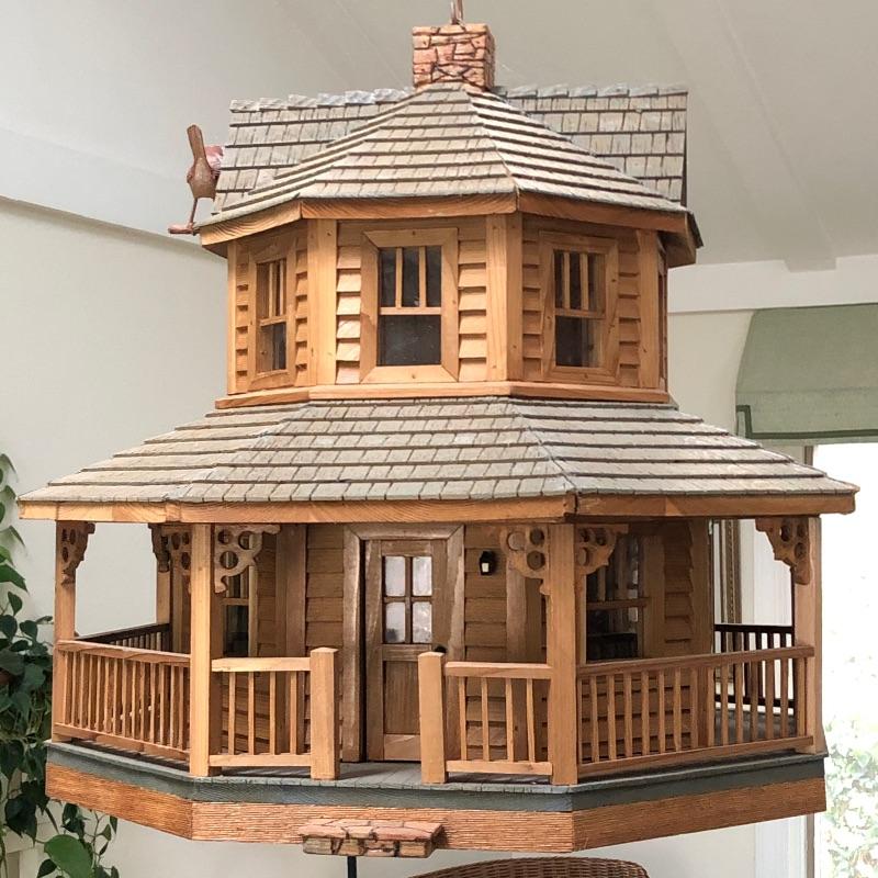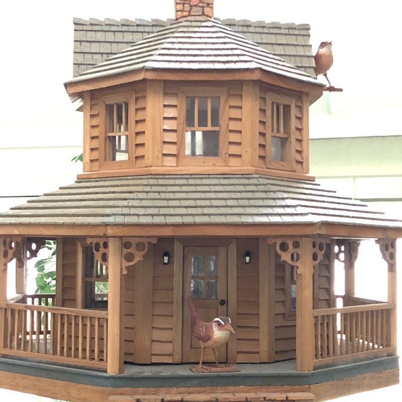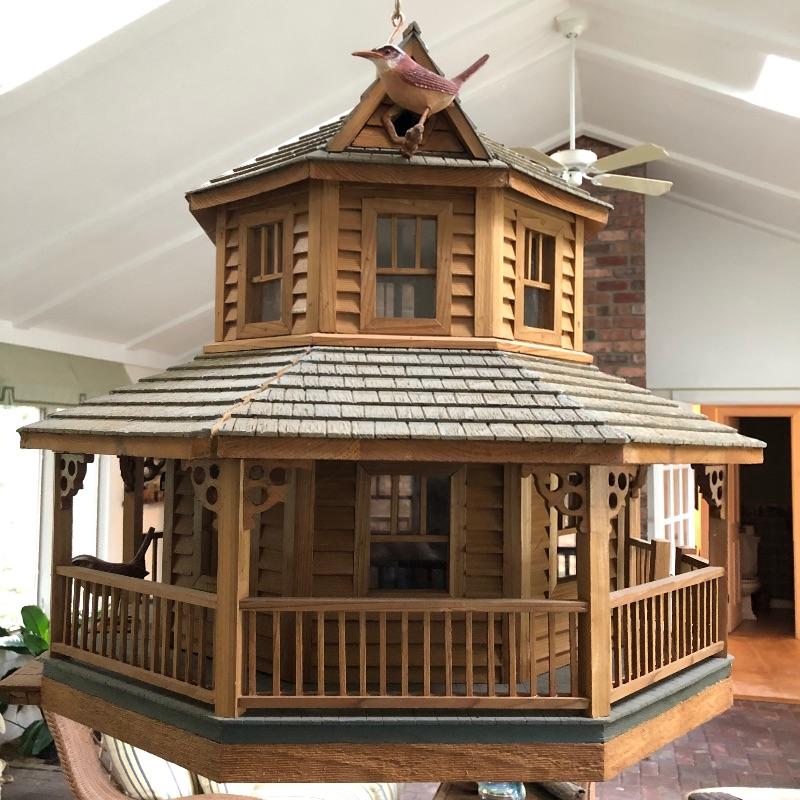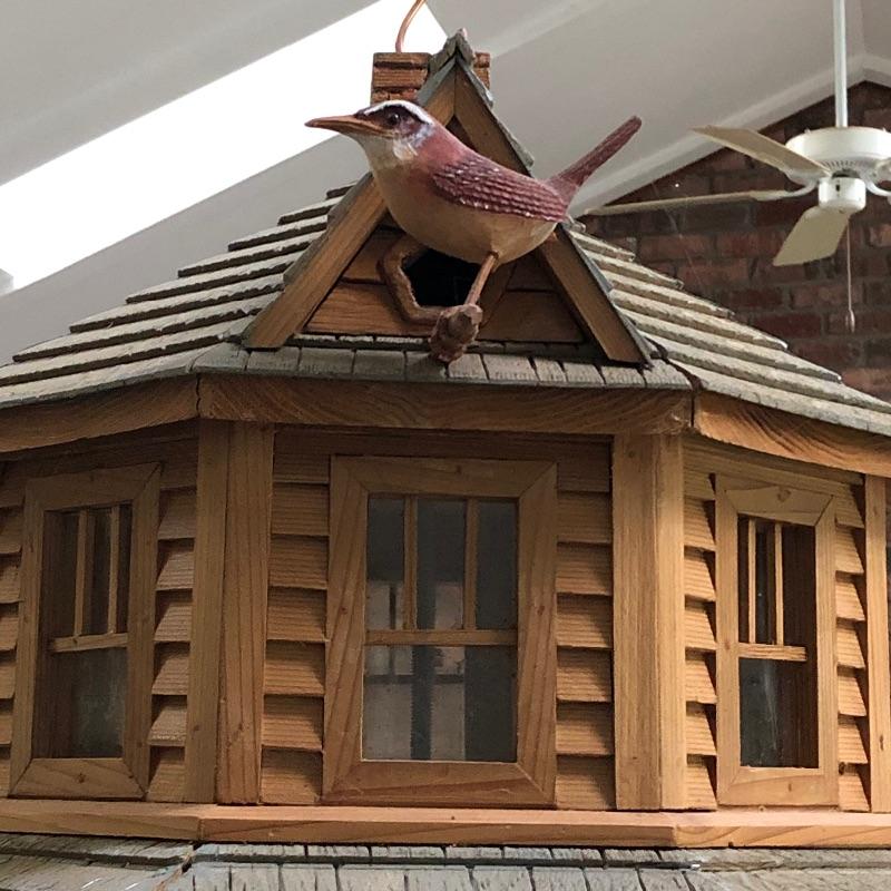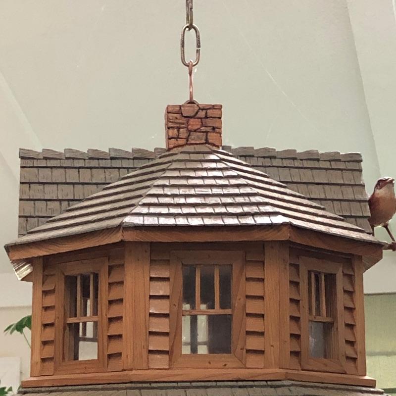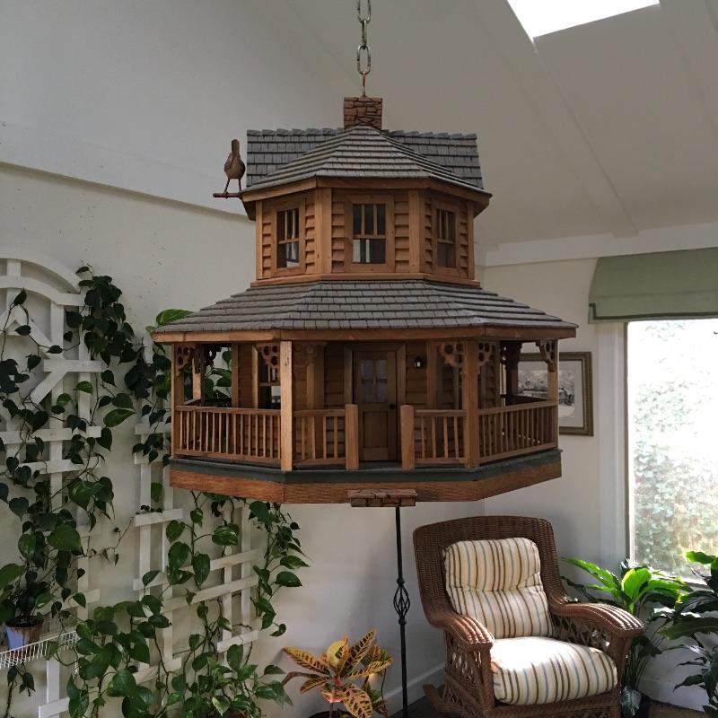 This beautifully crafted piece is not just an ordinary bird house but a full estate! It's large enough for a colony of birds to enjoy. Notice the attention to detail paid by Doug Arrowood, the builder of this lovely sanctuary measuring 25” x 28” x 25” with a hook on top with 5 foot chain if you wish to hang indoors or out. It has been kept in an indoor atrium so in good condition. No Shipping.