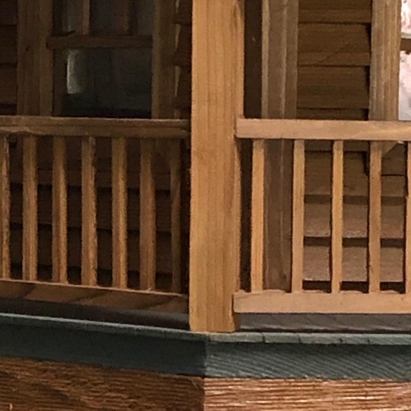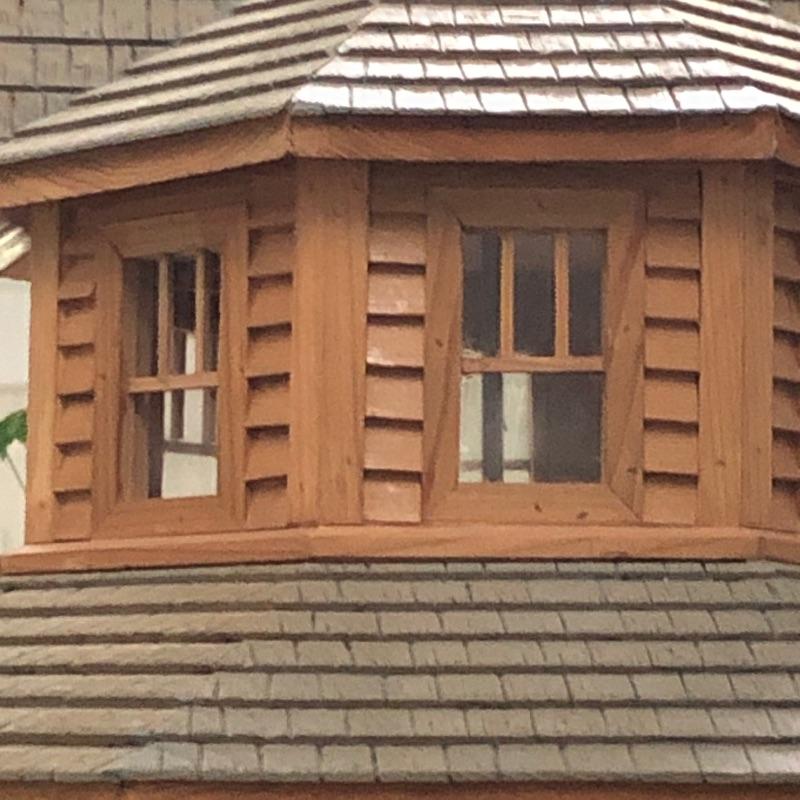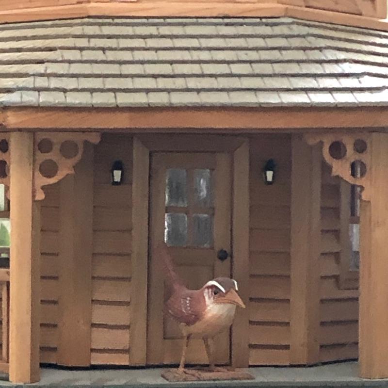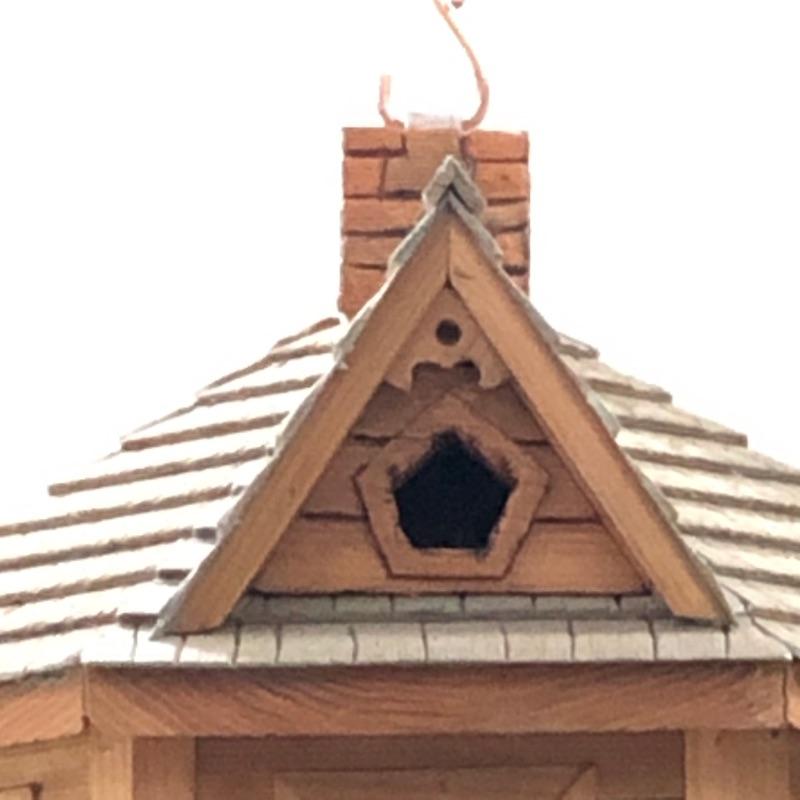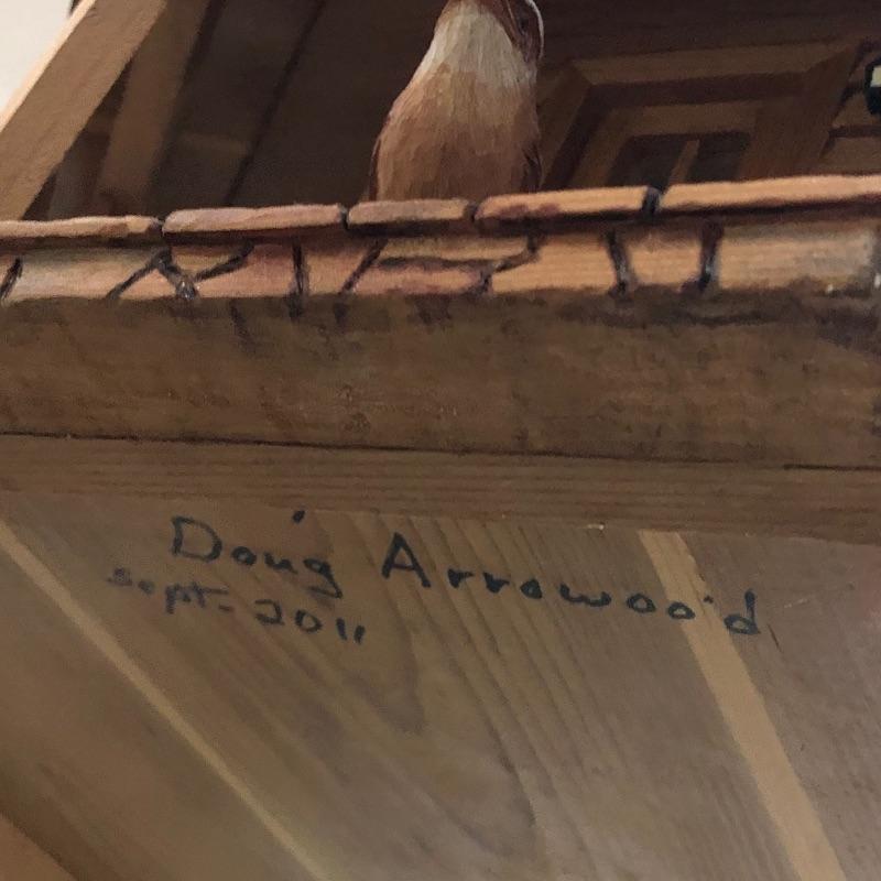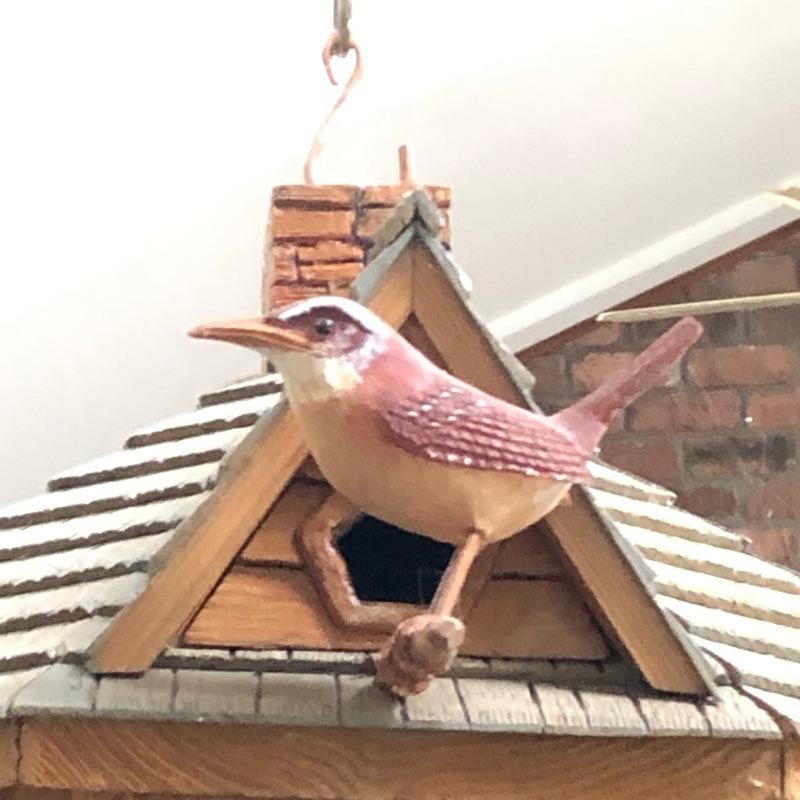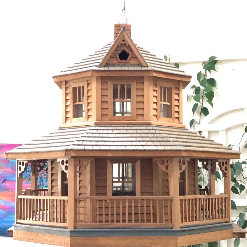 This beautifully crafted piece is not just an ordinary bird house but a full estate! It's large enough for a colony of birds to enjoy. Notice the attention to detail paid by Doug Arrowood, the builder of this lovely sanctuary measuring 25” x 28” x 25” with a hook on top with 5 foot chain if you wish to hang indoors or out. It has been kept in an indoor atrium so in good condition. No Shipping.