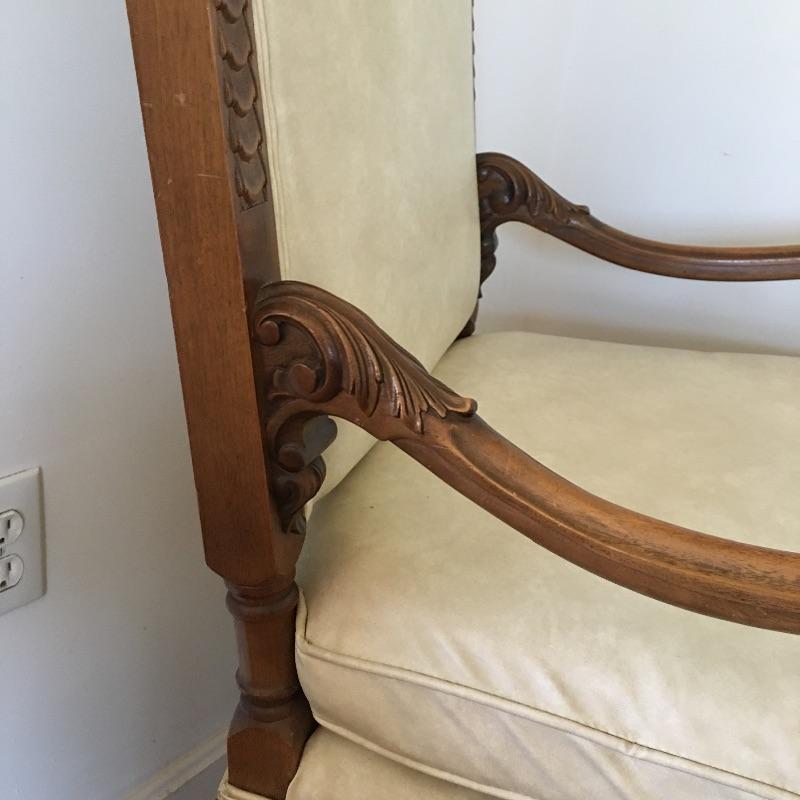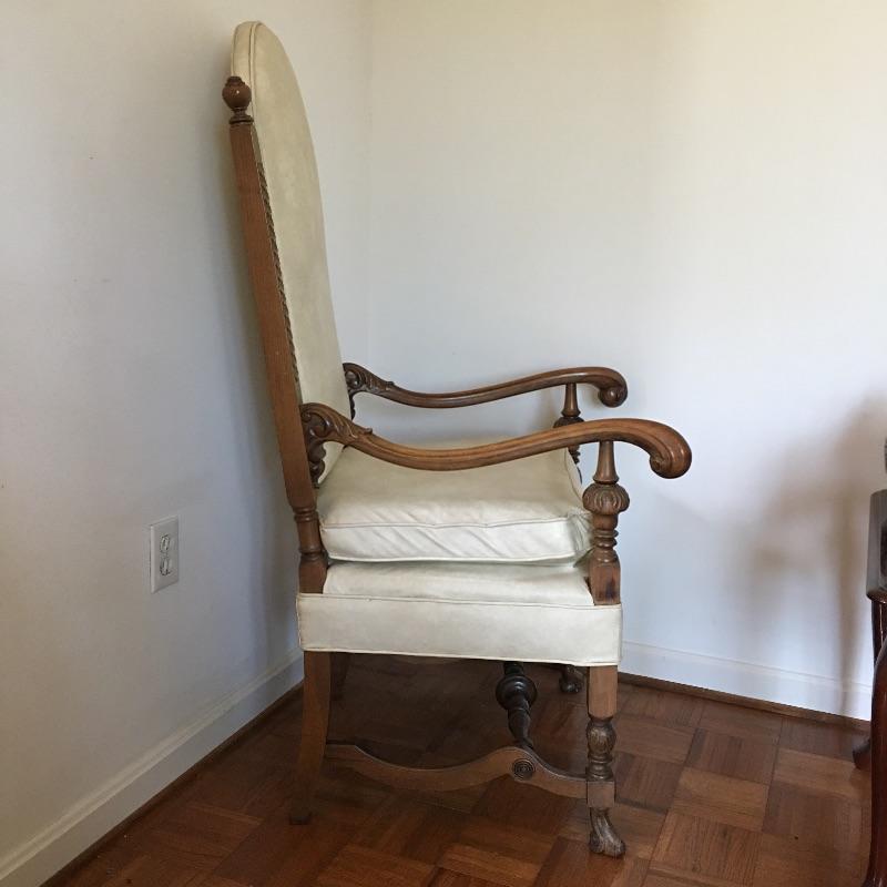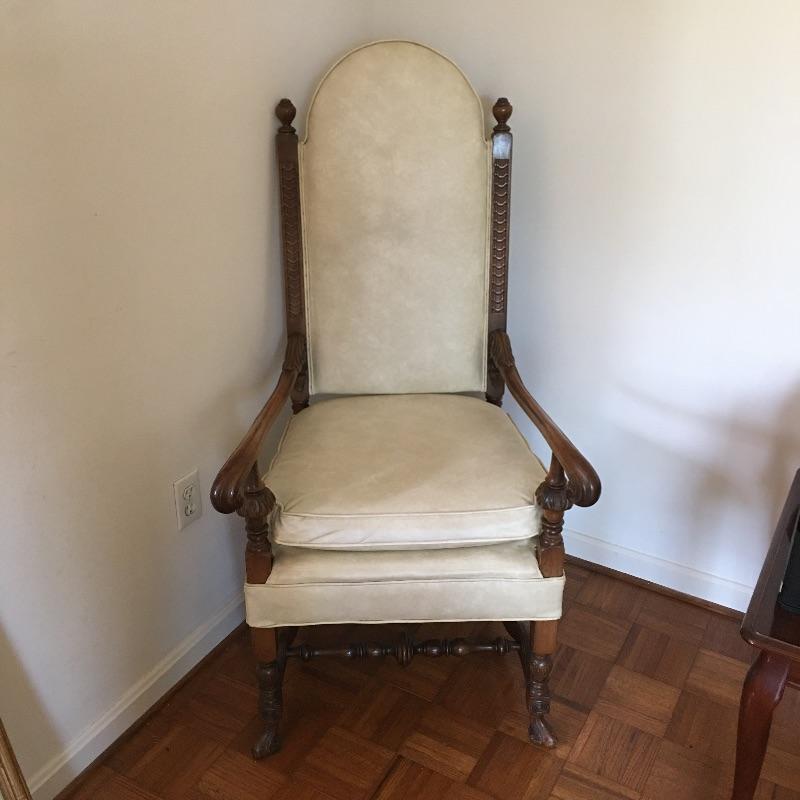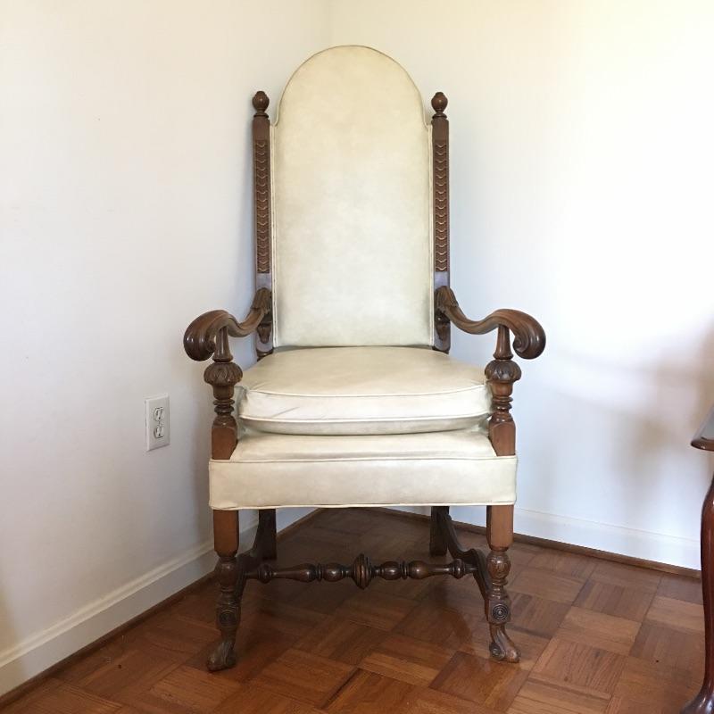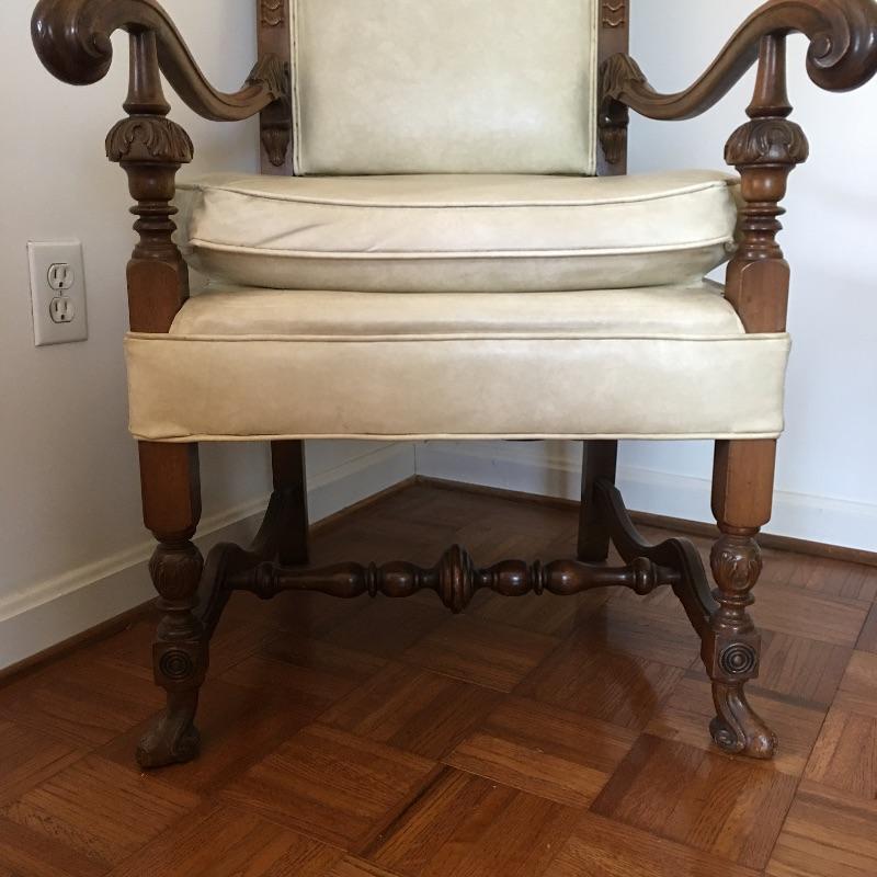 Stately arm chair for the classic look in your home. A lovely chair with a vinyl padded back and seat with intricate designs on the woodwork. Imagine yourself reading a book by the fireplace in this nice comfortable chair. Chair measures 26” x 27” x 51” with a 22” seat height.