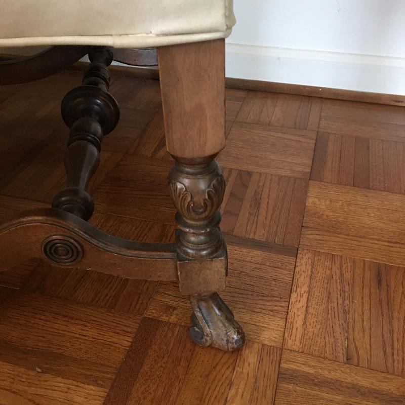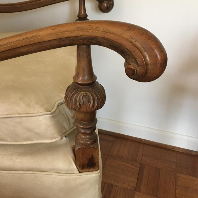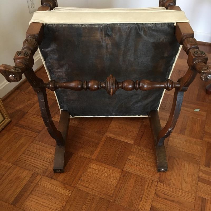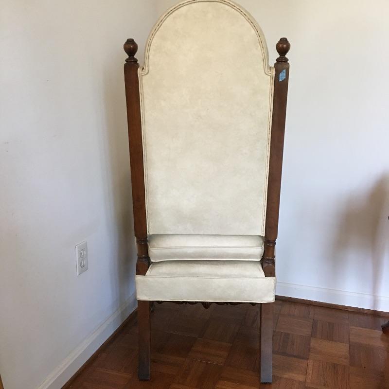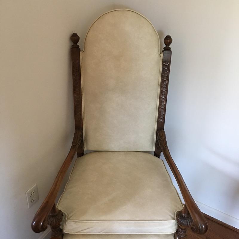 Stately arm chair for the classic look in your home. A lovely chair with a vinyl padded back and seat with intricate designs on the woodwork. Imagine yourself reading a book by the fireplace in this nice comfortable chair. Chair measures 26” x 27” x 51” with a 22” seat height.