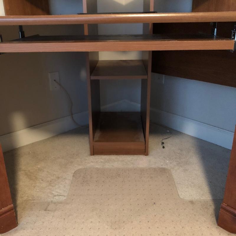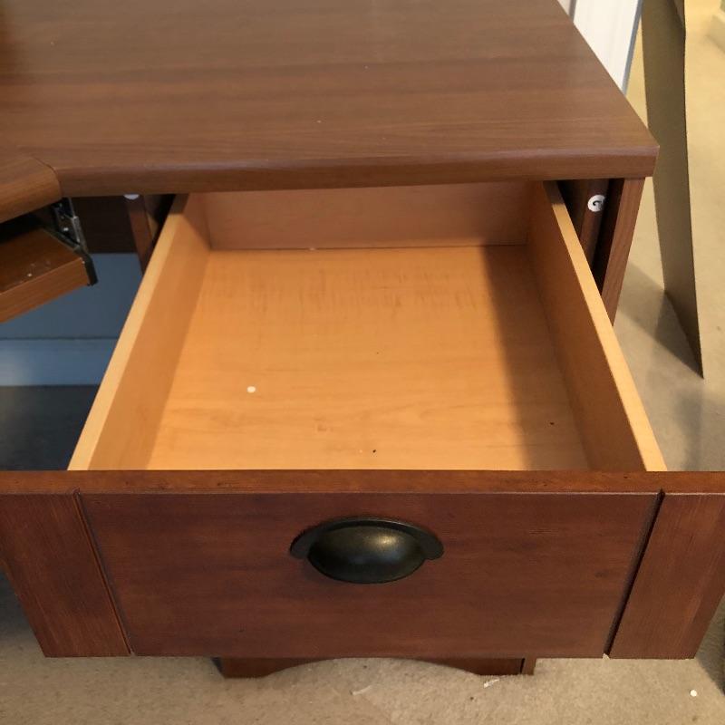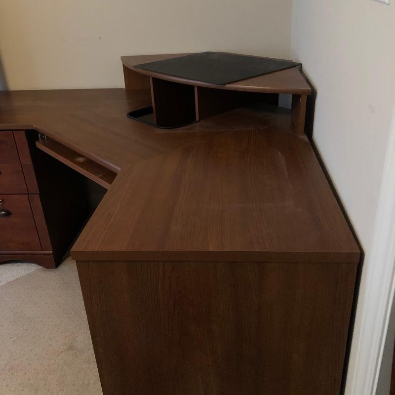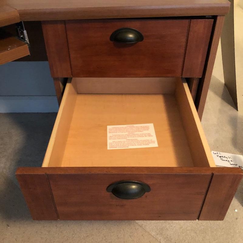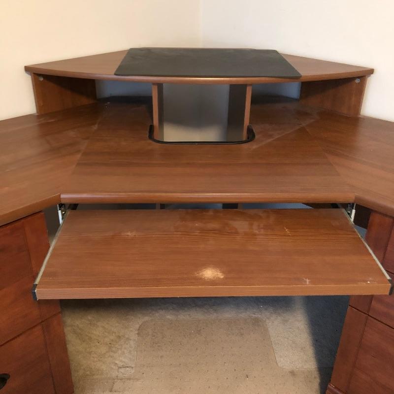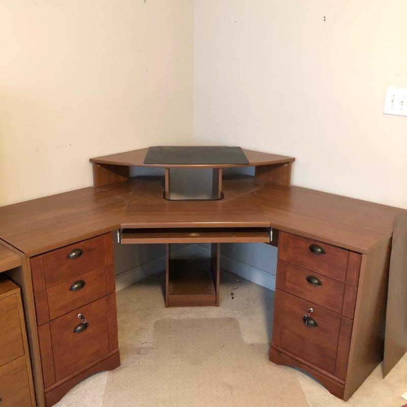 Do you have an at-home office that you’re looking to spruce up, then look no further! This pressed wood desk (61 x 34 x 36) is in great condition, with very little scratches and cracks. If you are sitting at the desk, the right side and left sides measure 18x24x30 inches. The center section 27x39x29 inches. It comes with an elevated surface for a computer to sit on, and an under-the-desk keyboard drawer that rolls out. The keyboard board has a worn spot on the surface. The left and right side drawers are identical, two smaller drawers and a hanging file drawer. It also comes with a plastic mat that sits beneath it so that your chair doesn’t damage the floor! Everything you need for an at-home office desk space.