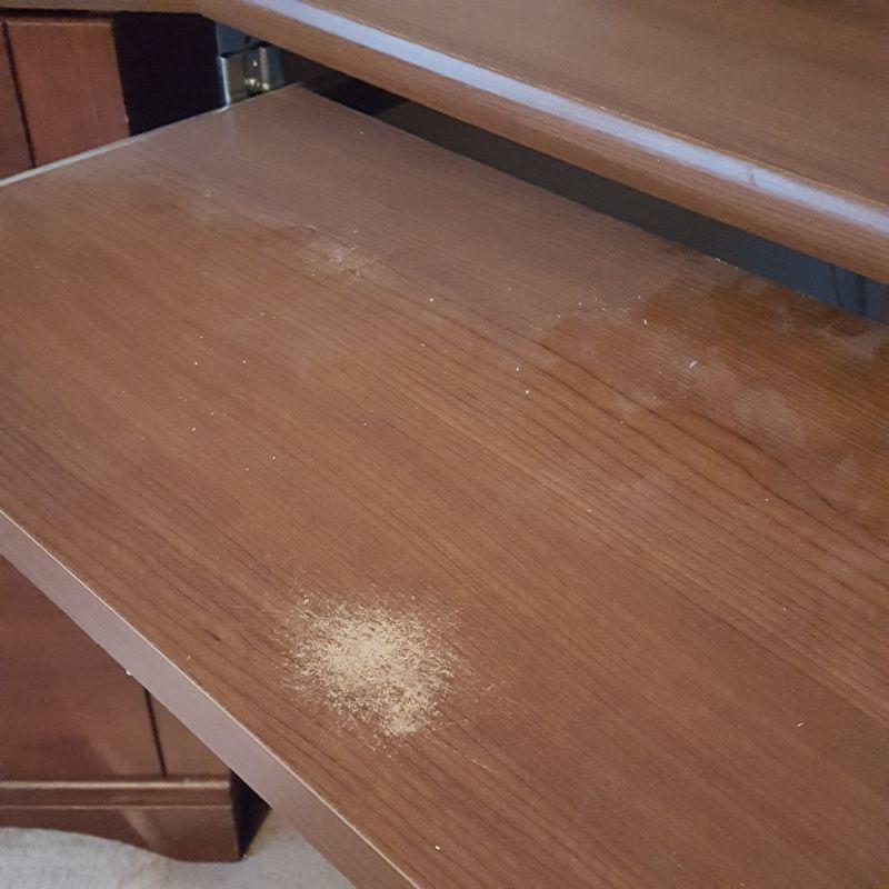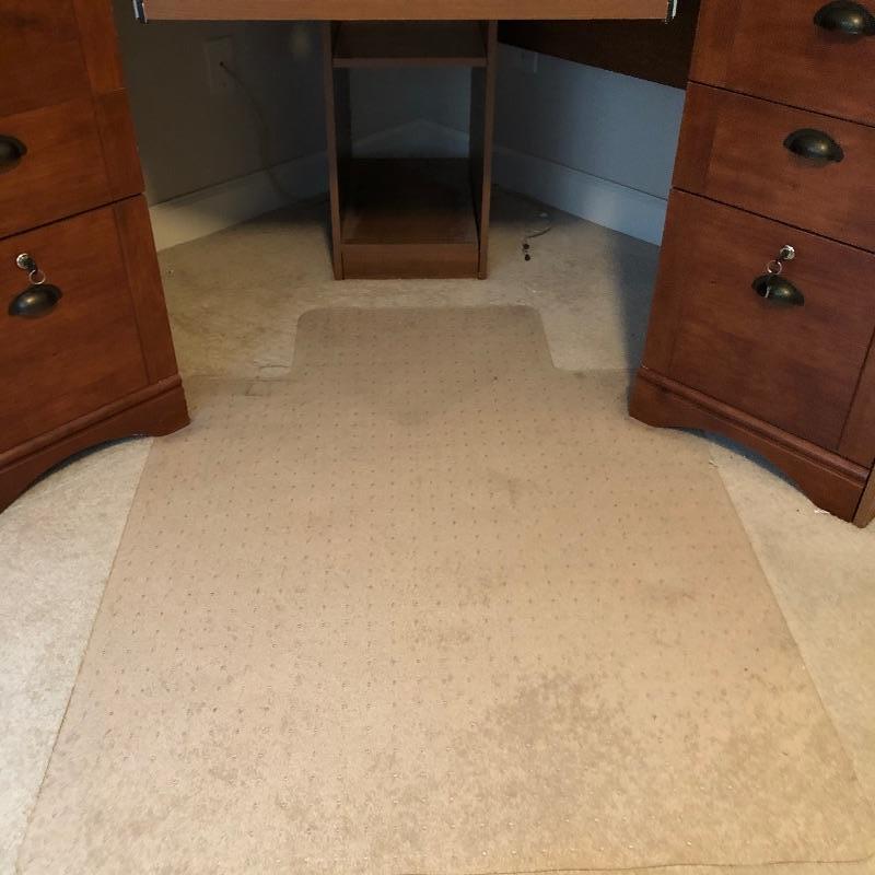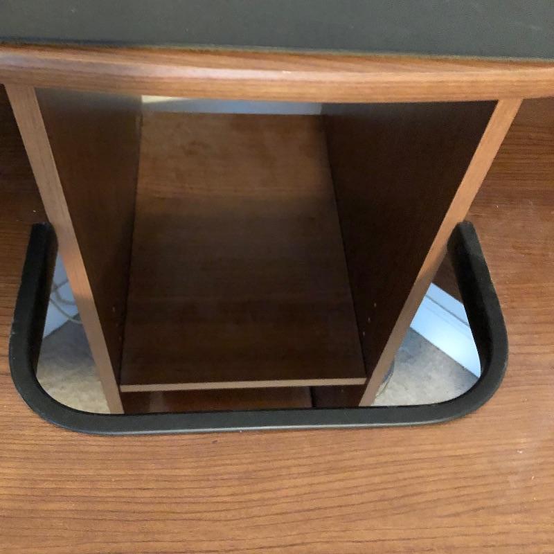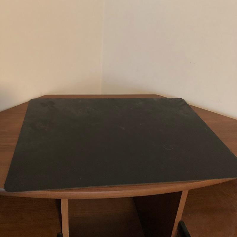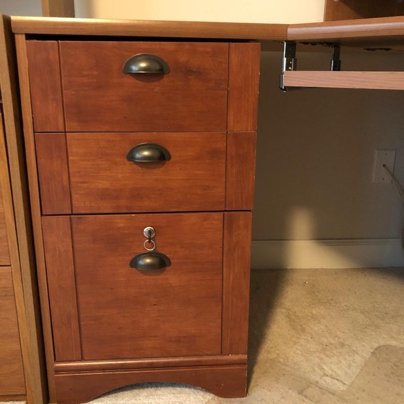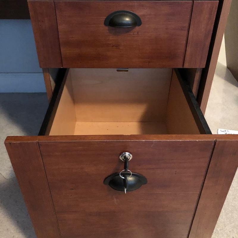 Do you have an at-home office that you’re looking to spruce up, then look no further! This pressed wood desk (61 x 34 x 36) is in great condition, with very little scratches and cracks. If you are sitting at the desk, the right side and left sides measure 18x24x30 inches. The center section 27x39x29 inches. It comes with an elevated surface for a computer to sit on, and an under-the-desk keyboard drawer that rolls out. The keyboard board has a worn spot on the surface. The left and right side drawers are identical, two smaller drawers and a hanging file drawer. It also comes with a plastic mat that sits beneath it so that your chair doesn’t damage the floor! Everything you need for an at-home office desk space.