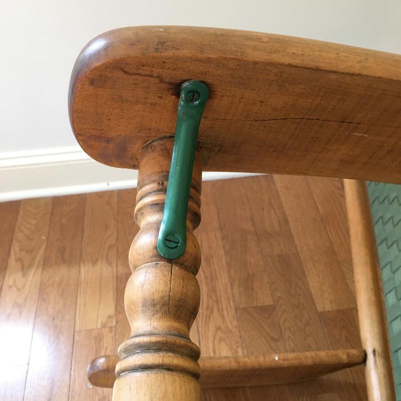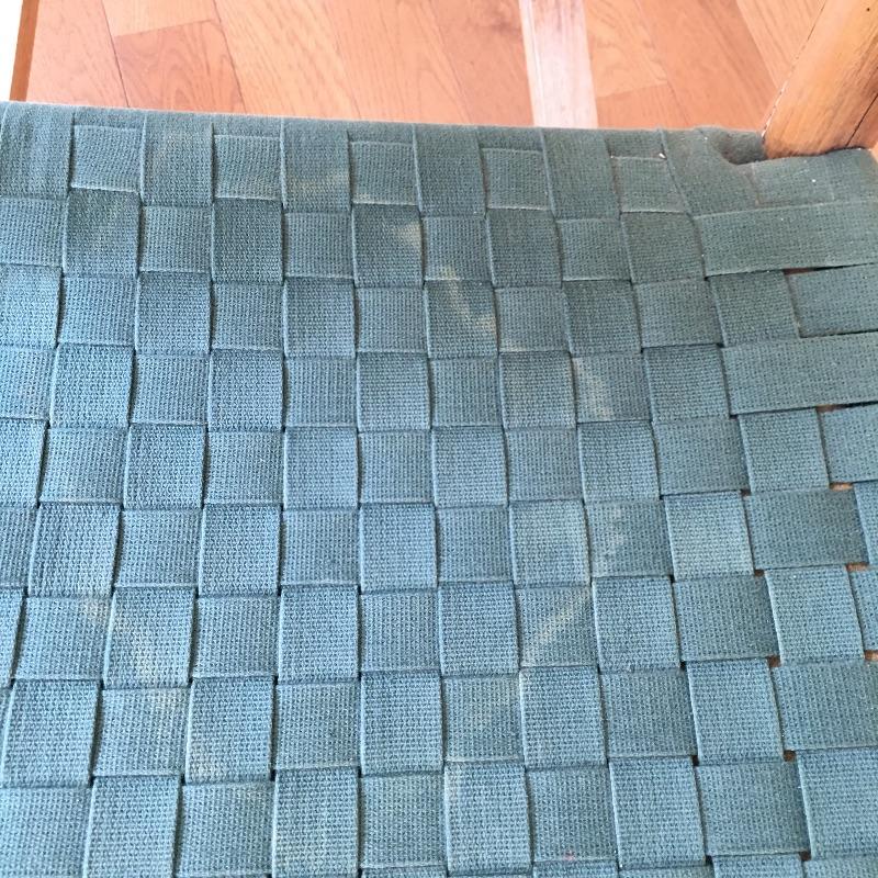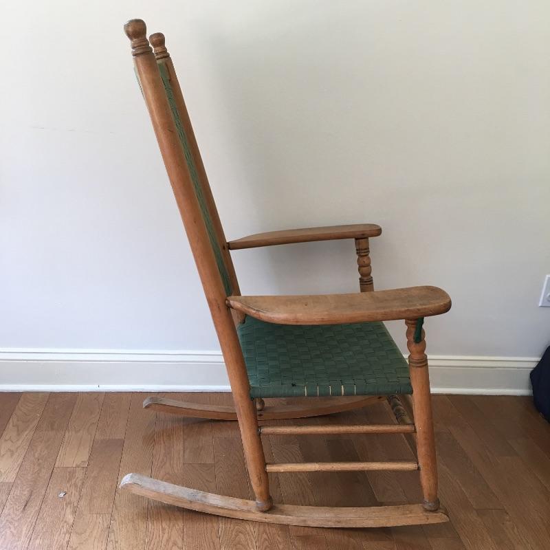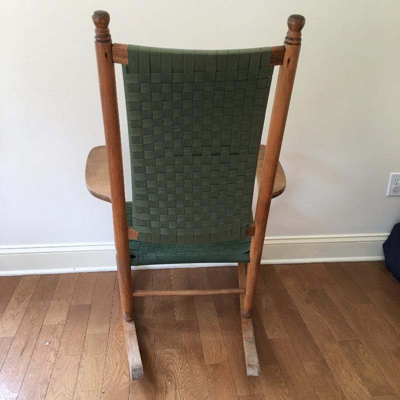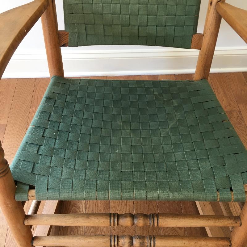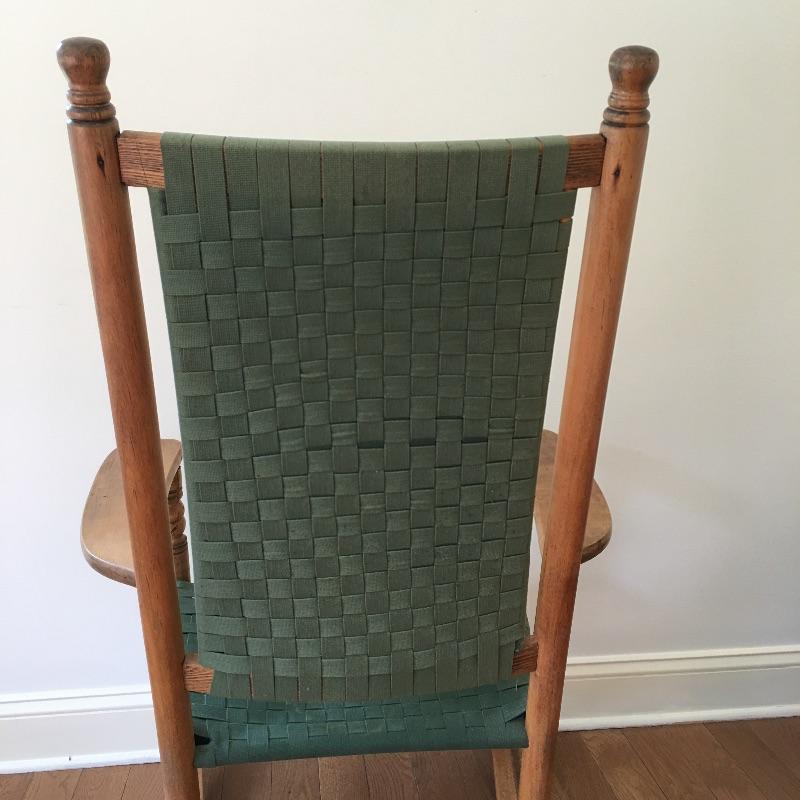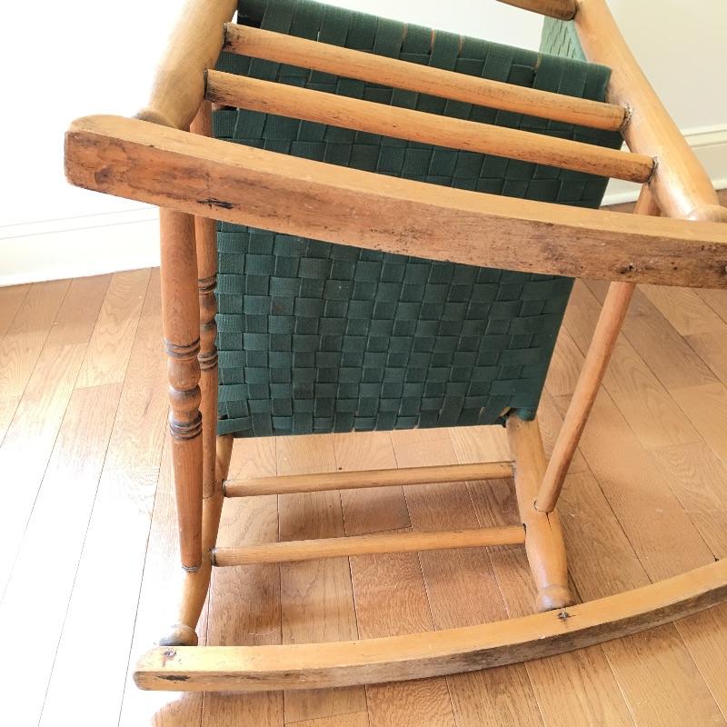 Wooden rocking chair with green webbing. Sit back and enjoy a relaxing rock on your comfortable rocker. Webbing on chair has a few spots of fading and one piece is frayed, see pictures.
