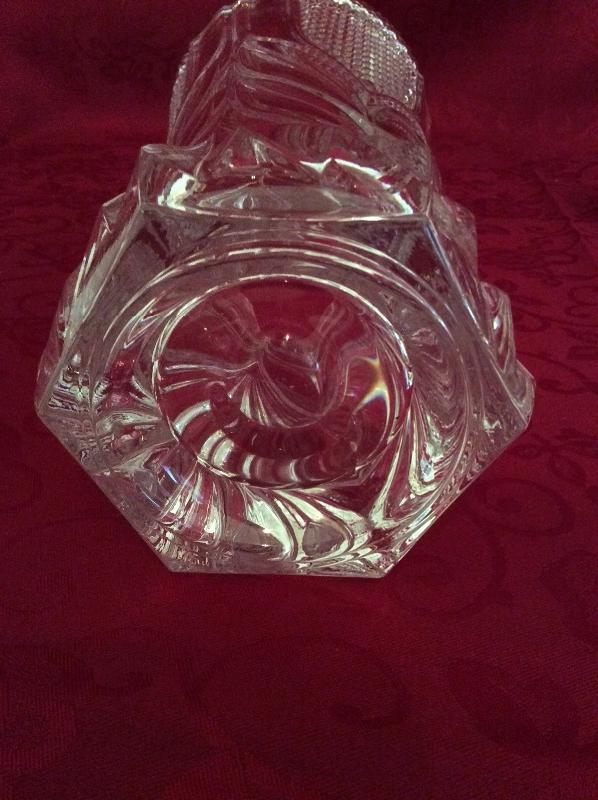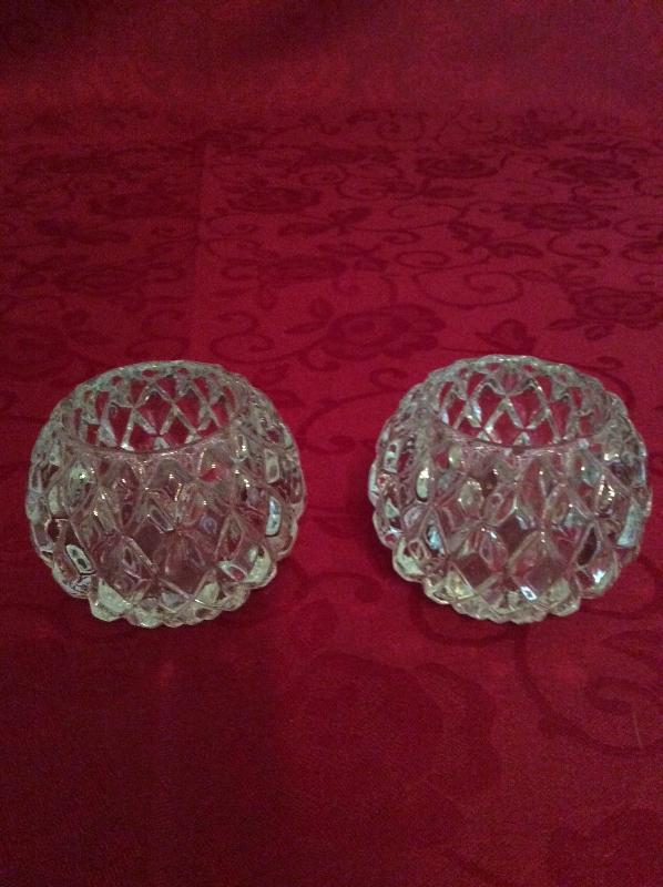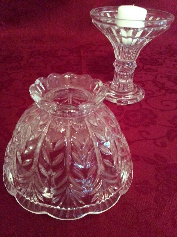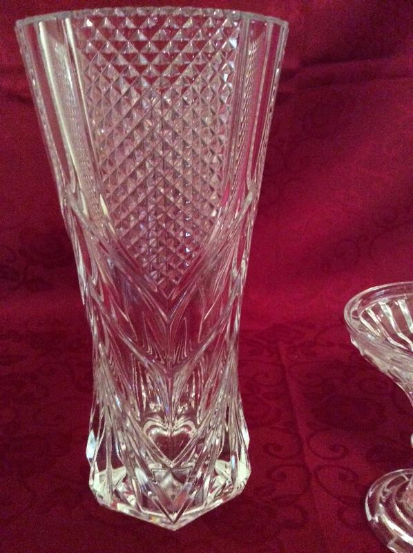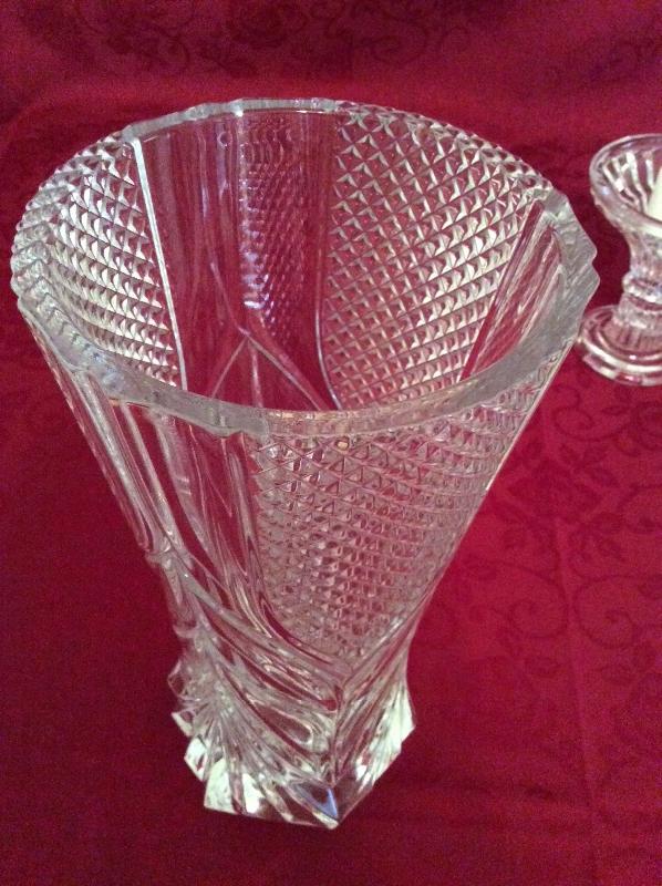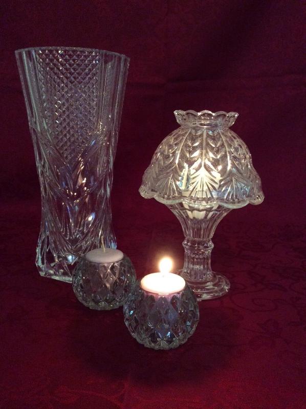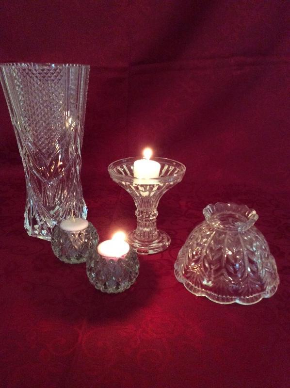Vintage glass vase, votive candle glass dish and two votive glass containers. This is a very attractive lot.
