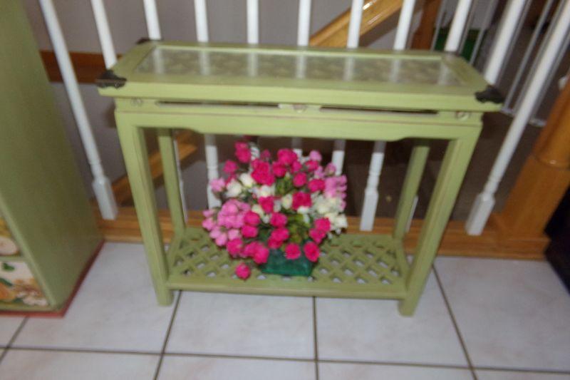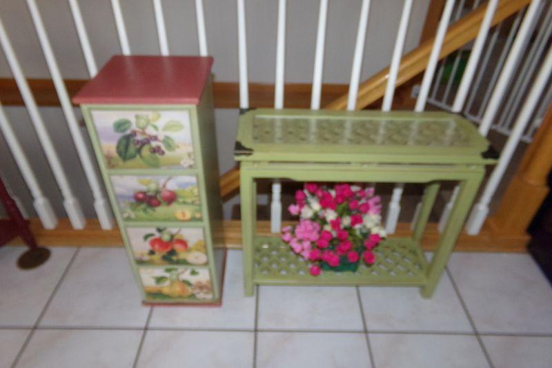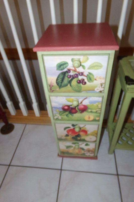 CHEST HAS 4 DrAWERS AND MEASURES 10x10x27", 2 TIER STAND 24"x9"