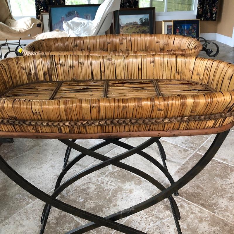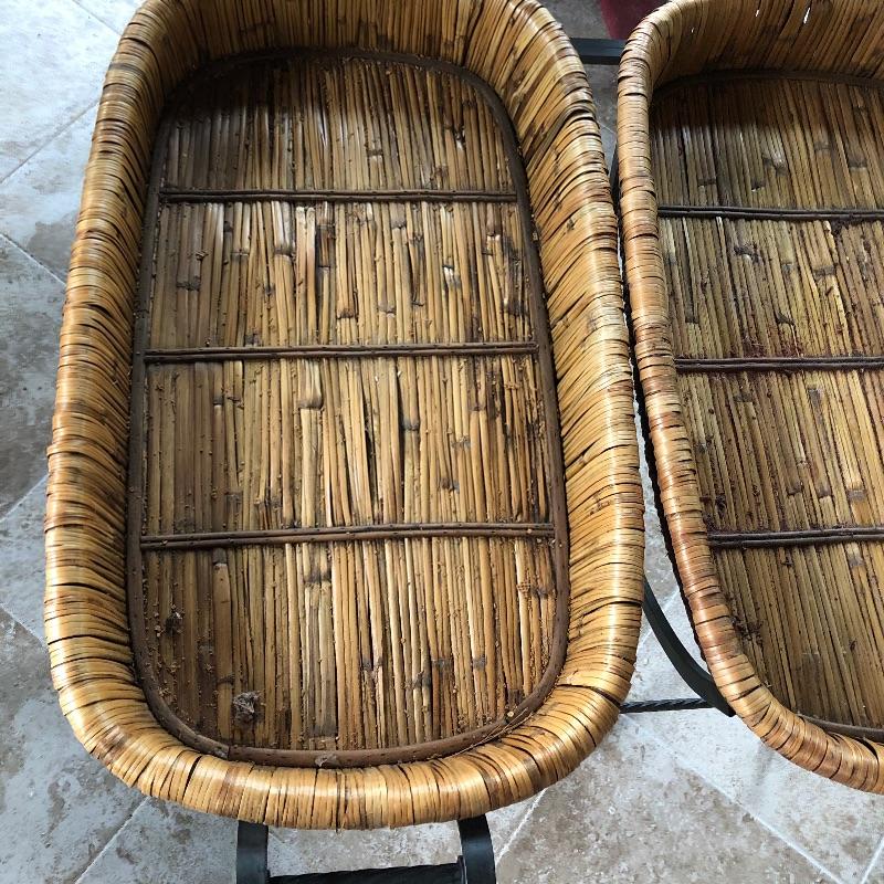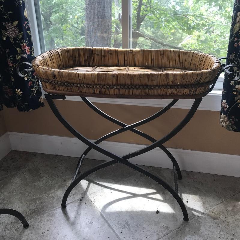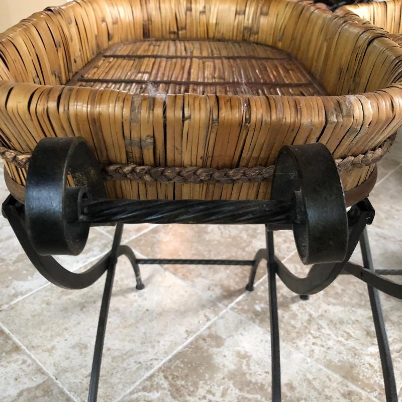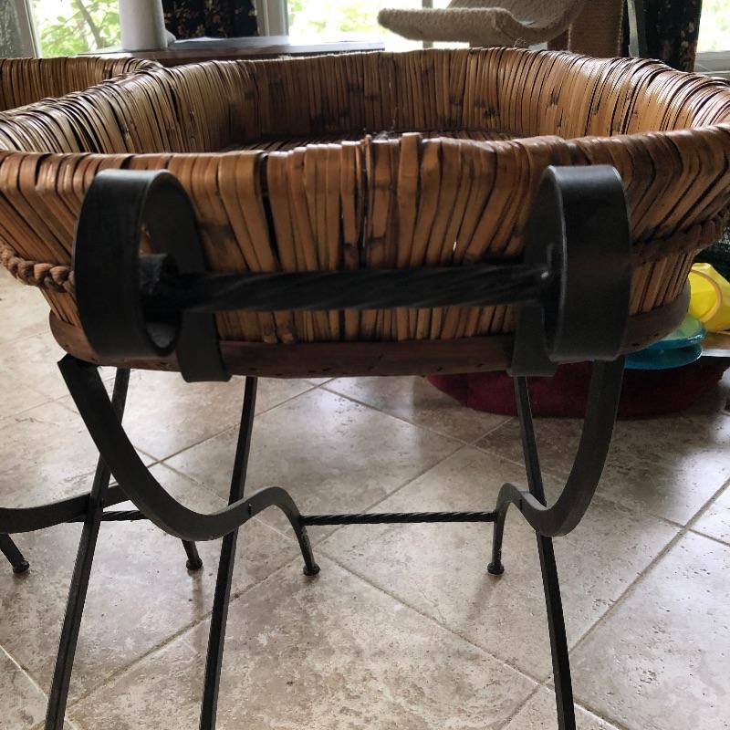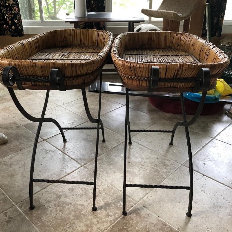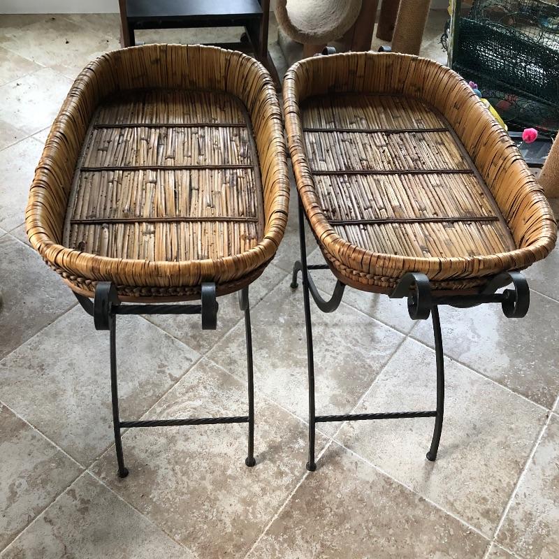 Looking for a place to display your plants? This lot has got you covered! This lot includes two flat baskets resting on light weight metal stands. One basket and tray measures about 33.5" x 28" x 16.5". The stands show a nice criss-cross design. They are fixed into place and do not fold up. Local pick up only.