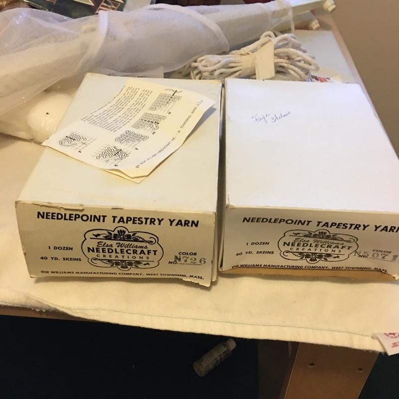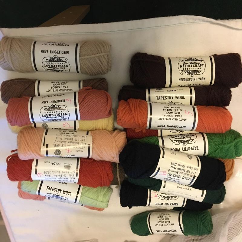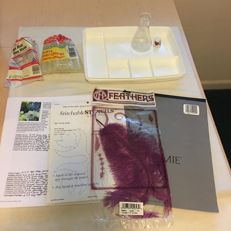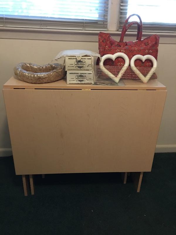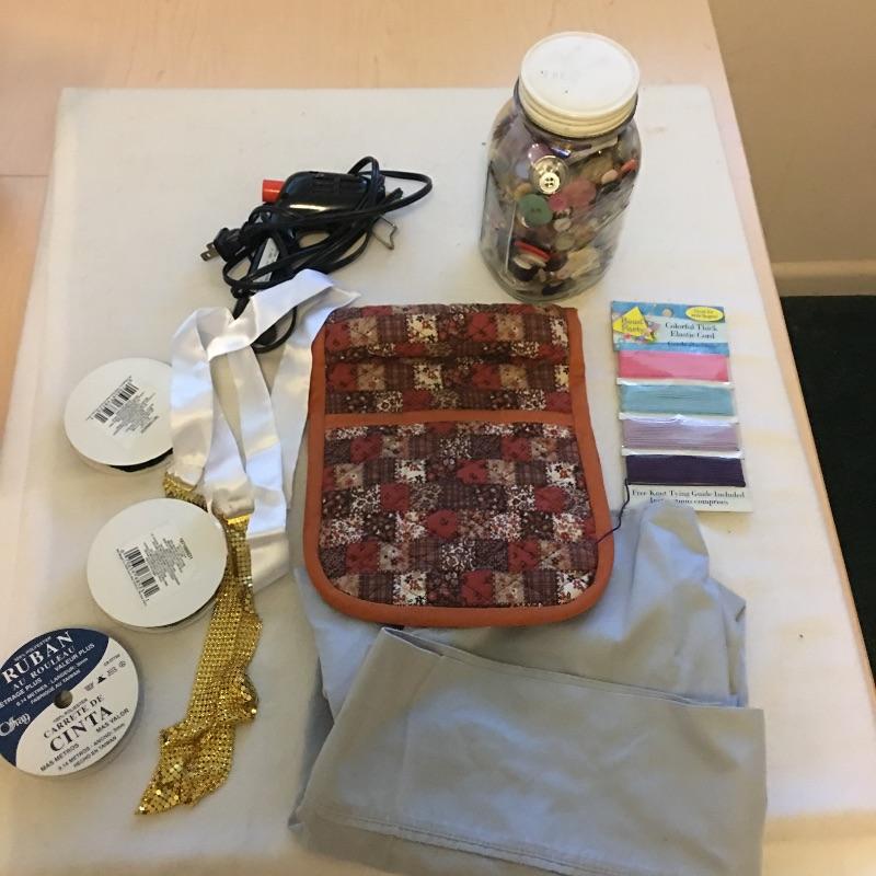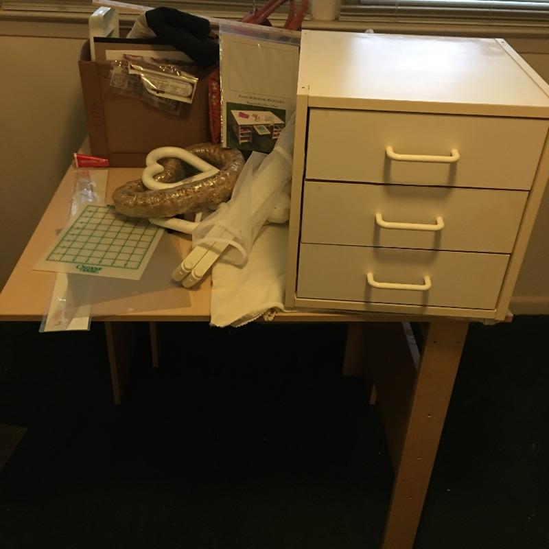 This folding craft table is great for dual purpose room as is it folds down to a small table, but when open is large enough for all your crafting needs. Lot also includes three drawer storage cabinet, yardstick, curved ruler, tote bags, tapestry yarn, ribbon, cutting mats, buttons, glue gun and glue sticks, tote bag, hanging fluorescent light and more. Craft table measures 36” x 59” x 32.5” when open and 36” x 14.5” x 32.5” when closed.