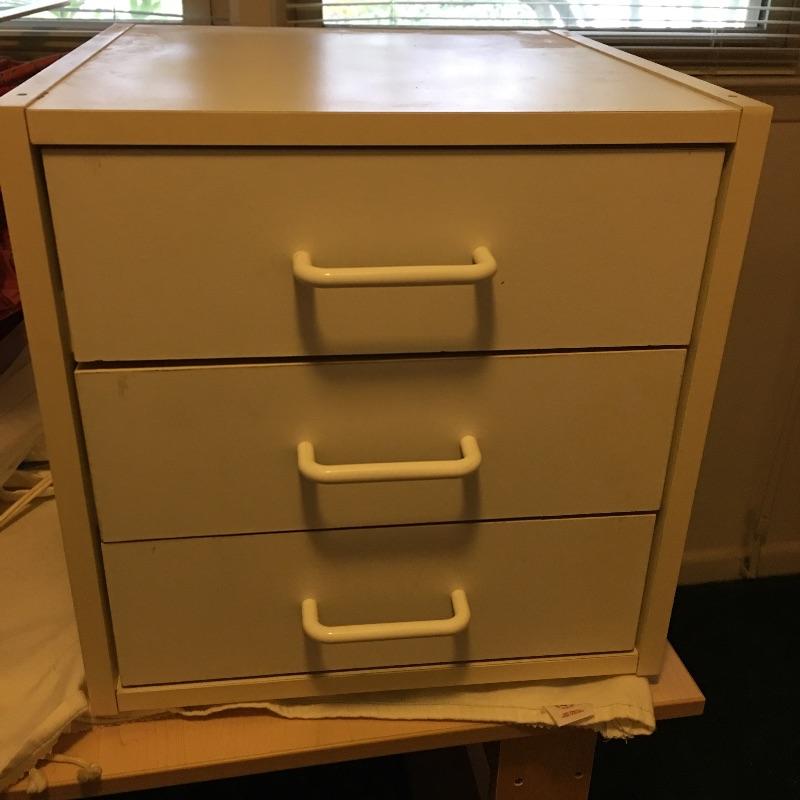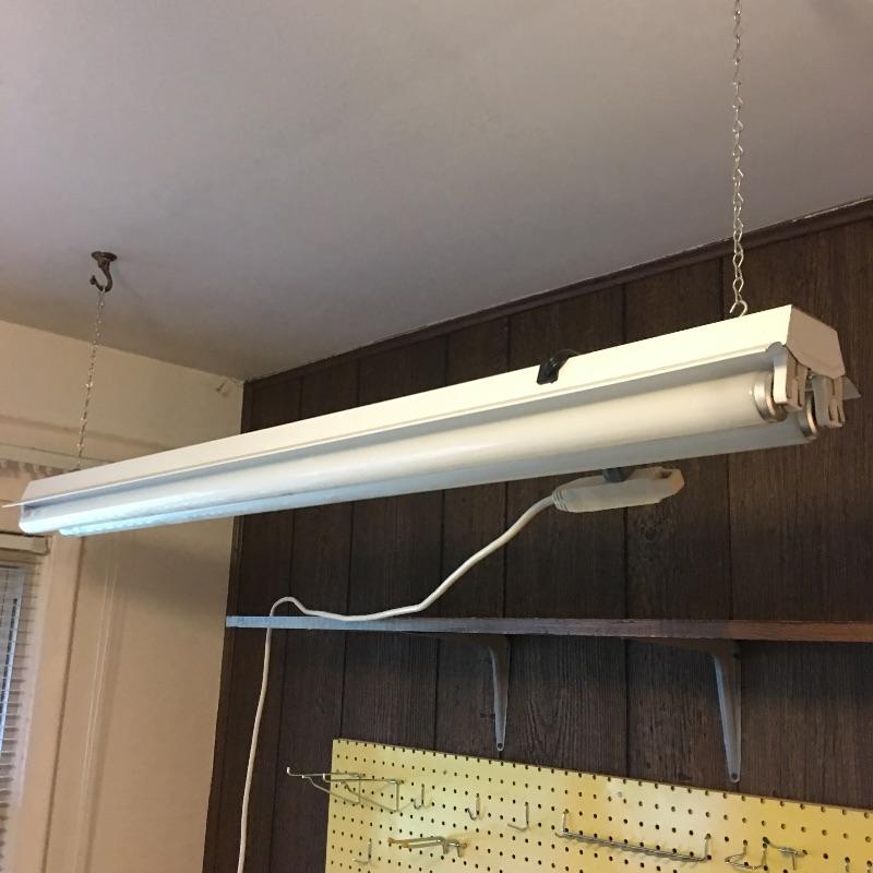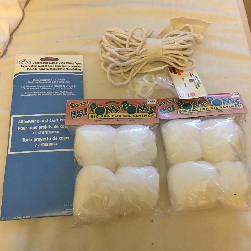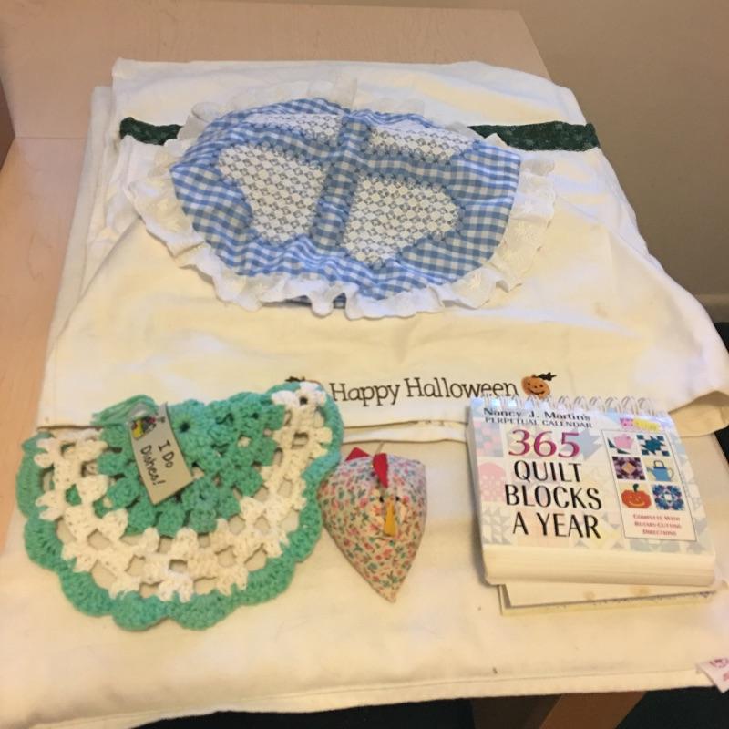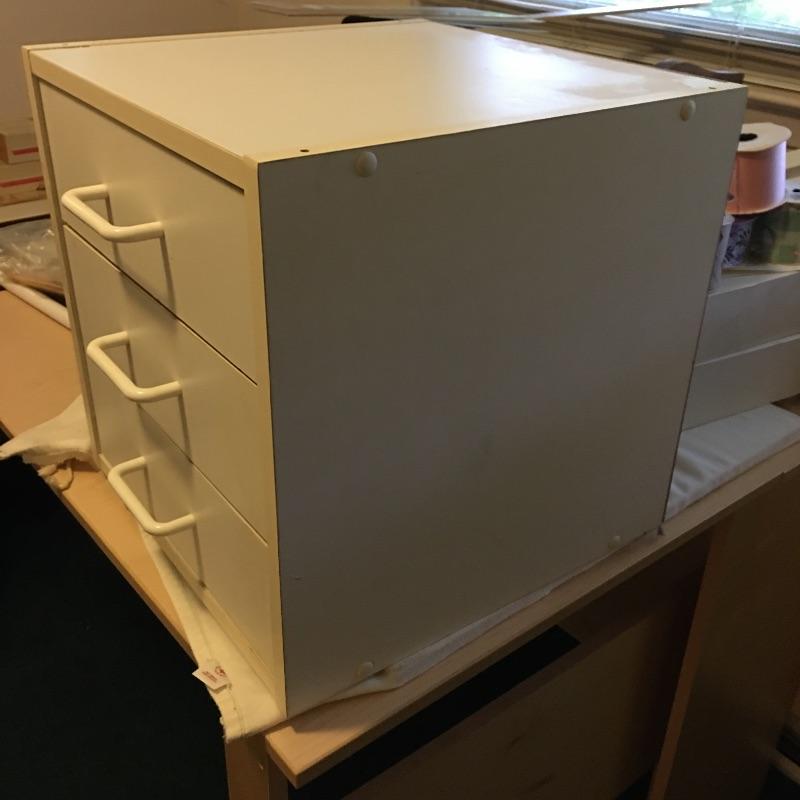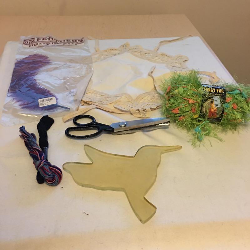 This folding craft table is great for dual purpose room as is it folds down to a small table, but when open is large enough for all your crafting needs. Lot also includes three drawer storage cabinet, yardstick, curved ruler, tote bags, tapestry yarn, ribbon, cutting mats, buttons, glue gun and glue sticks, tote bag, hanging fluorescent light and more. Craft table measures 36” x 59” x 32.5” when open and 36” x 14.5” x 32.5” when closed.