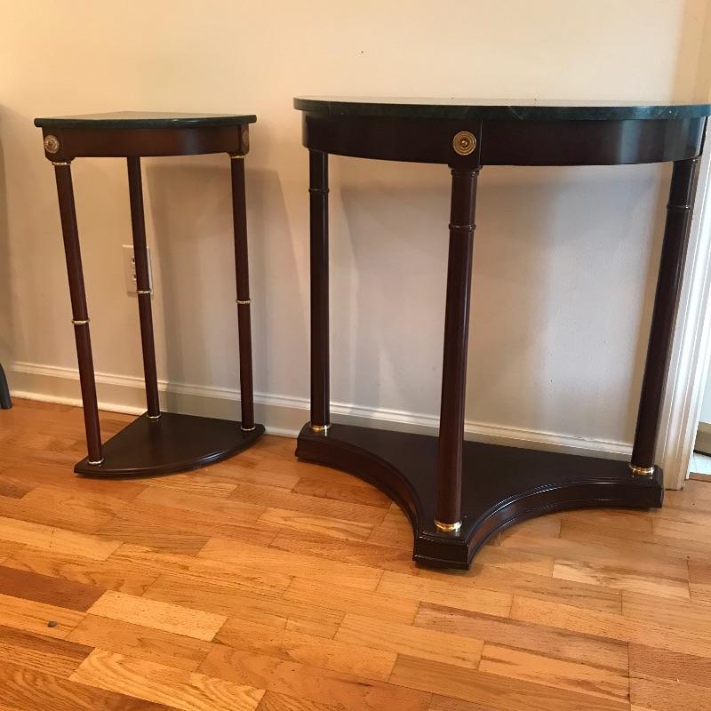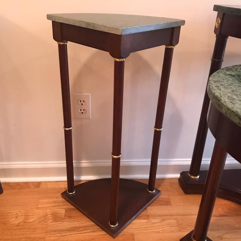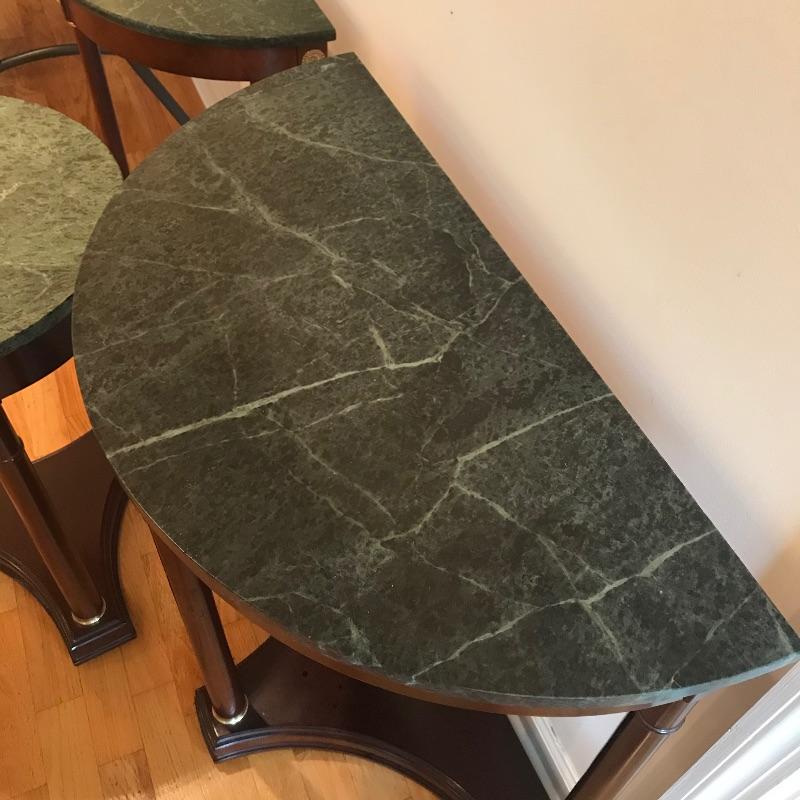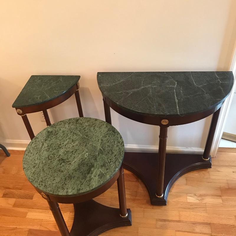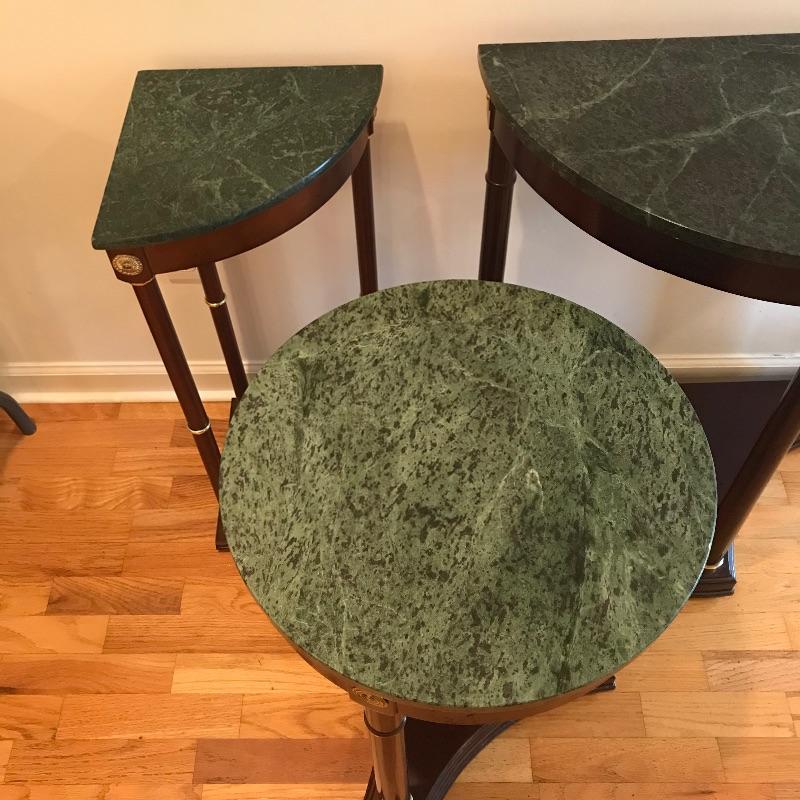 Stunning dark cherry colored wood tables with deep green stone-like tops. Each table has golden colored accents and can tie any room together with elegance. We’ve included one corner table, a semi-circle table perfect for an entry way and a round side table. The round table has a slightly lighter green color than the corner and semi-circle tables. The semi circle table measures approximately 28.75” x 14.5” x 29.5”. All stone-like tops are attached securely to table bases. Local pick up only.
