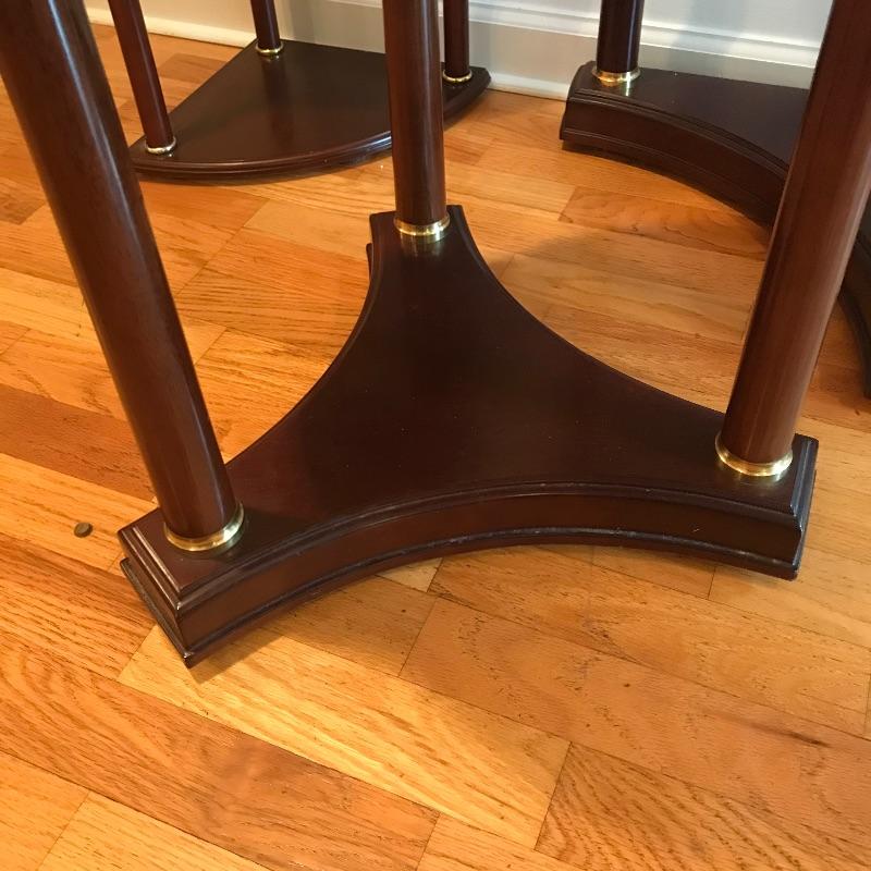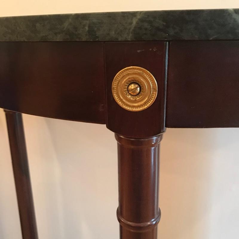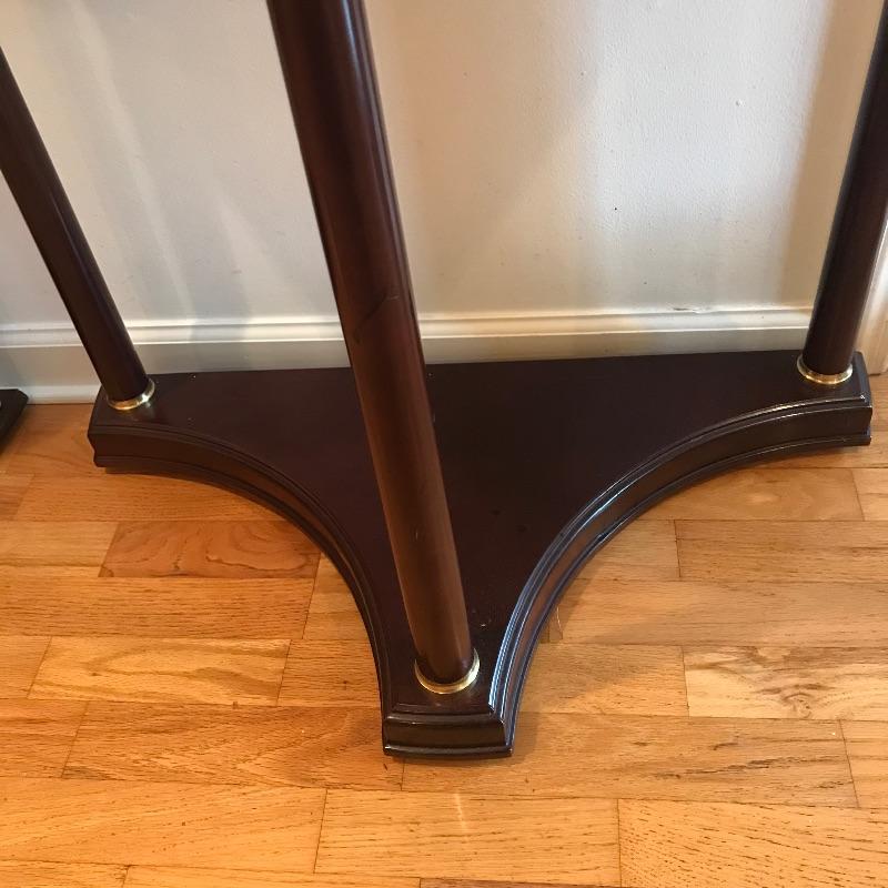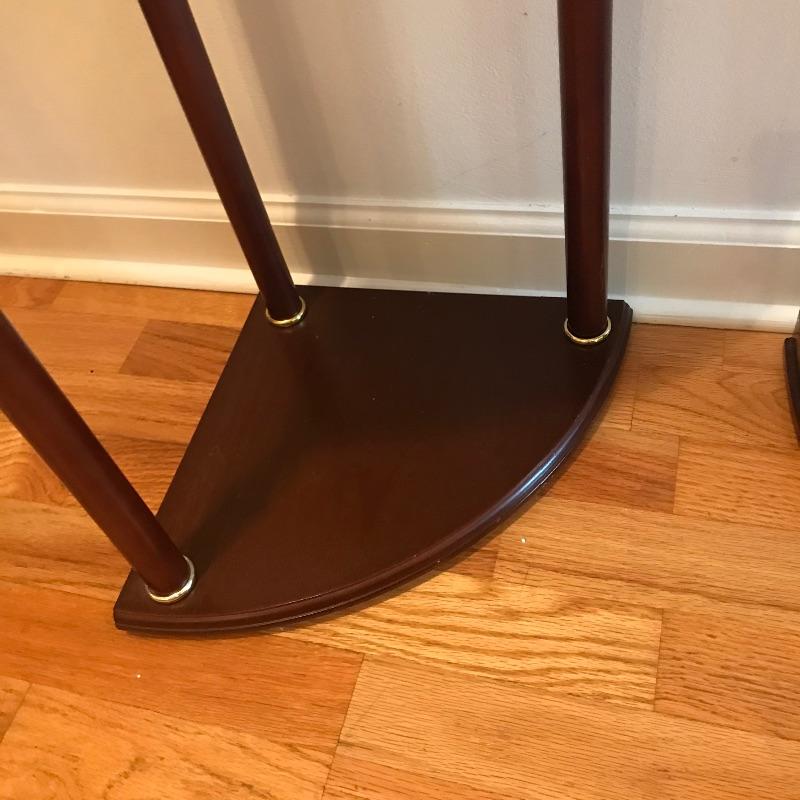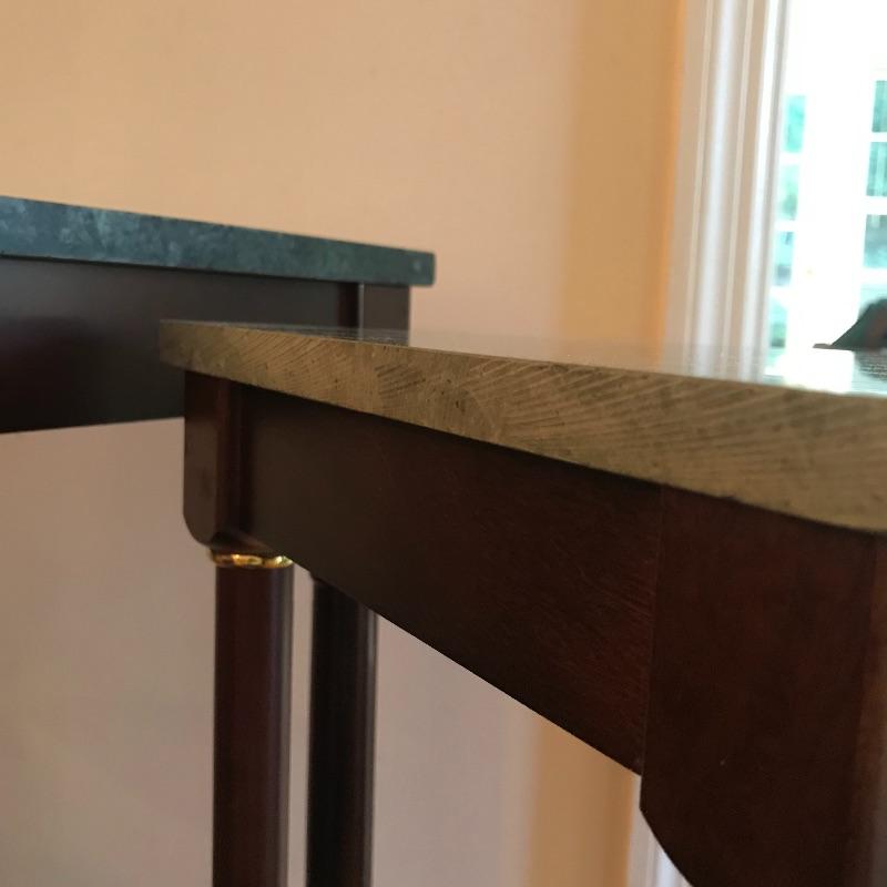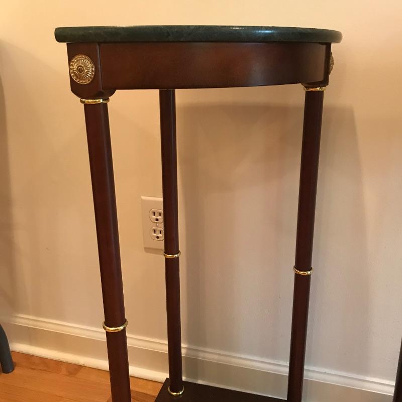 Stunning dark cherry colored wood tables with deep green stone-like tops. Each table has golden colored accents and can tie any room together with elegance. We’ve included one corner table, a semi-circle table perfect for an entry way and a round side table. The round table has a slightly lighter green color than the corner and semi-circle tables. The semi circle table measures approximately 28.75” x 14.5” x 29.5”. All stone-like tops are attached securely to table bases. Local pick up only.