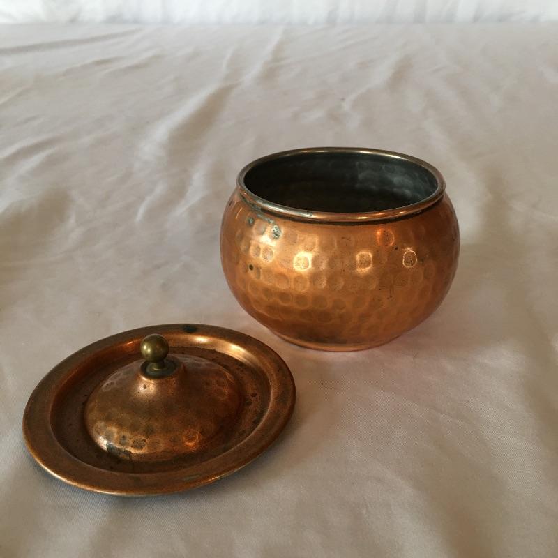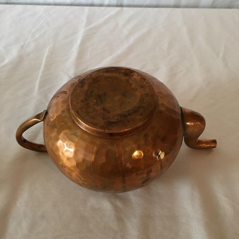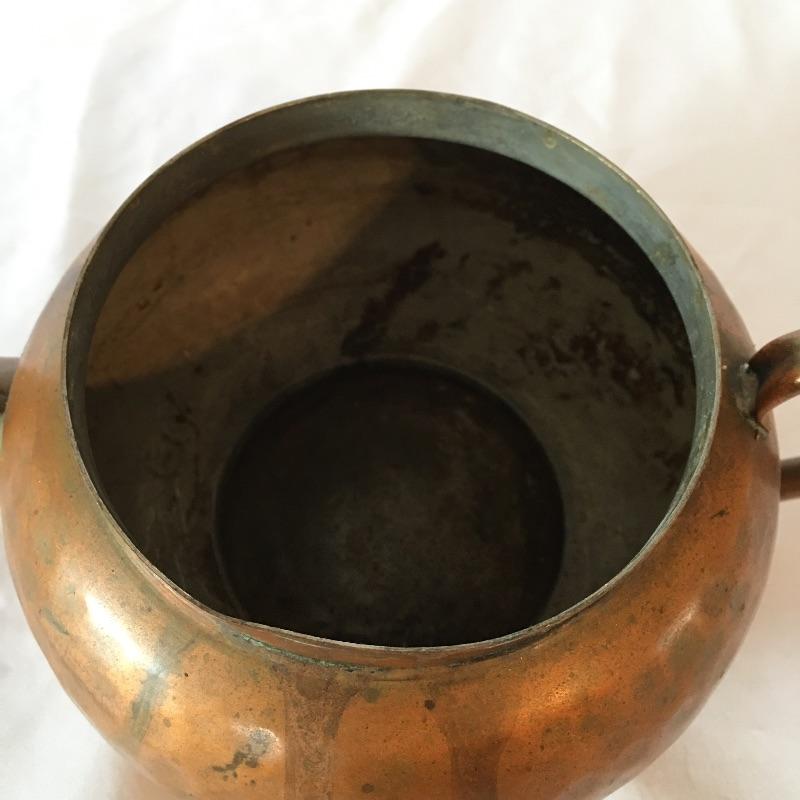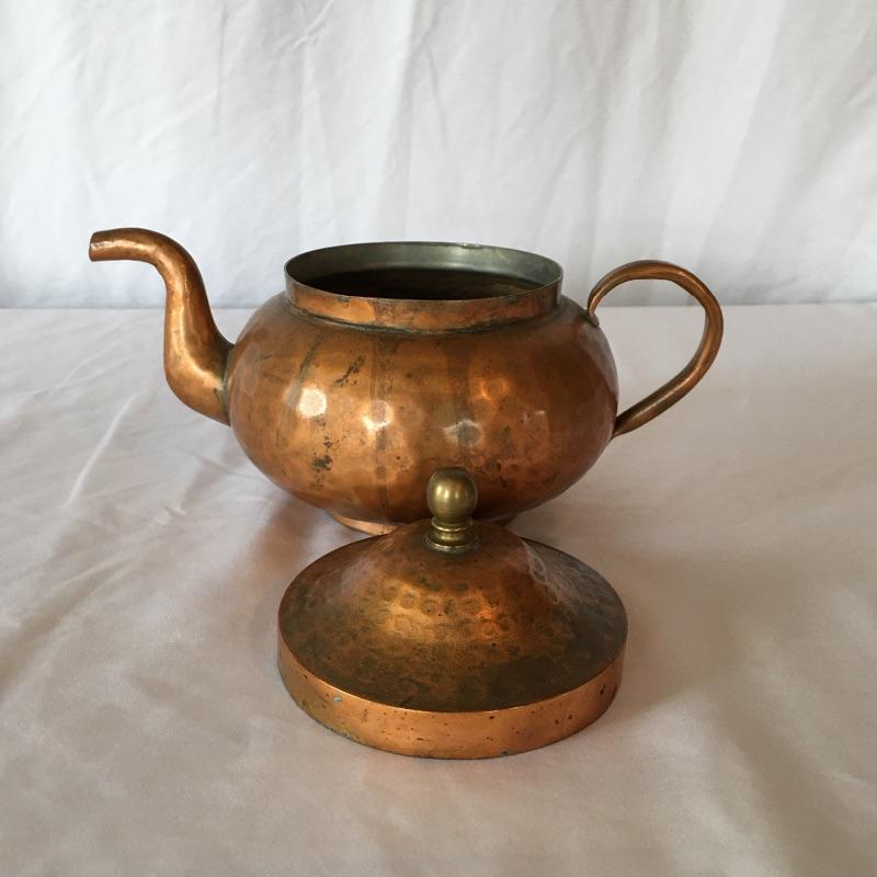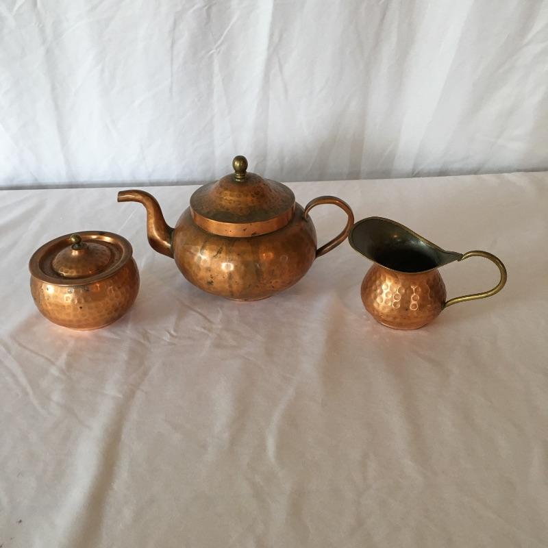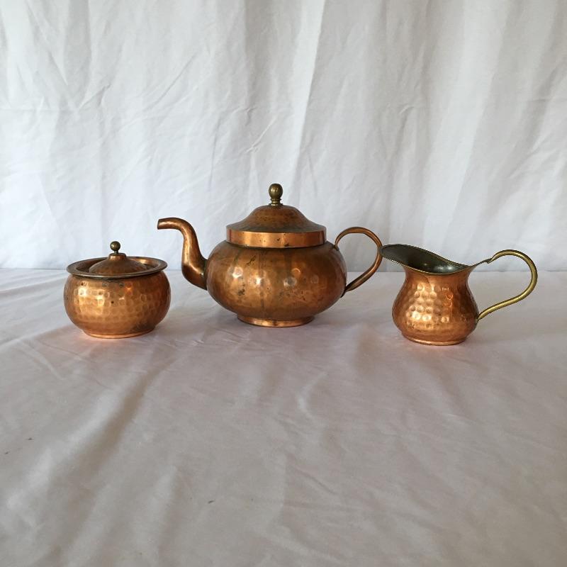 Stunning hammered copper tea set includes teapot with lid, sugar bowl with lid and creamer. All pieces are lined with tin. Get ready for a relaxing pot of tea with this stunning hammered copper tea set. Teapot measures 5.25” x 9” x 5.5”.
