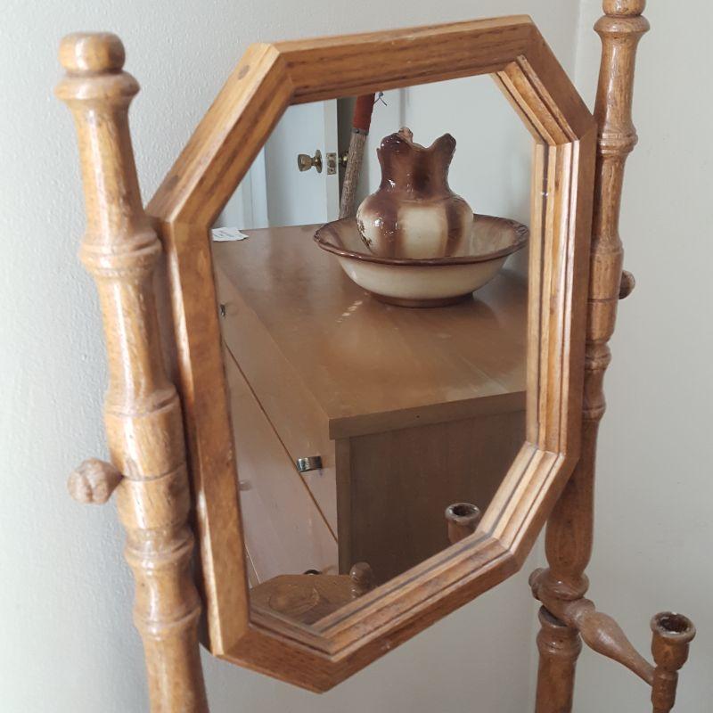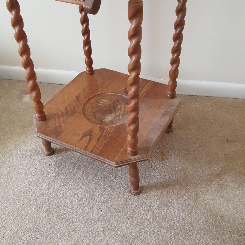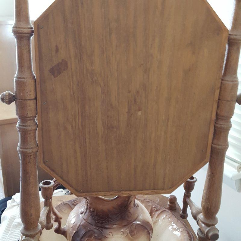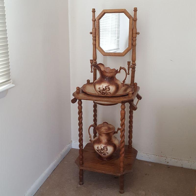 A beautiful decoration piece for your bedroom or bath. This wooden wash-stand includes a pitcher (10x8x11), bowl (16x15x5) and an urn (12x8x12). These pieces appear to be in good shape. The wooden table is losing some of its finish as seen in picture, and the legs are a little wobbly. The wash-stand is 18x18x53 inches. Local pickup only.