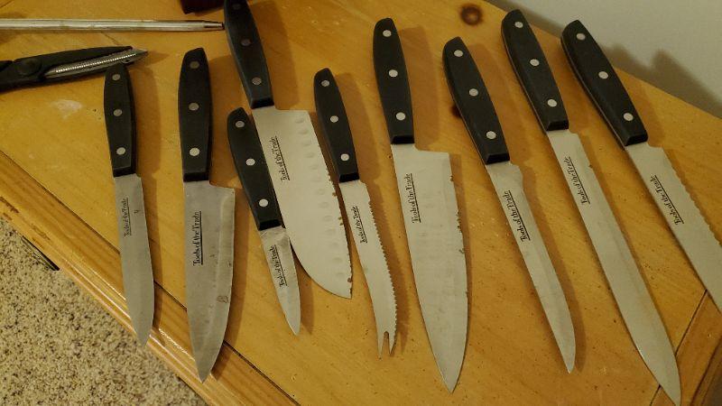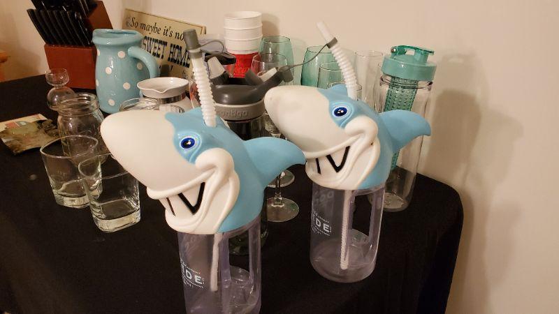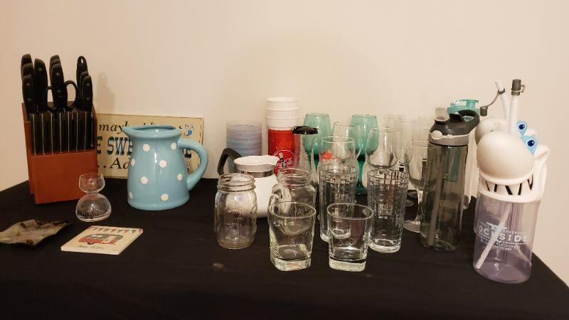 Glassware, Corningware tea kettle with no lid, shark travel mugs, Tools of the Trade knife set, and more.